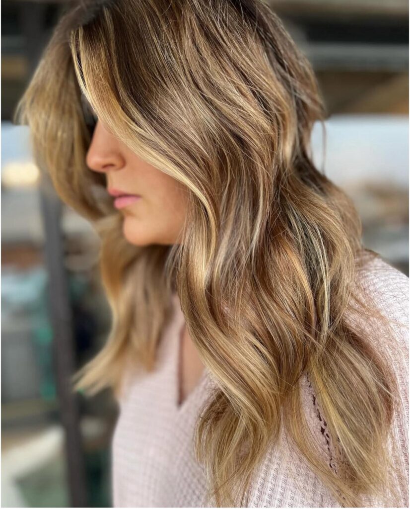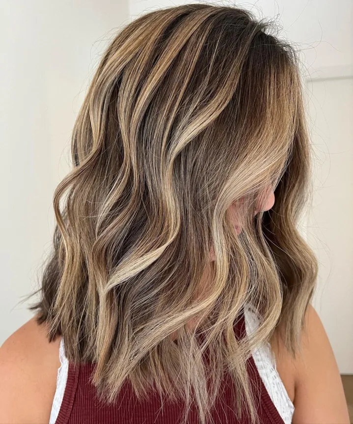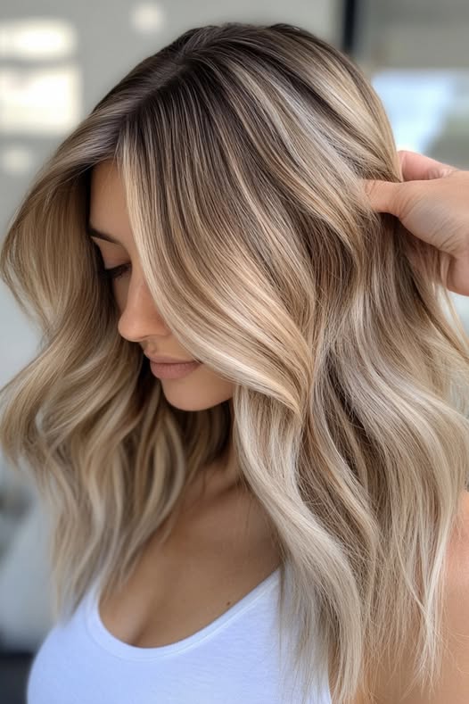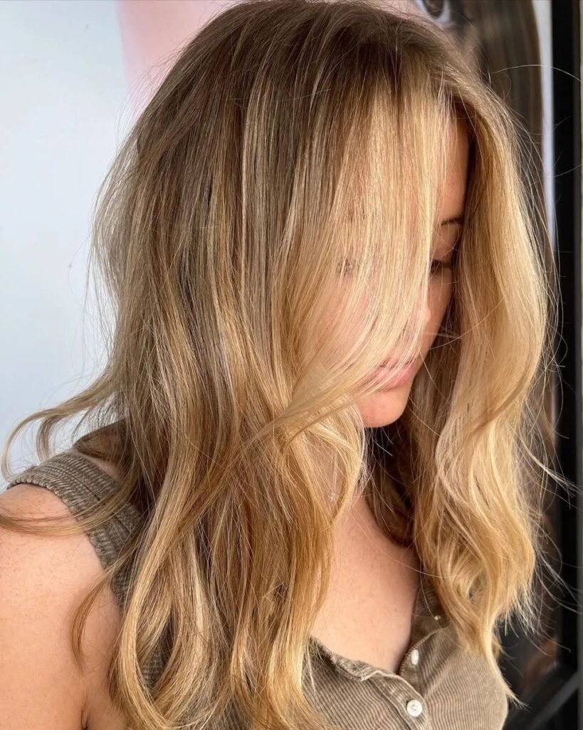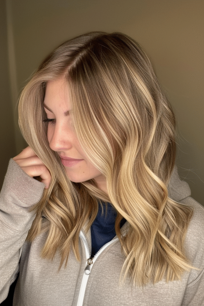 This look blends warm blonde highlights with soft sandy lowlights to create depth and contrast. The combination gives hair a naturally sunlit effect that looks full of movement and texture.