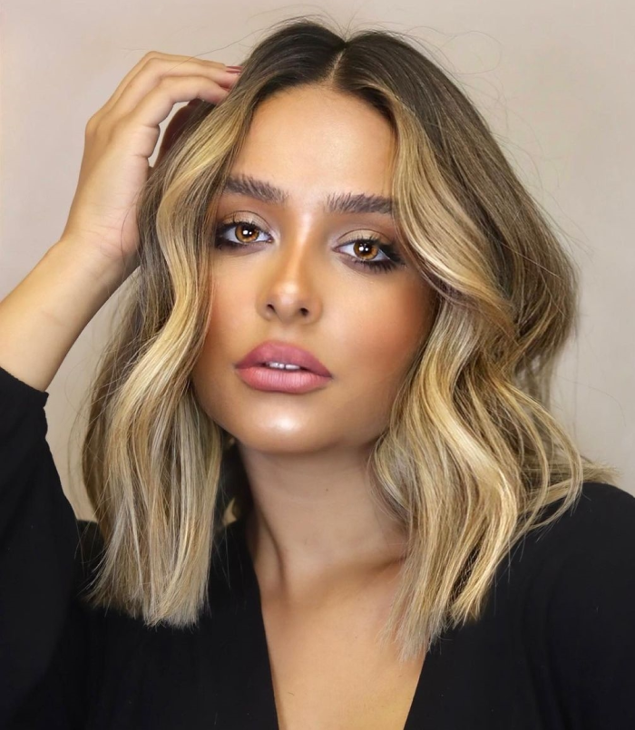 This look keeps the hair’s brunette base intact while weaving in honey and caramel blonde highlights for a multidimensional effect. It’s a great low-maintenance option for brunettes who want to add lightness without fully committing to blonde.