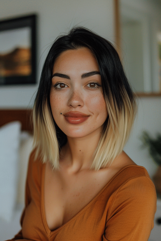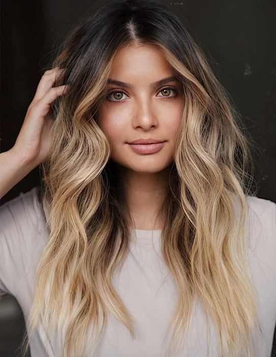 Blonde ombre on dark hair is a trendy, low-maintenance style that creates a smooth transition from deep brunette roots to lighter blonde ends. It’s a great way to experiment with blonde shades without fully committing to all-over color.