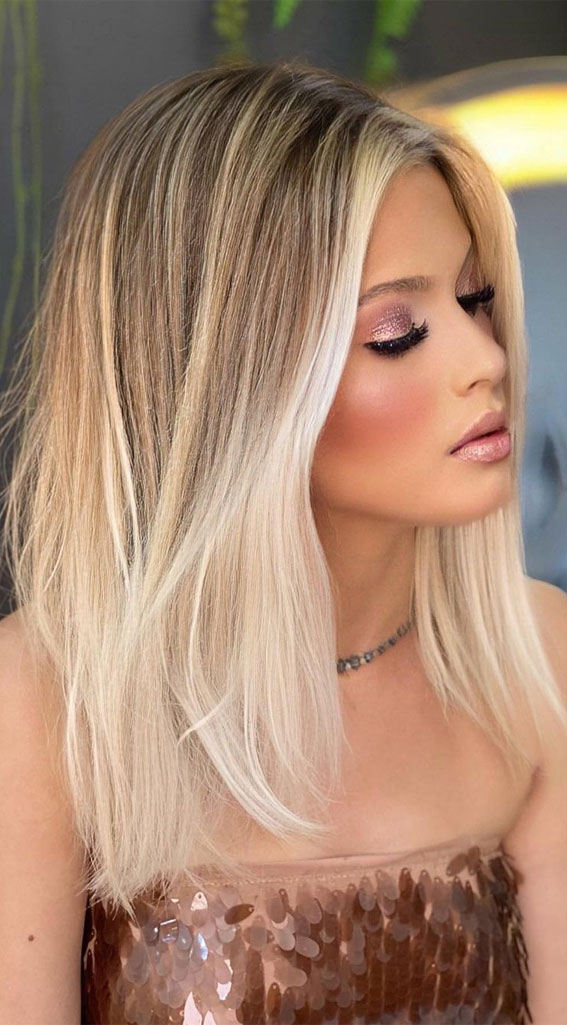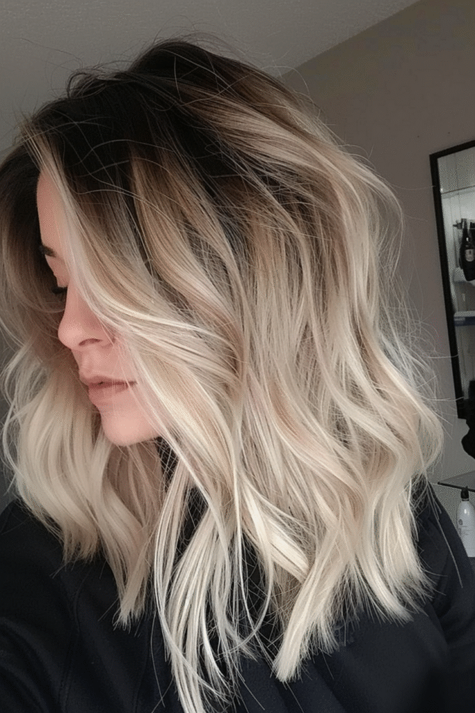 This look blends bold platinum lengths with darker roots, creating a striking contrast that’s both edgy and practical. The darker roots give the hair depth while also making the color easier to maintain compared to a full platinum look.