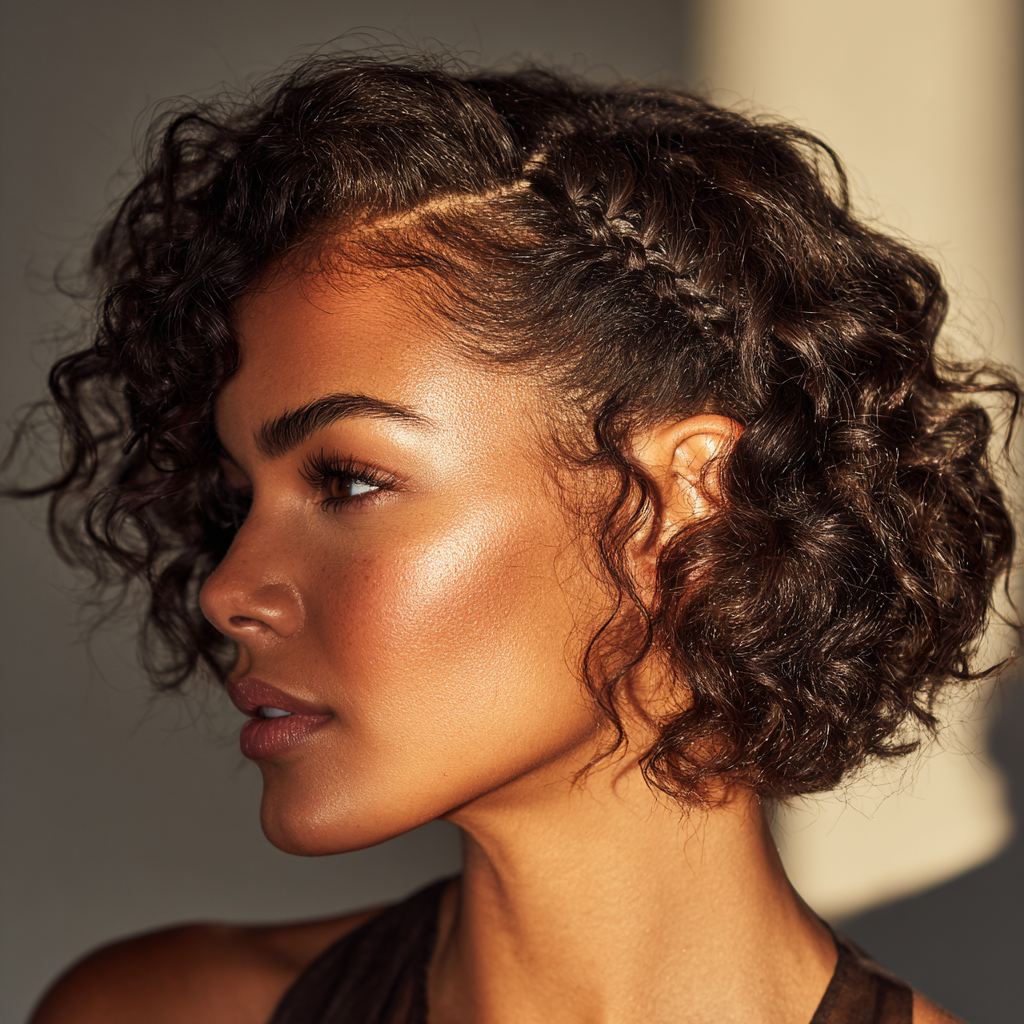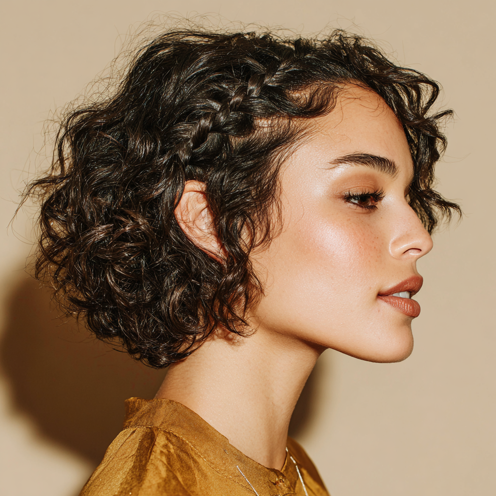 A curly bob with a braided side adds a trendy twist to classic curls. The small braid not only adds detail but also highlights the texture and volume of your curls beautifully.