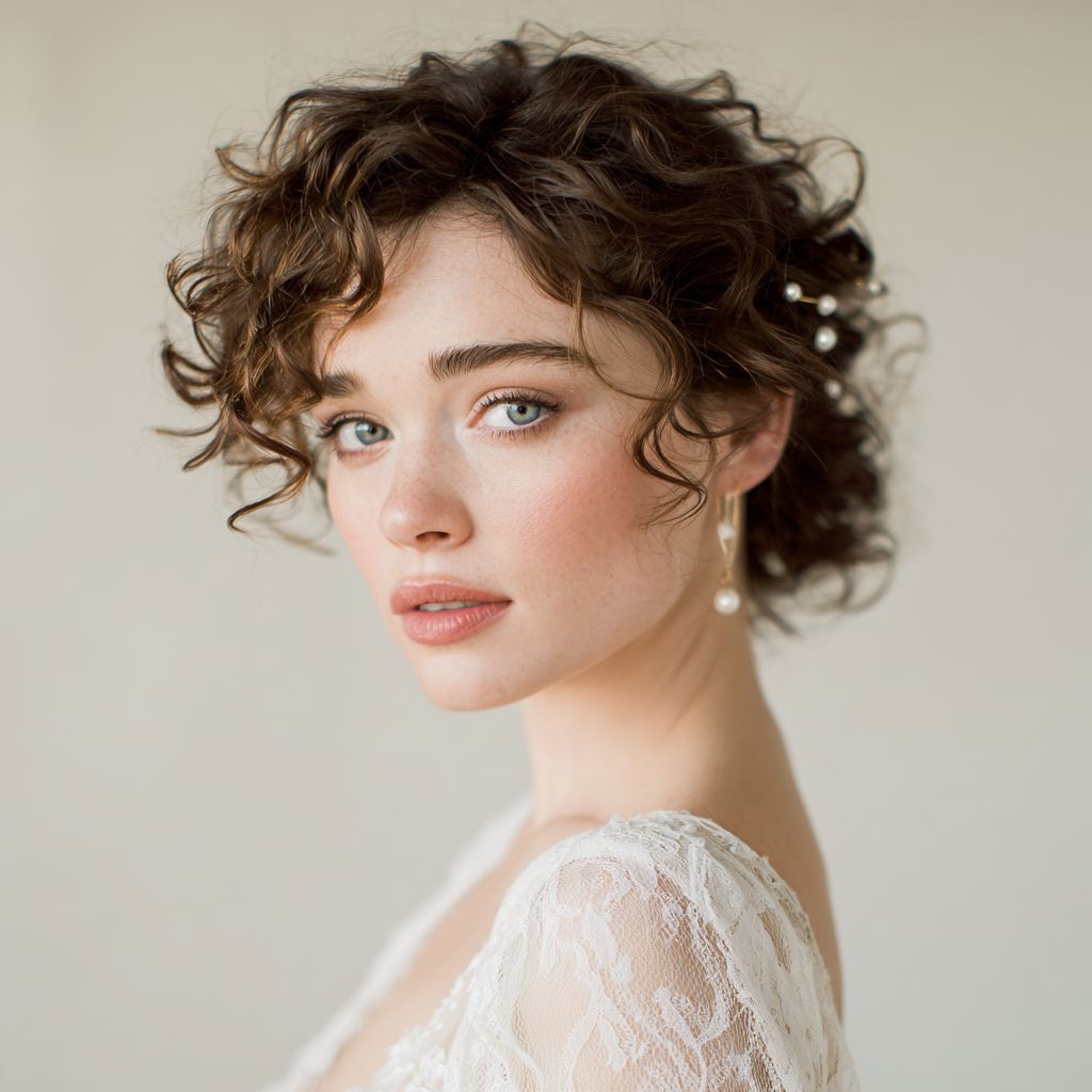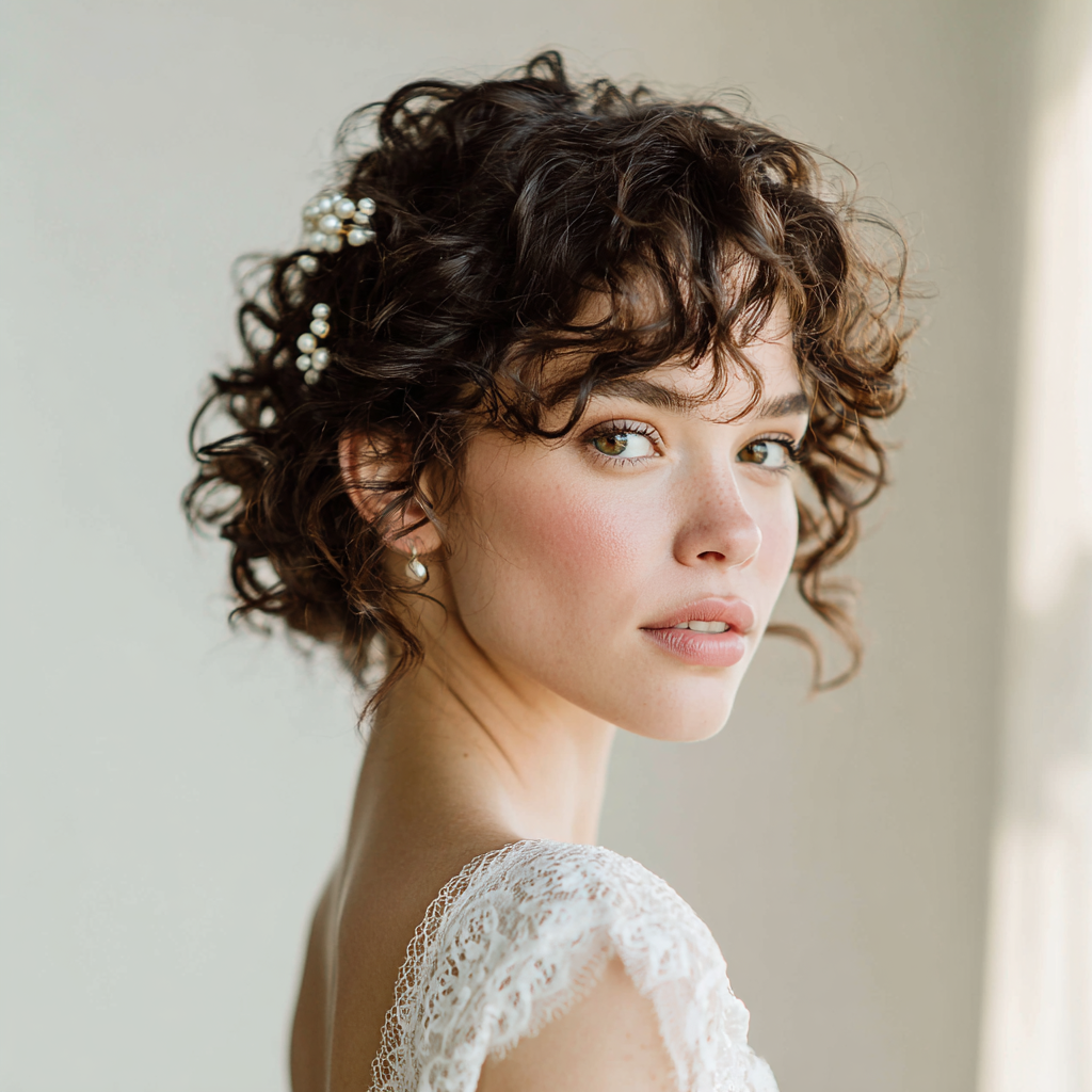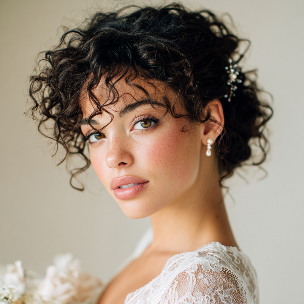 A curly updo for short hair is a romantic choice for weddings or special occasions. Soft curls pinned at the back create volume and elegance while keeping the look graceful and timeless.