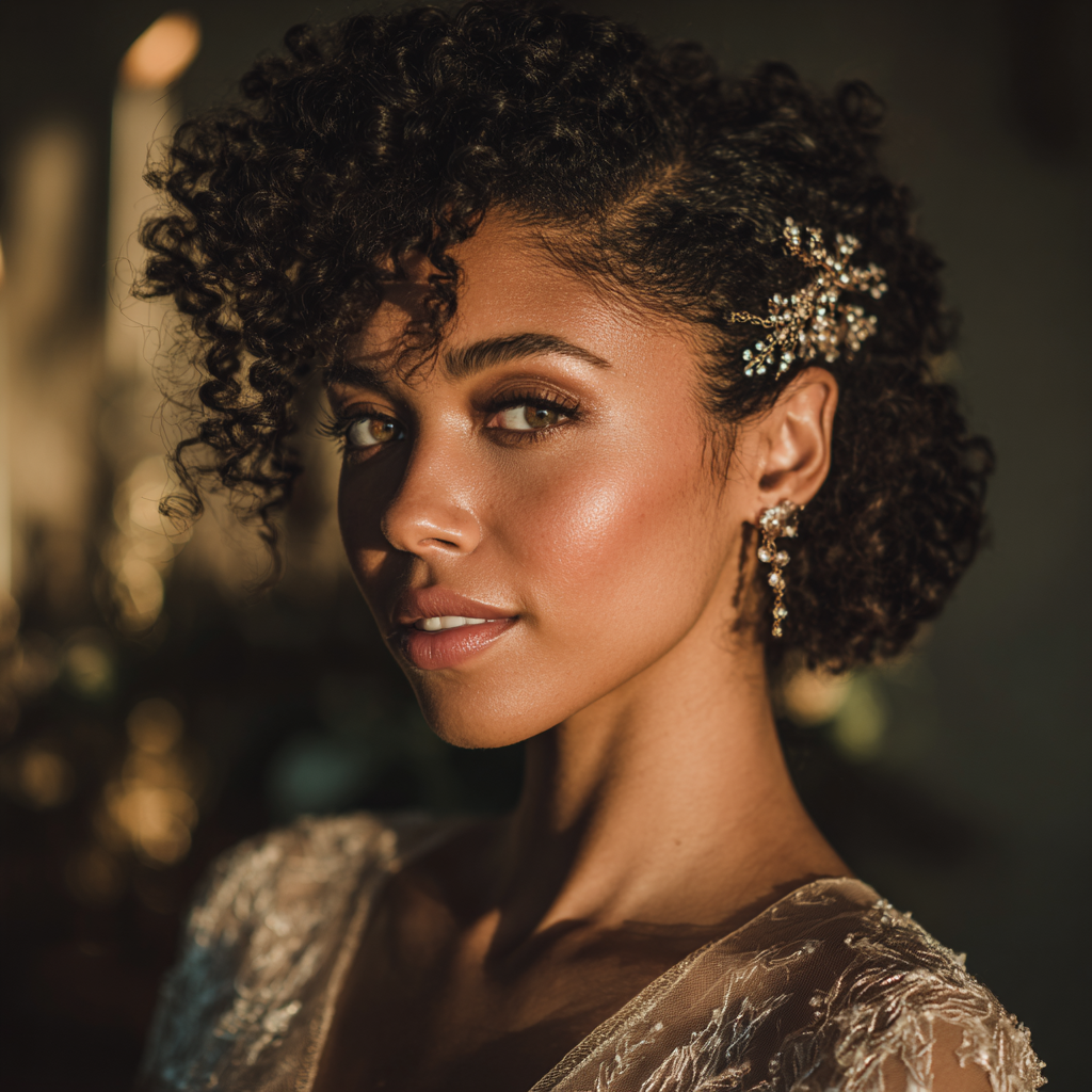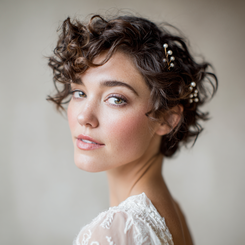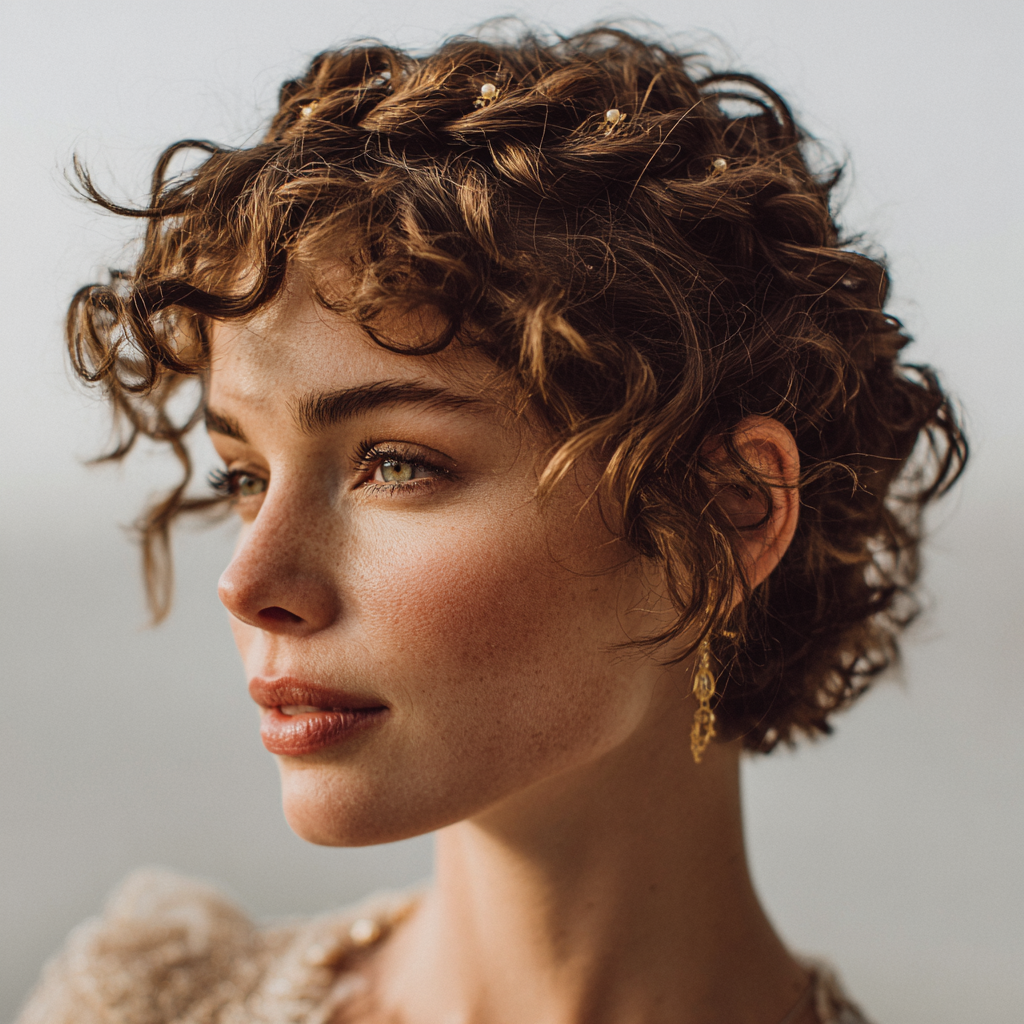 A curly updo for short hair is a romantic choice for weddings or special occasions. Soft curls pinned at the back create volume and elegance while keeping the look graceful and timeless.