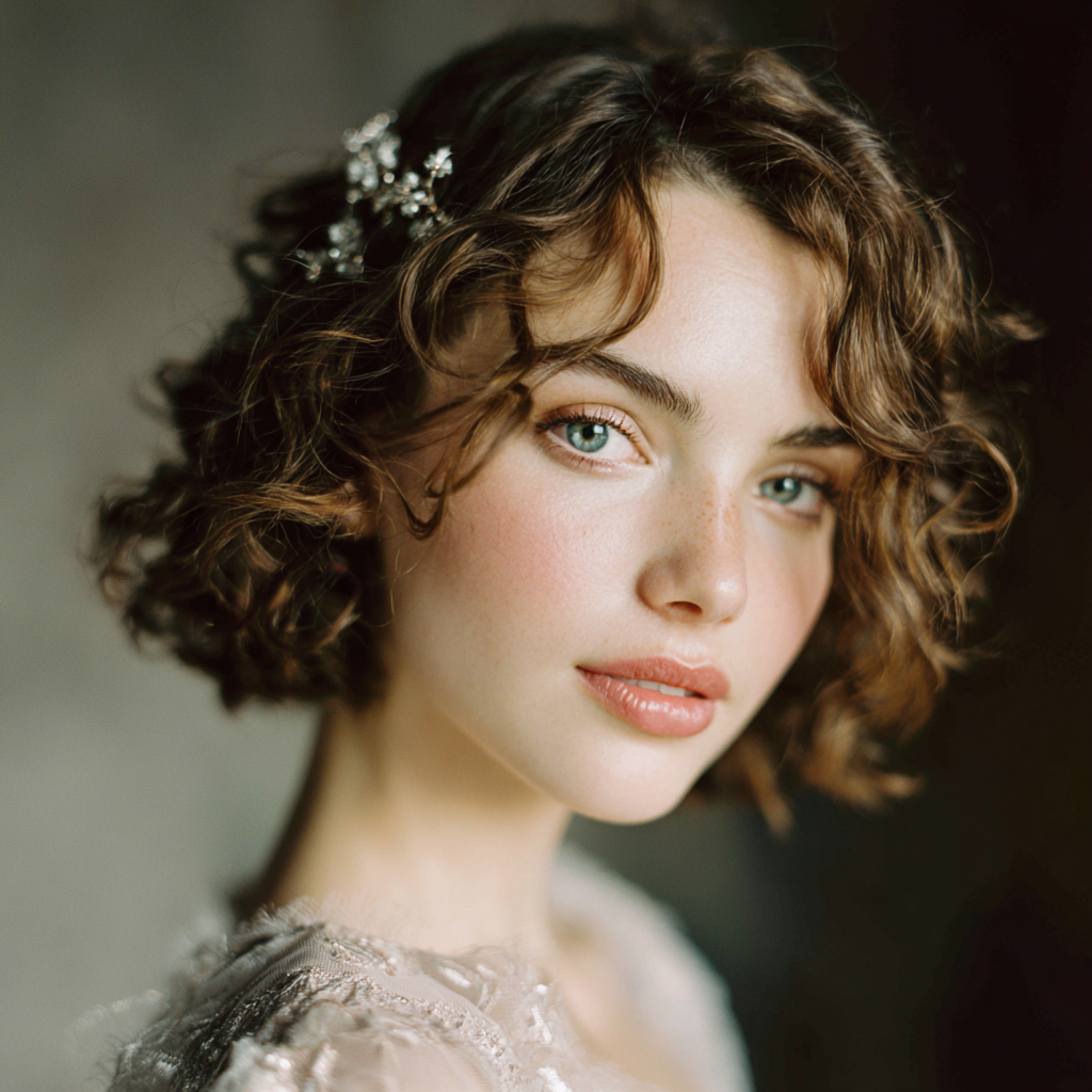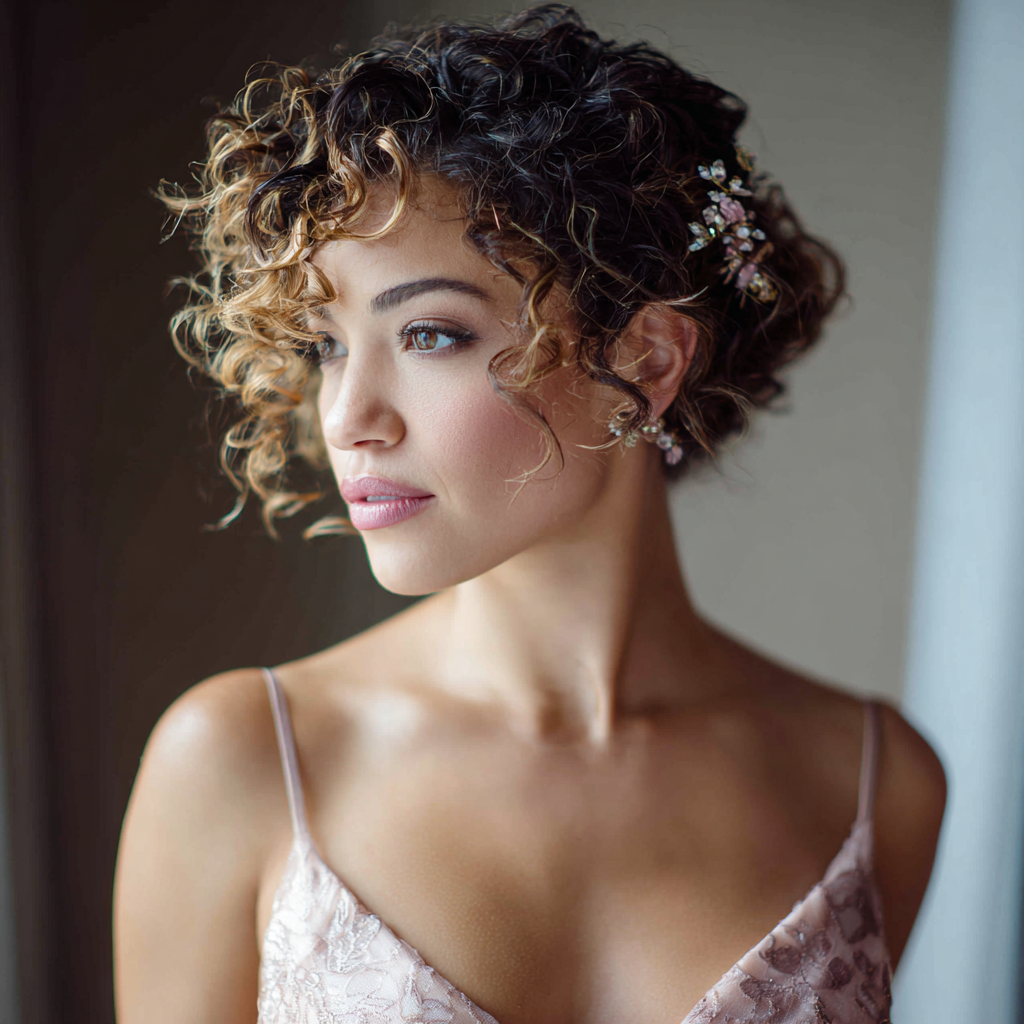 An elegant curly low bun brings a romantic, timeless touch to short curls. It’s ideal for weddings or formal events, offering a soft, graceful appearance with gentle volume.