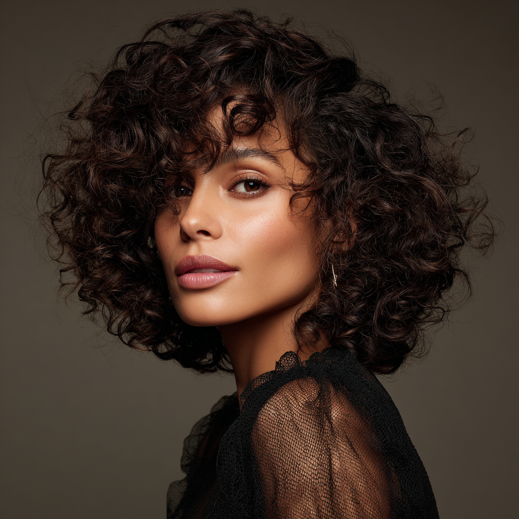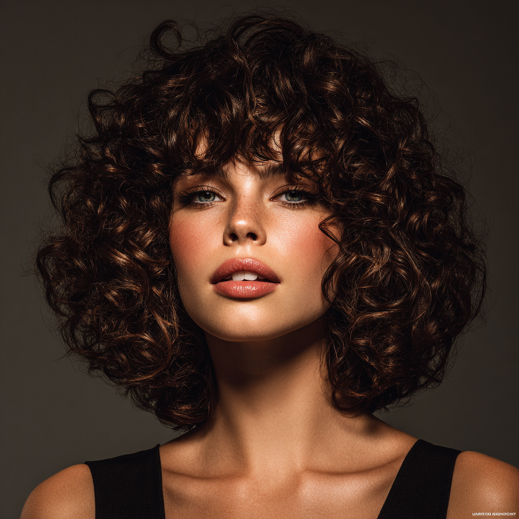 The voluminous curly lob offers the perfect balance between short and long. With its bouncy, defined curls and shoulder-length cut, it frames the face beautifully and adds instant sophistication.