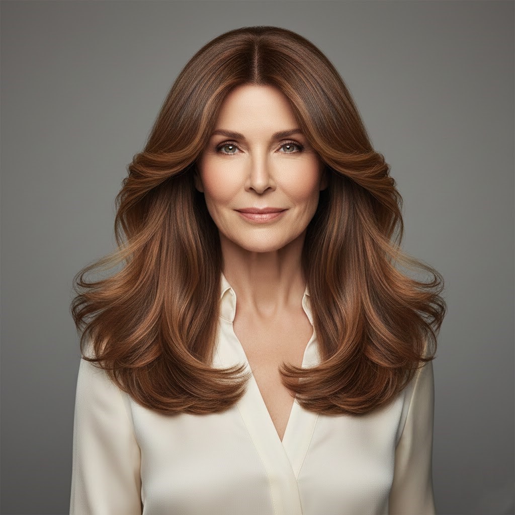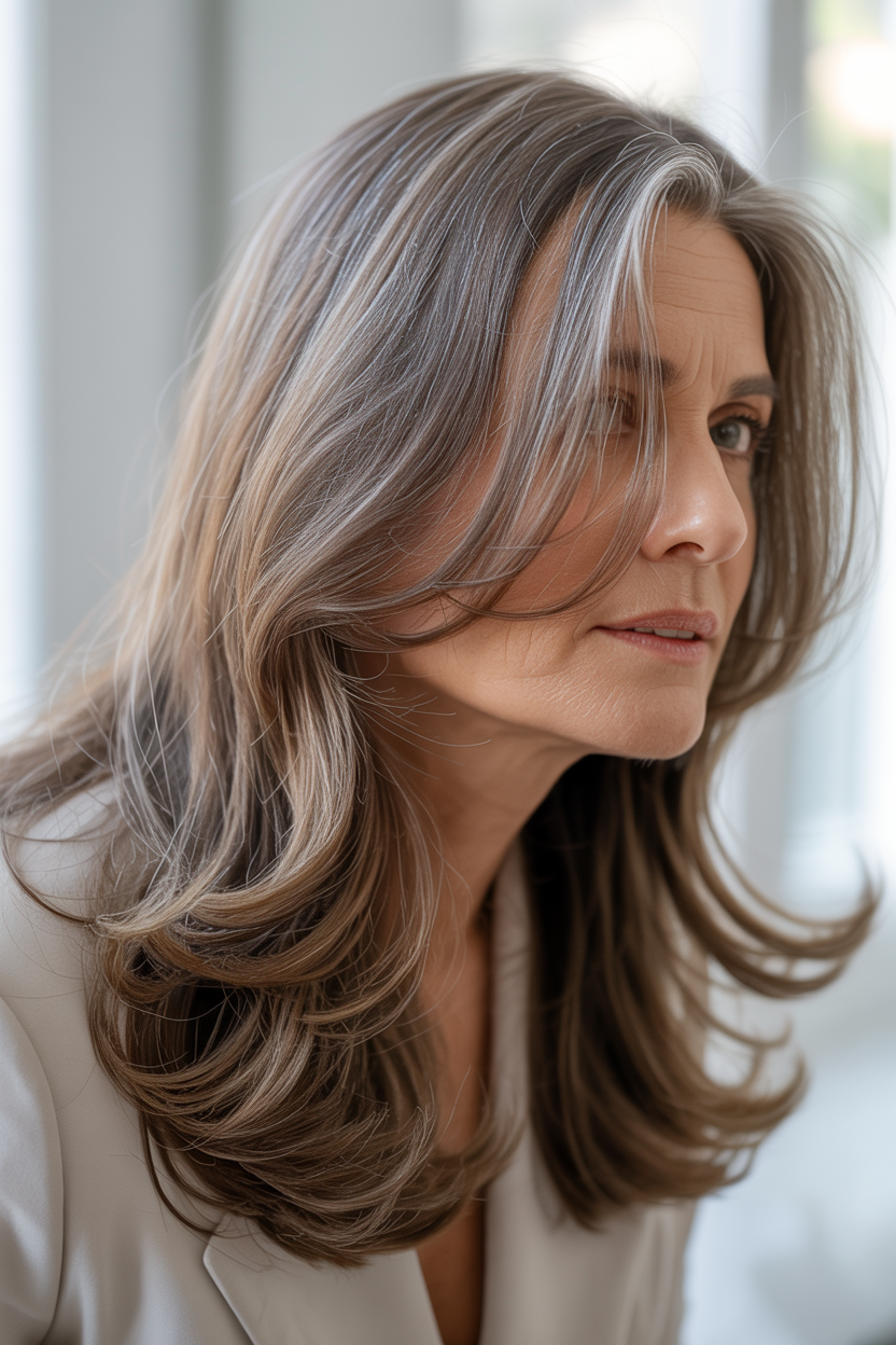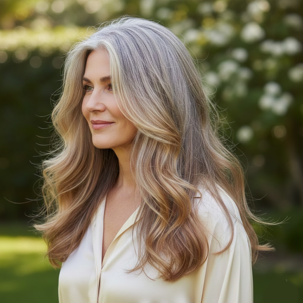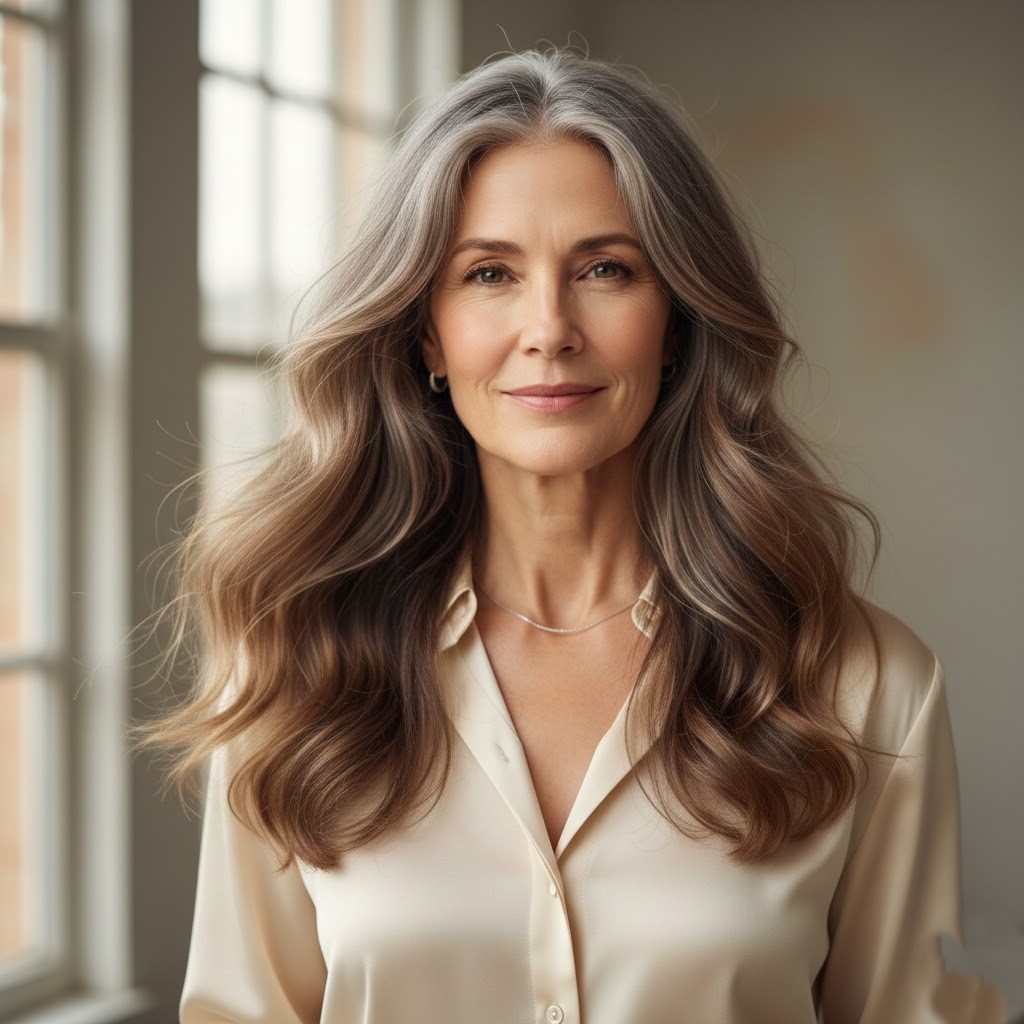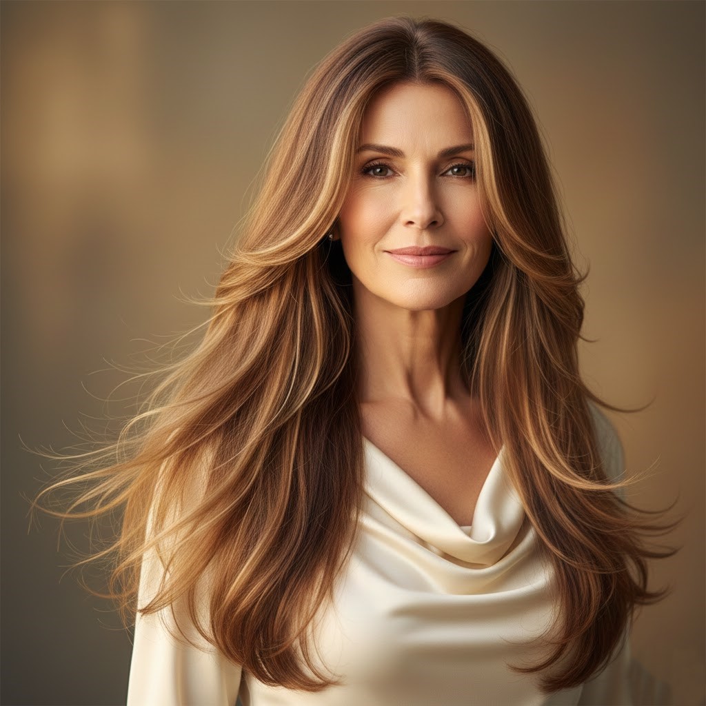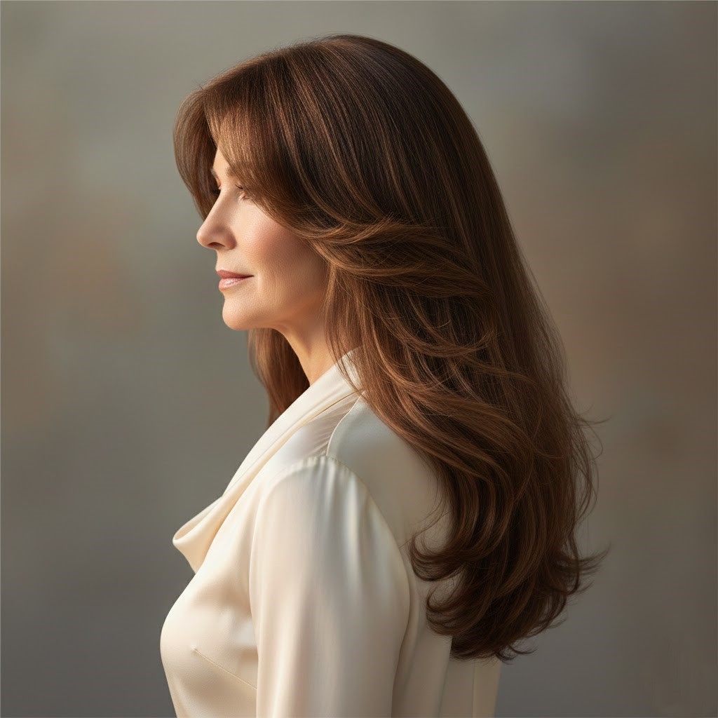 This style is ideal for mature women wanting long hair that feels modern and fresh.