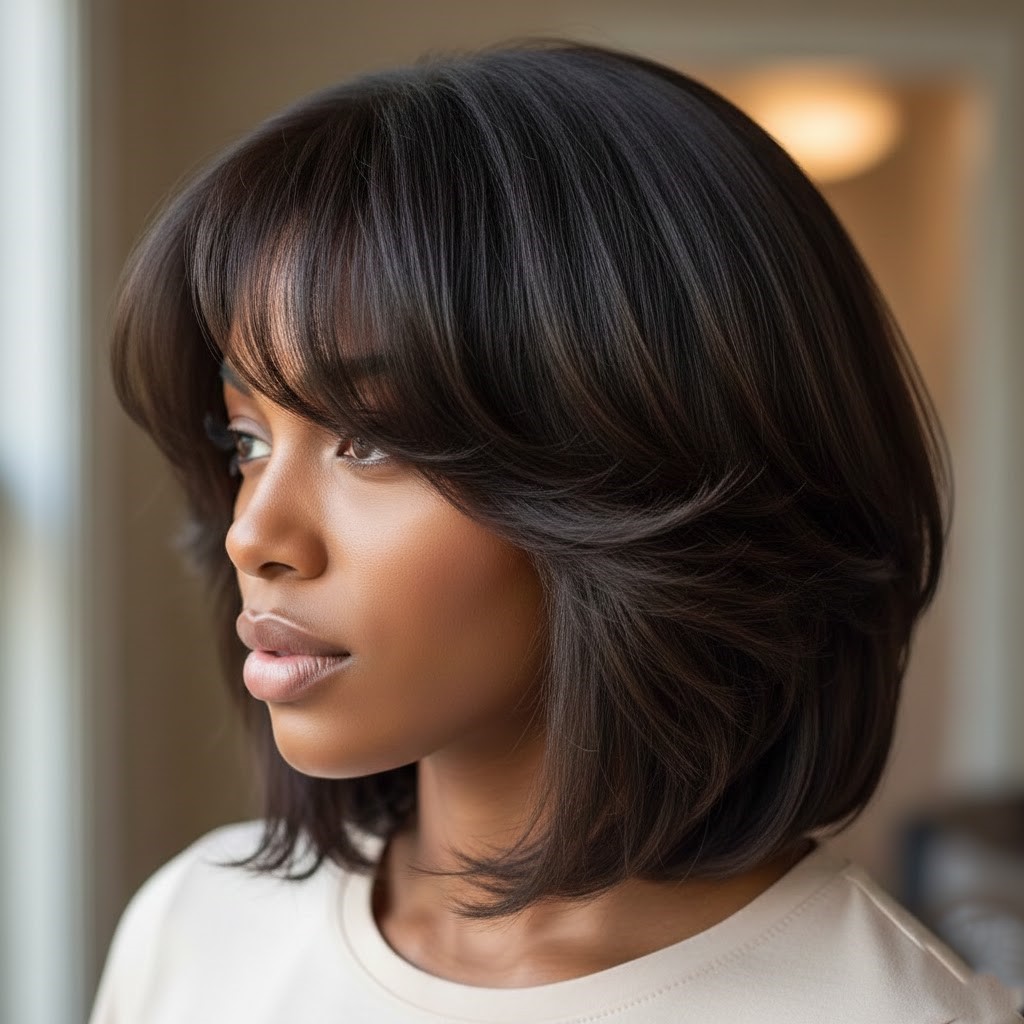 A layered bob with side-swept bangs combines movement and dimension. The layers prevent the bob from looking too heavy, while the bangs add softness to the face.