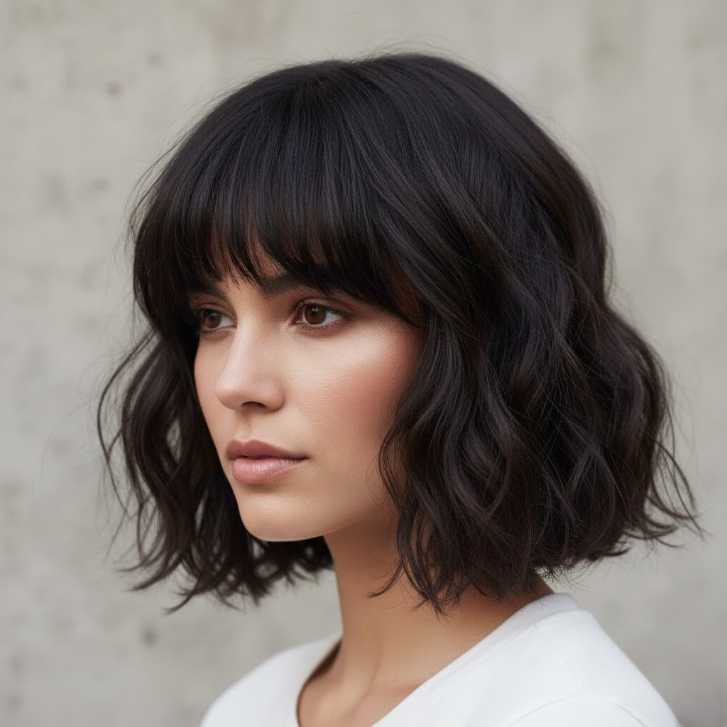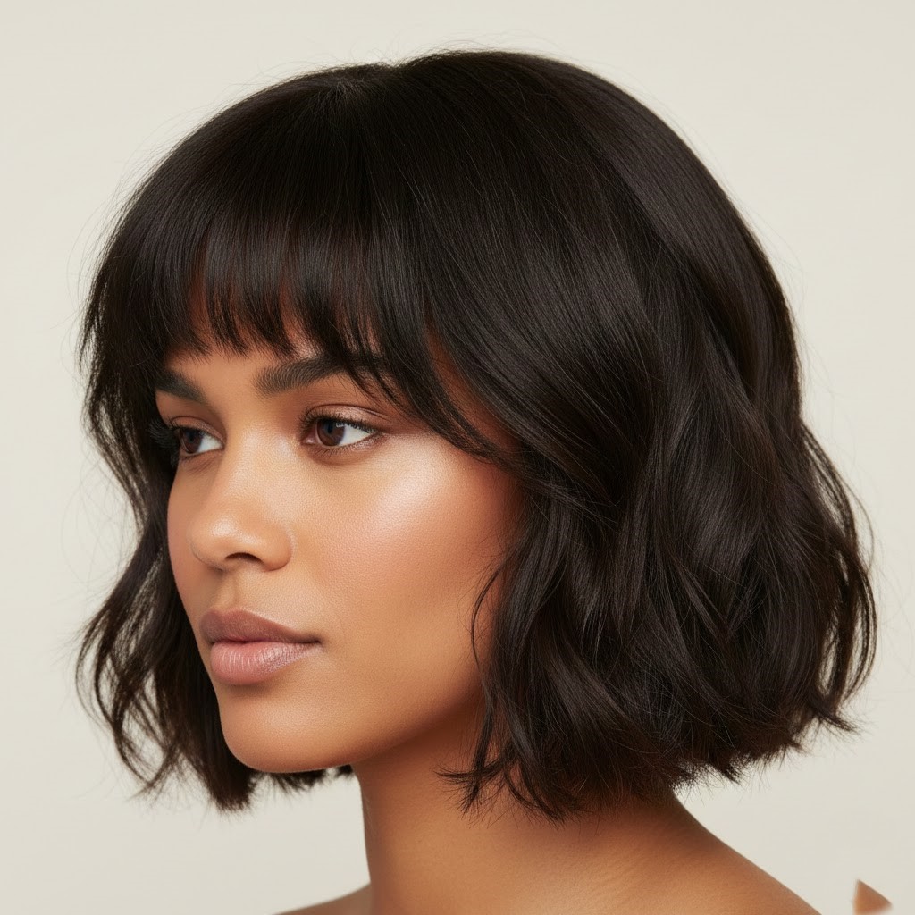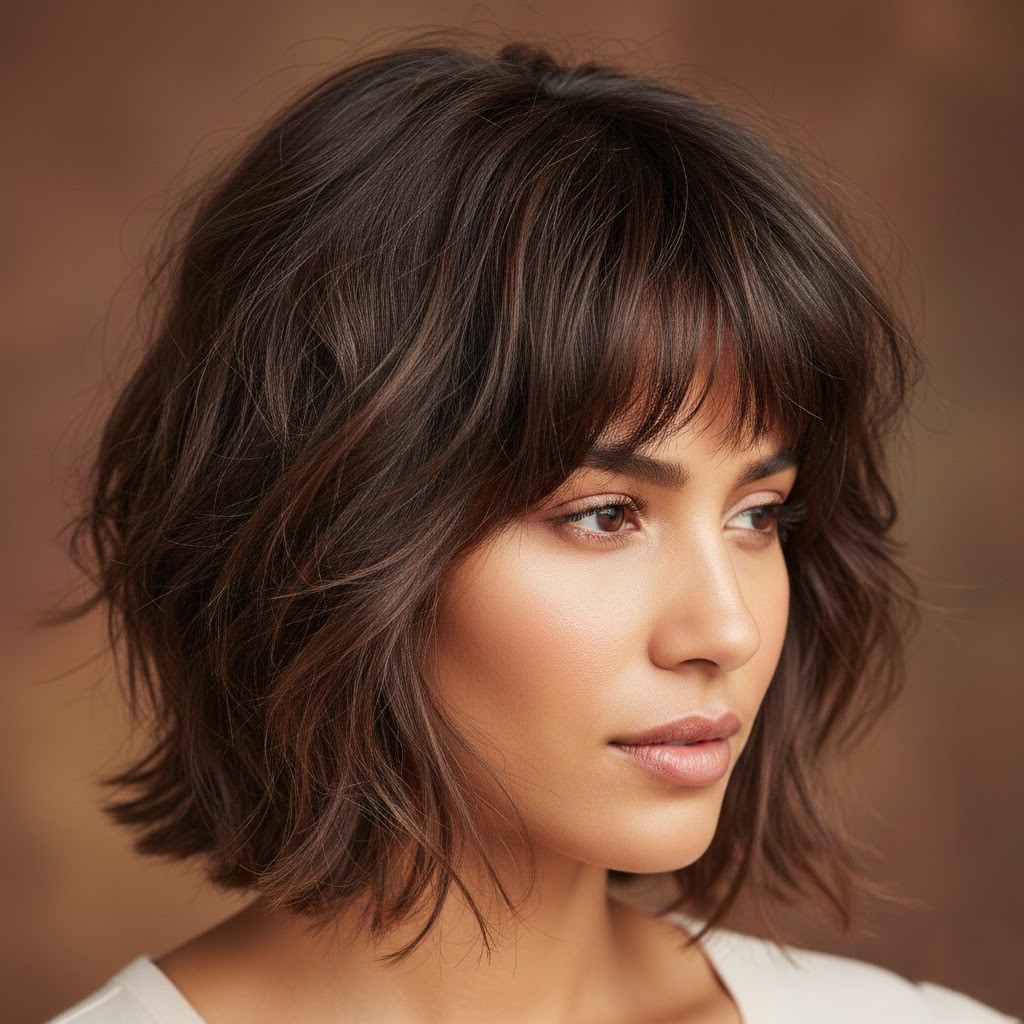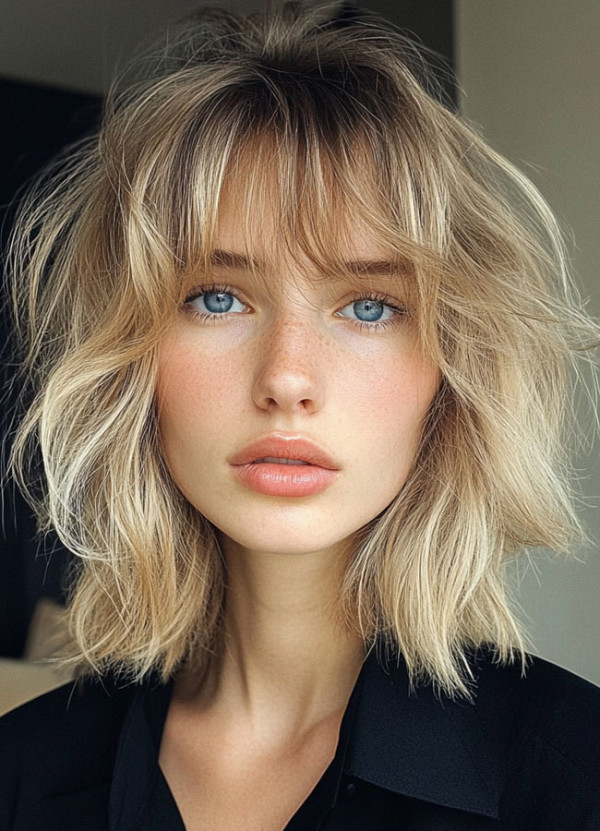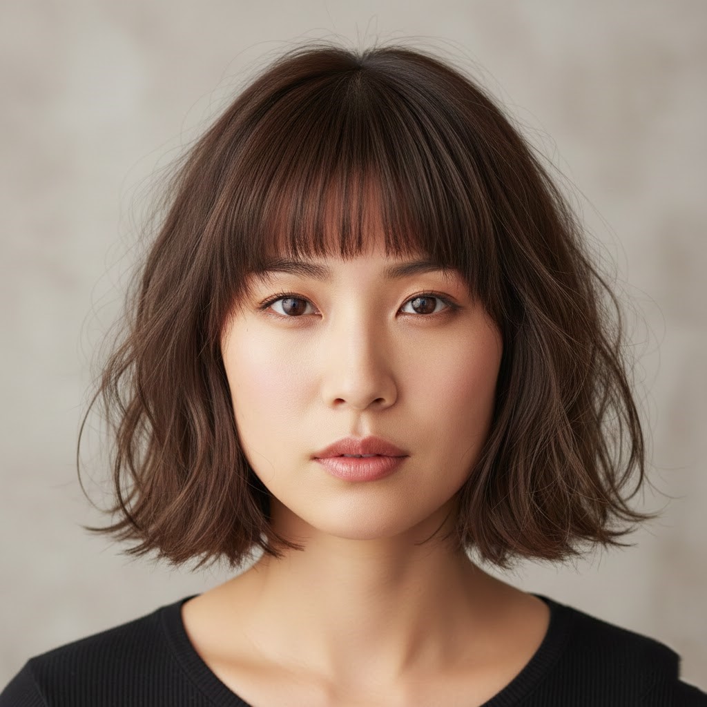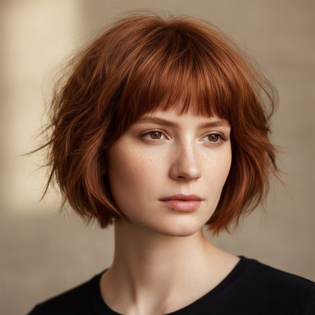 A textured bob with wispy bangs feels airy and playful. The uneven layers create natural movement, while the bangs soften the facial features.