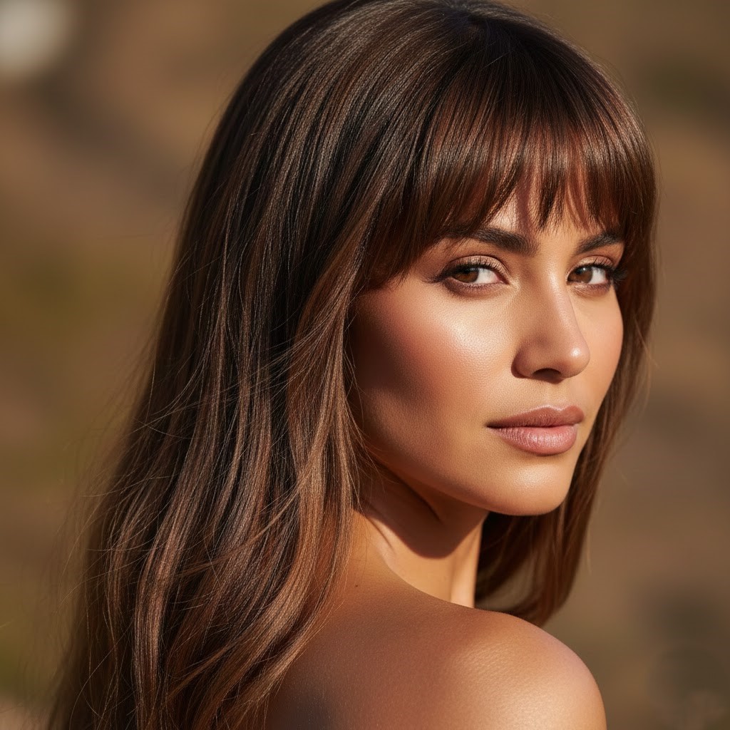 Shoulder-length hair paired with wispy bangs feels light, fresh, and natural. The soft fringe adds detail without taking over the face.