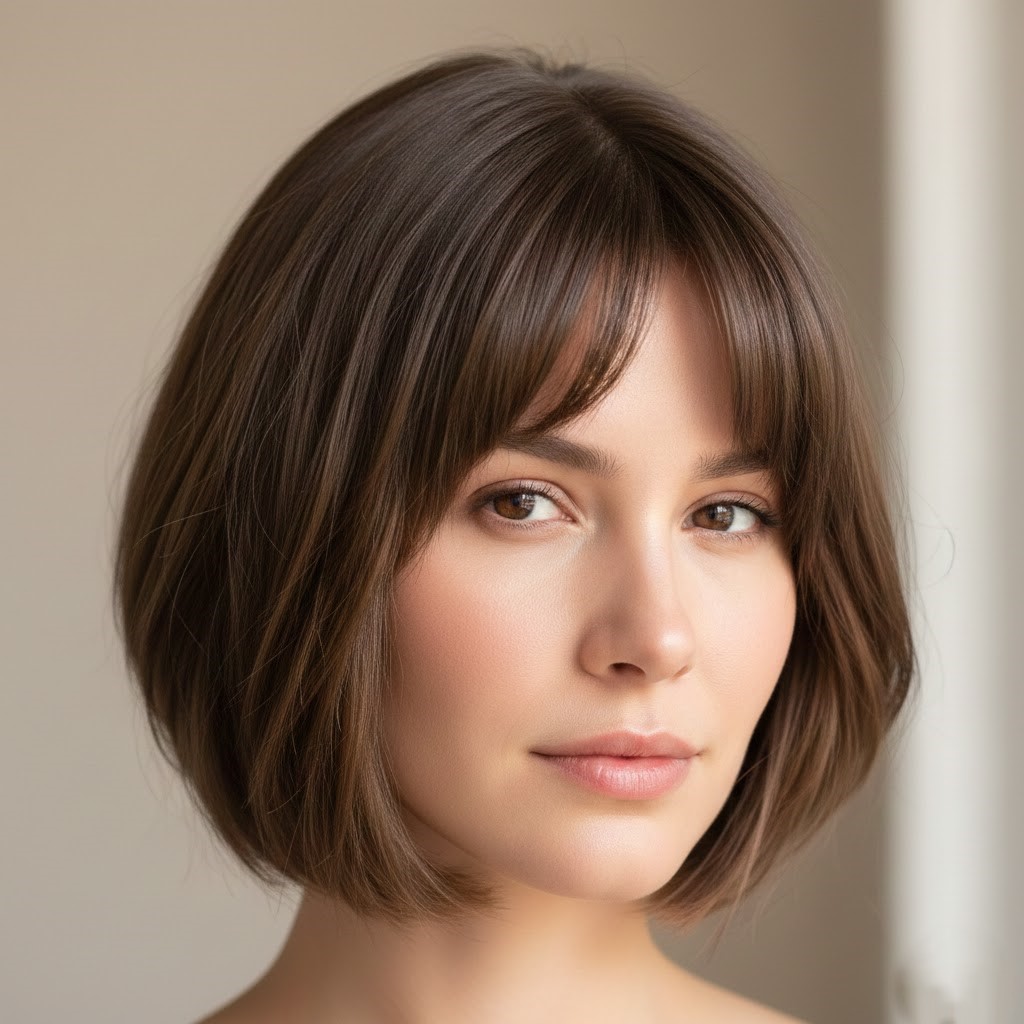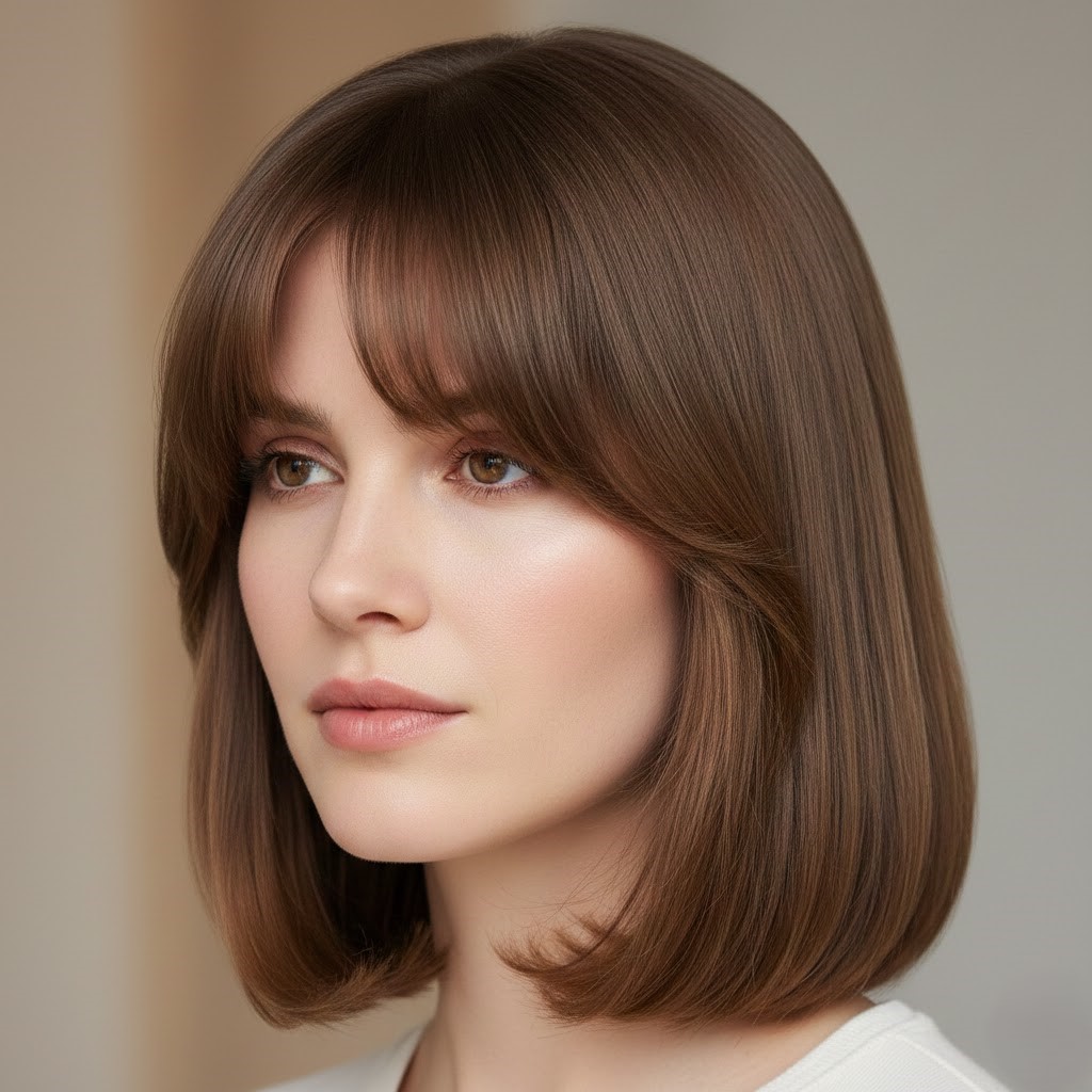 A blunt bob with bangs creates a sharp, modern silhouette that looks instantly polished. The straight, clean edges give the hair a fuller and more structured appearance, making it ideal for a sleek finish.