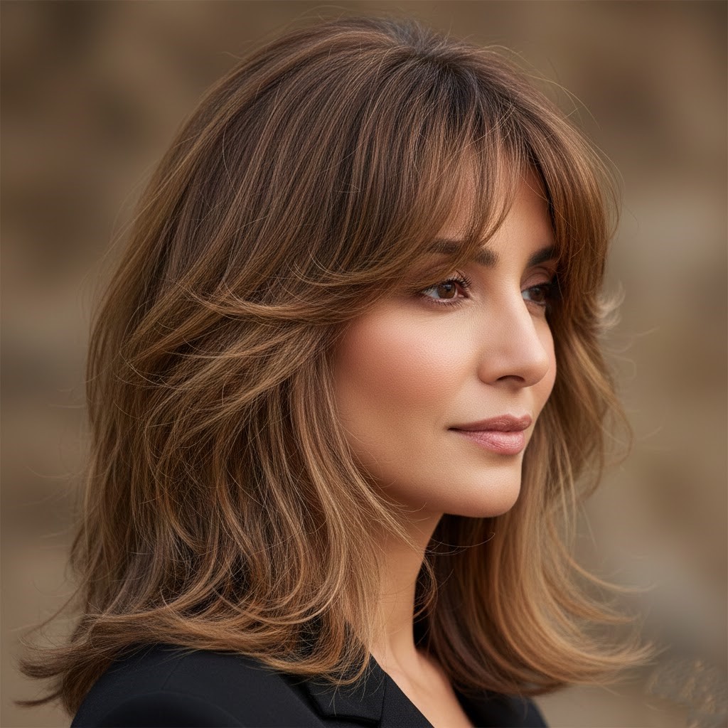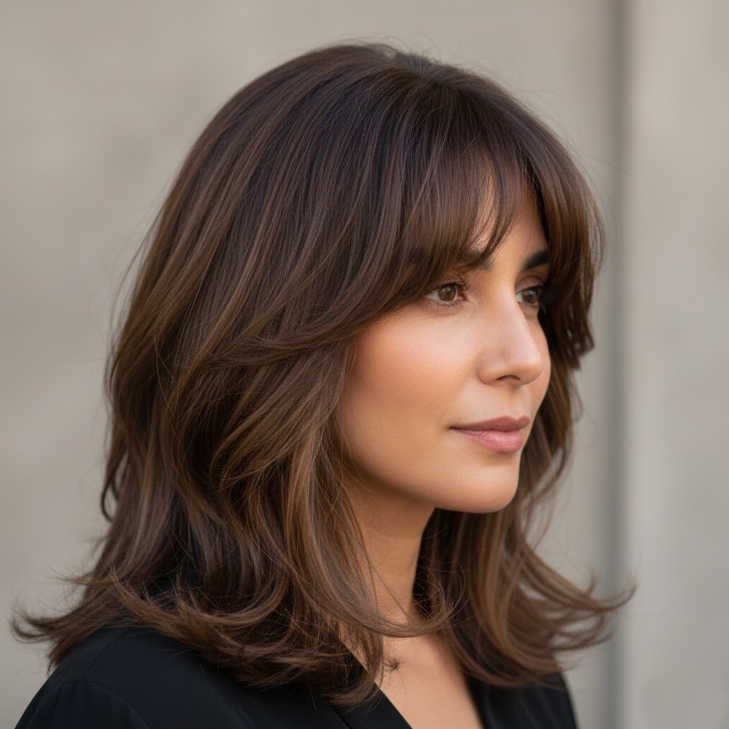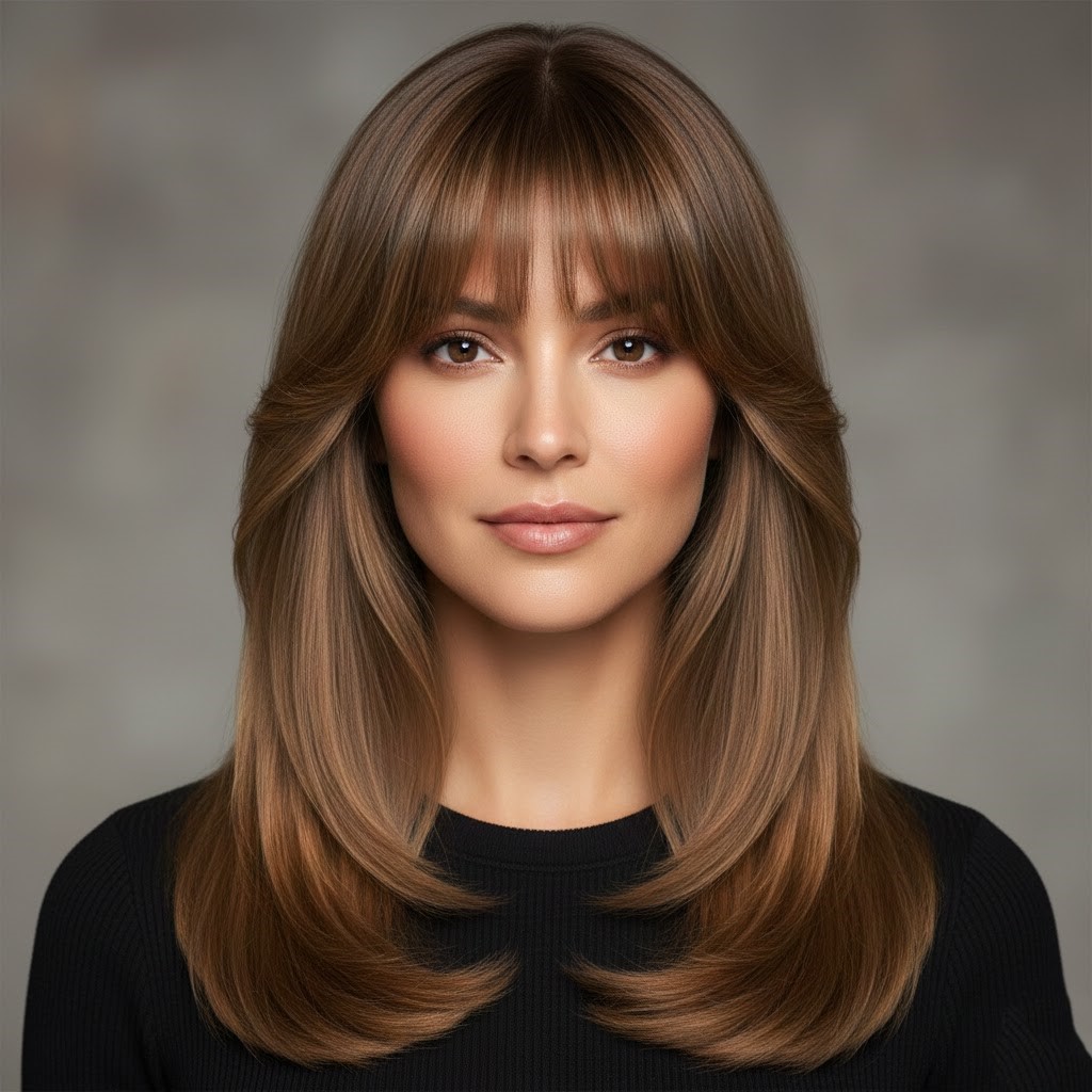 Medium-length layered hair with bangs offers balance and movement. The layers prevent the haircut from feeling stiff or bulky.