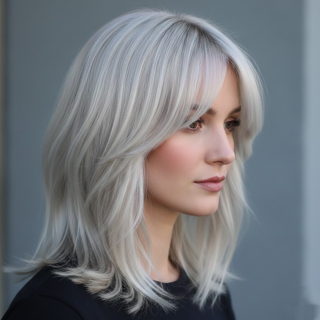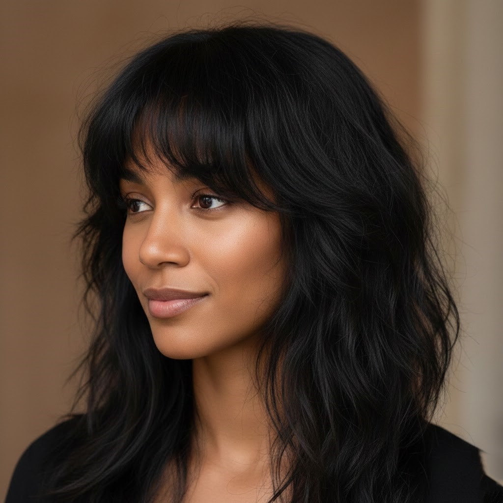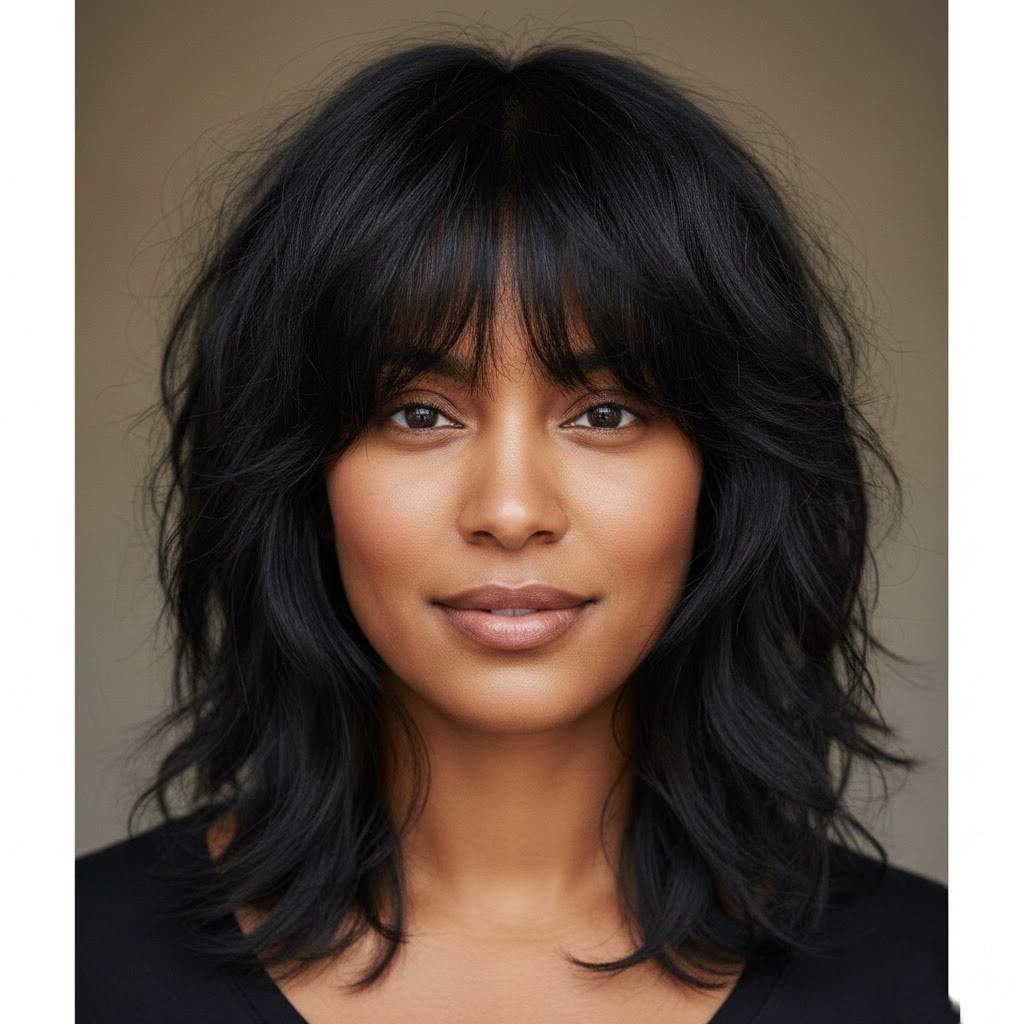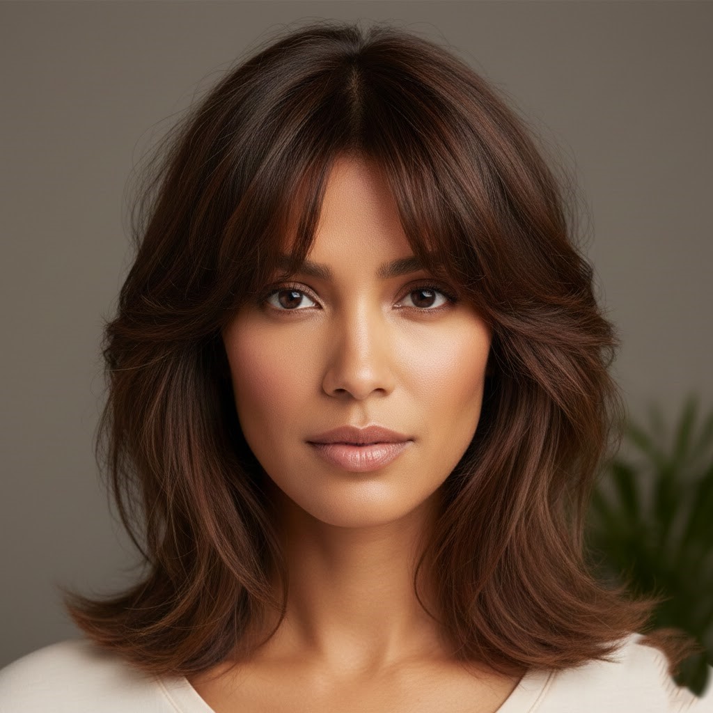 Medium-length layered hair with bangs offers balance and movement. The layers prevent the haircut from feeling stiff or bulky.