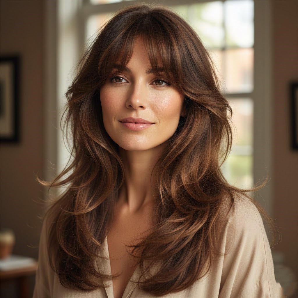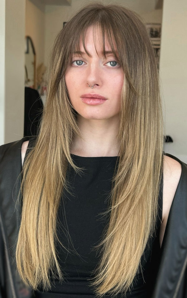Layered long hair with blunt bangs creates a striking contrast between soft layers and a sharp fringe. The layers add movement and volume, keeping the style dynamic and lively.