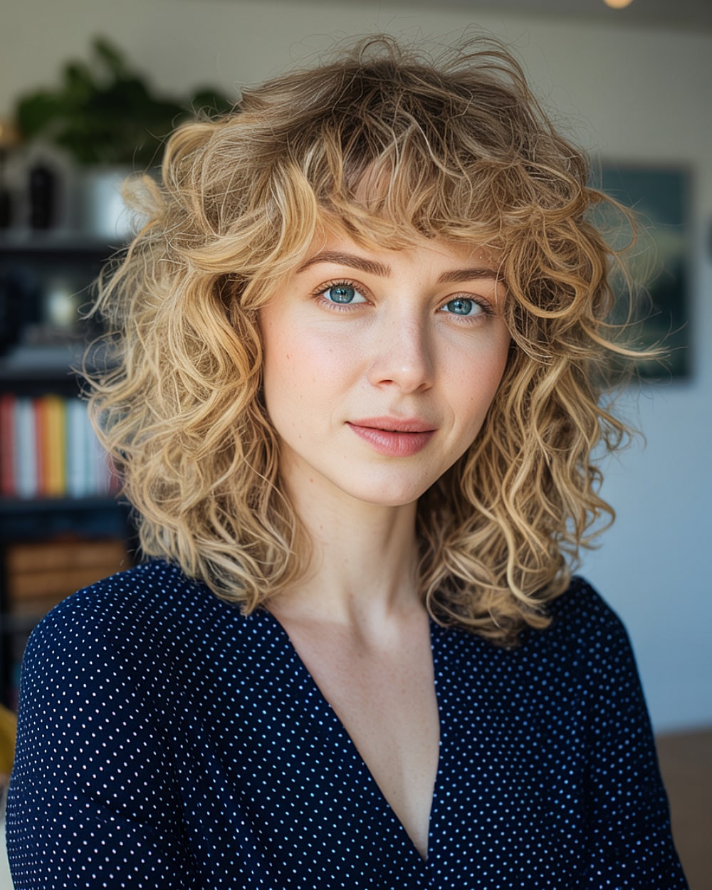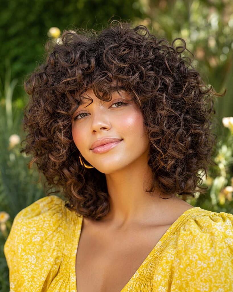 Curly bangs help balance volume around the face. They prevent curls from looking too heavy or overwhelming.