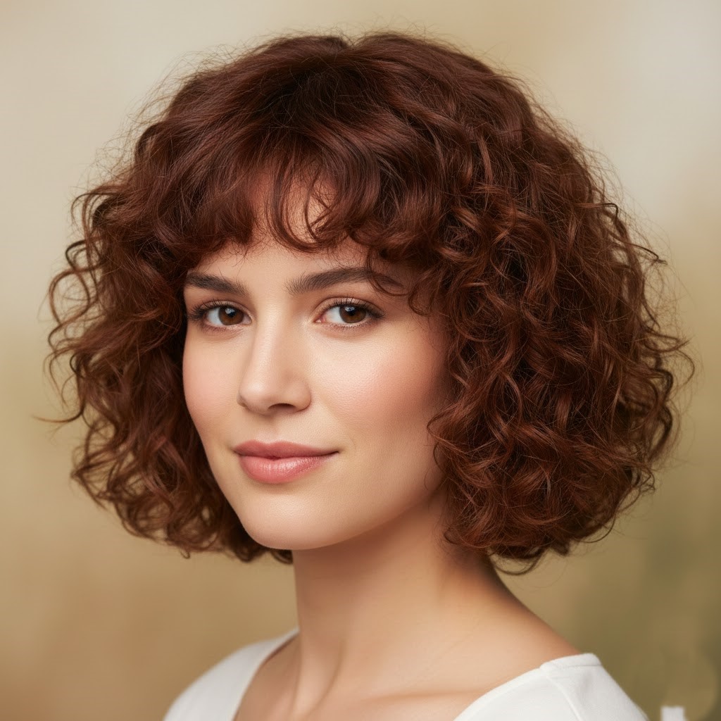 A curly bob with side bangs is playful and full of character. The curls add volume and bounce, while the side bangs soften the face.