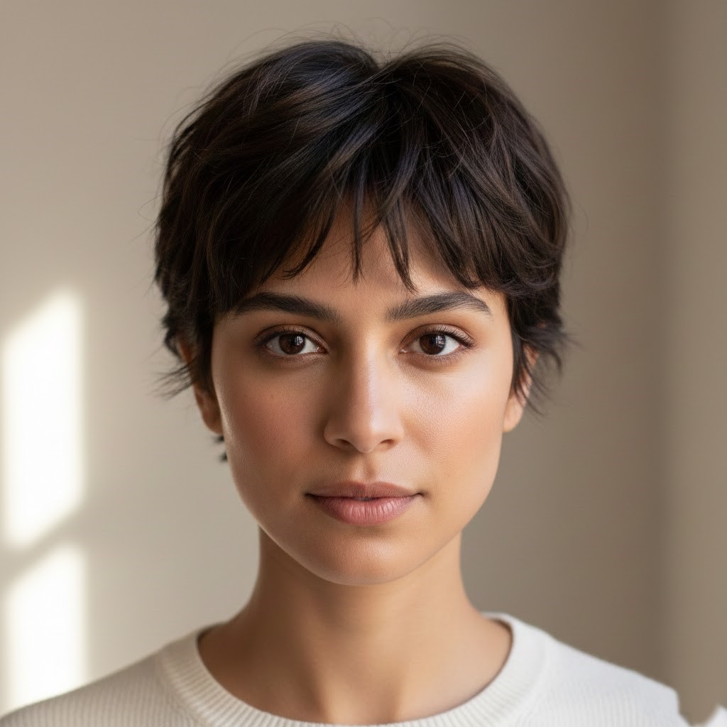 A pixie cut with bangs makes a strong yet stylish statement. The bangs soften the short length and bring balance to the overall shape.