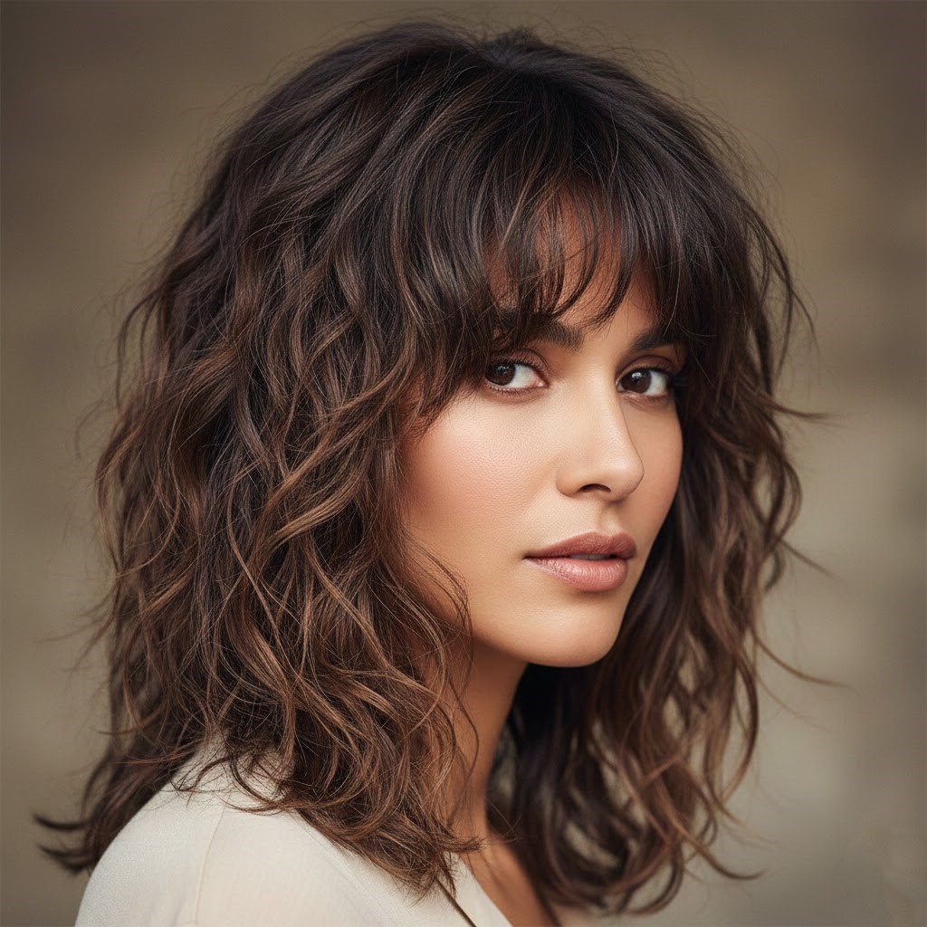 Bangs help frame the face and connect seamlessly with the choppy layers. This creates a relaxed, effortless finish.
