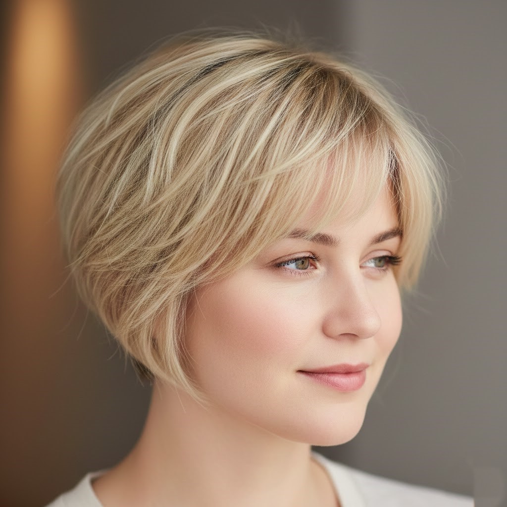 Bangs help balance the short length and frame the face beautifully. They can be styled straight, messy, or slightly textured for versatility.