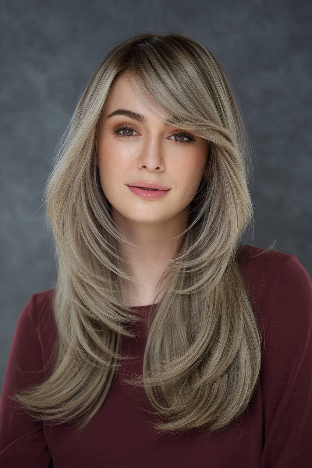 Long layers with side-swept bangs offer a relaxed, feminine vibe. The flowing layers enhance natural movement while the side bangs provide a gentle face frame.