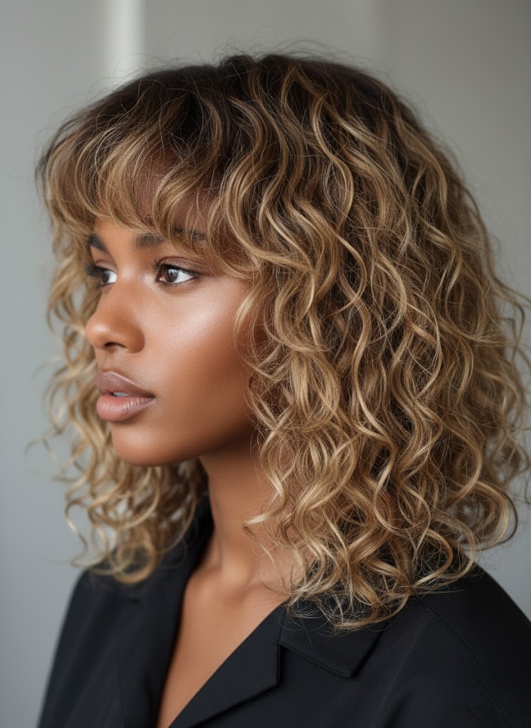 Curly hair with bangs looks playful, fresh, and full of character. When shaped correctly, the bangs follow the natural curl pattern.