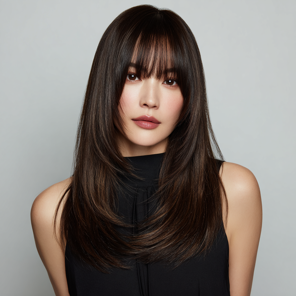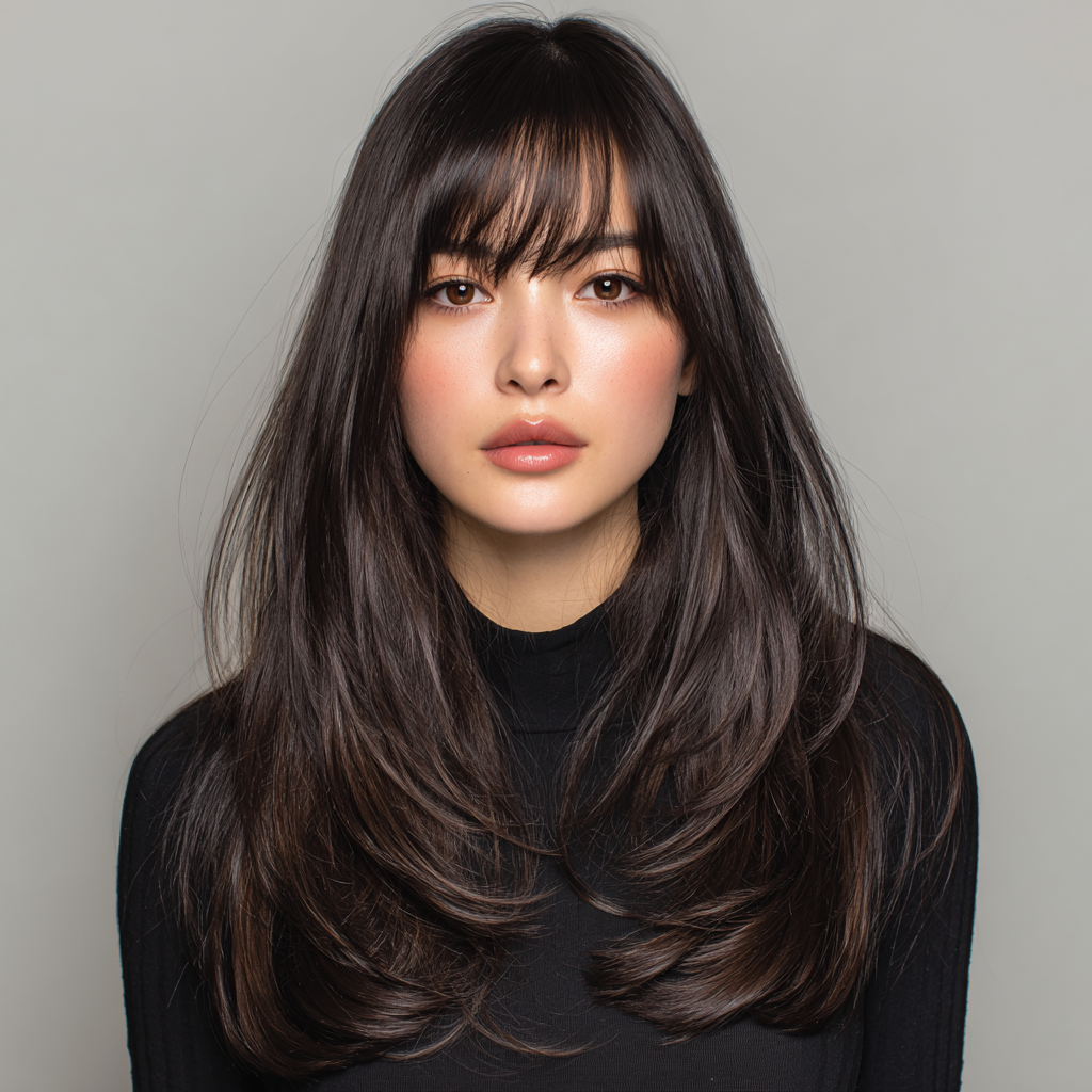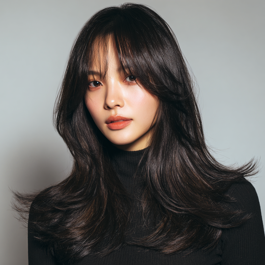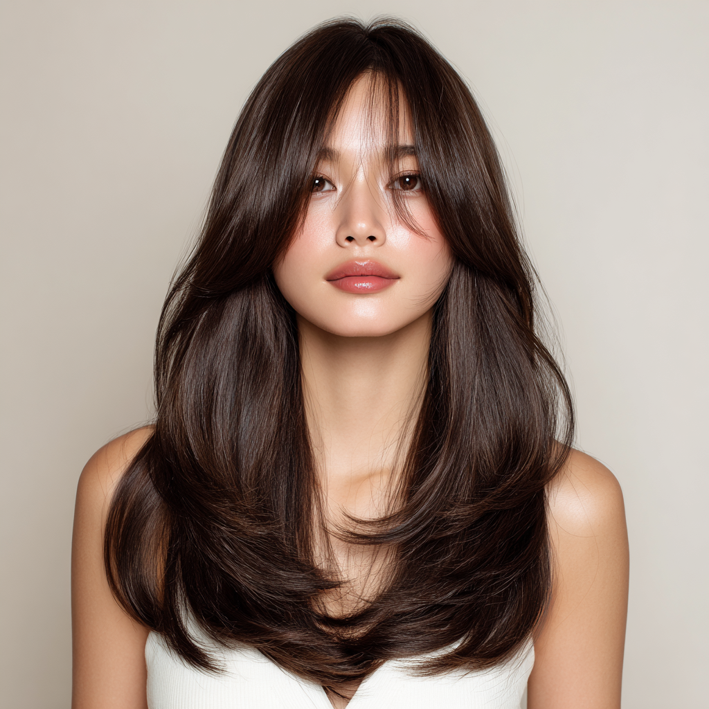 The Korean-inspired long layered haircut is sleek, minimal, and effortlessly elegant. It features subtle face-framing layers and natural shine, often paired with soft curtain bangs for that signature K-beauty appeal.