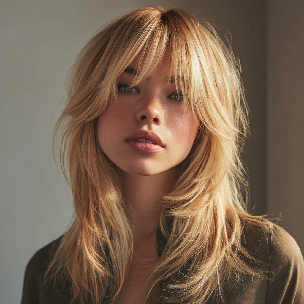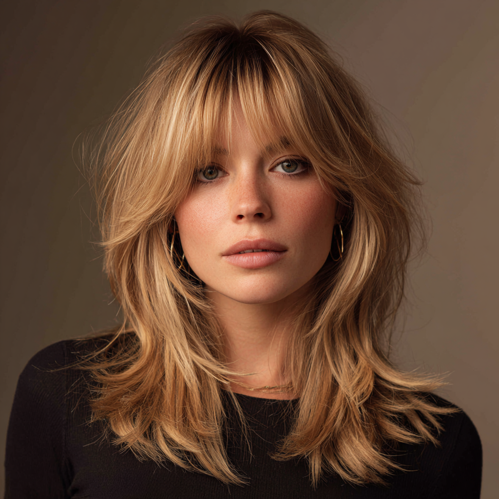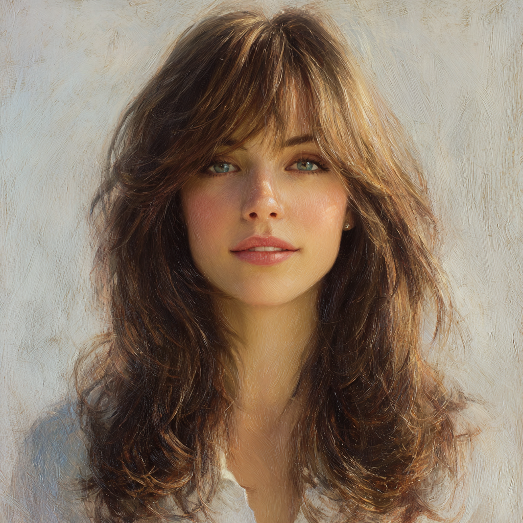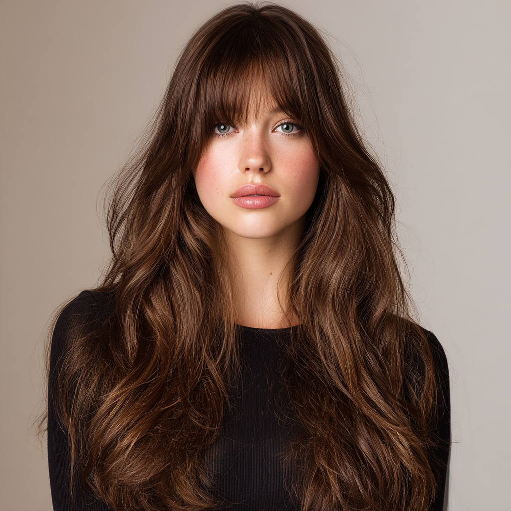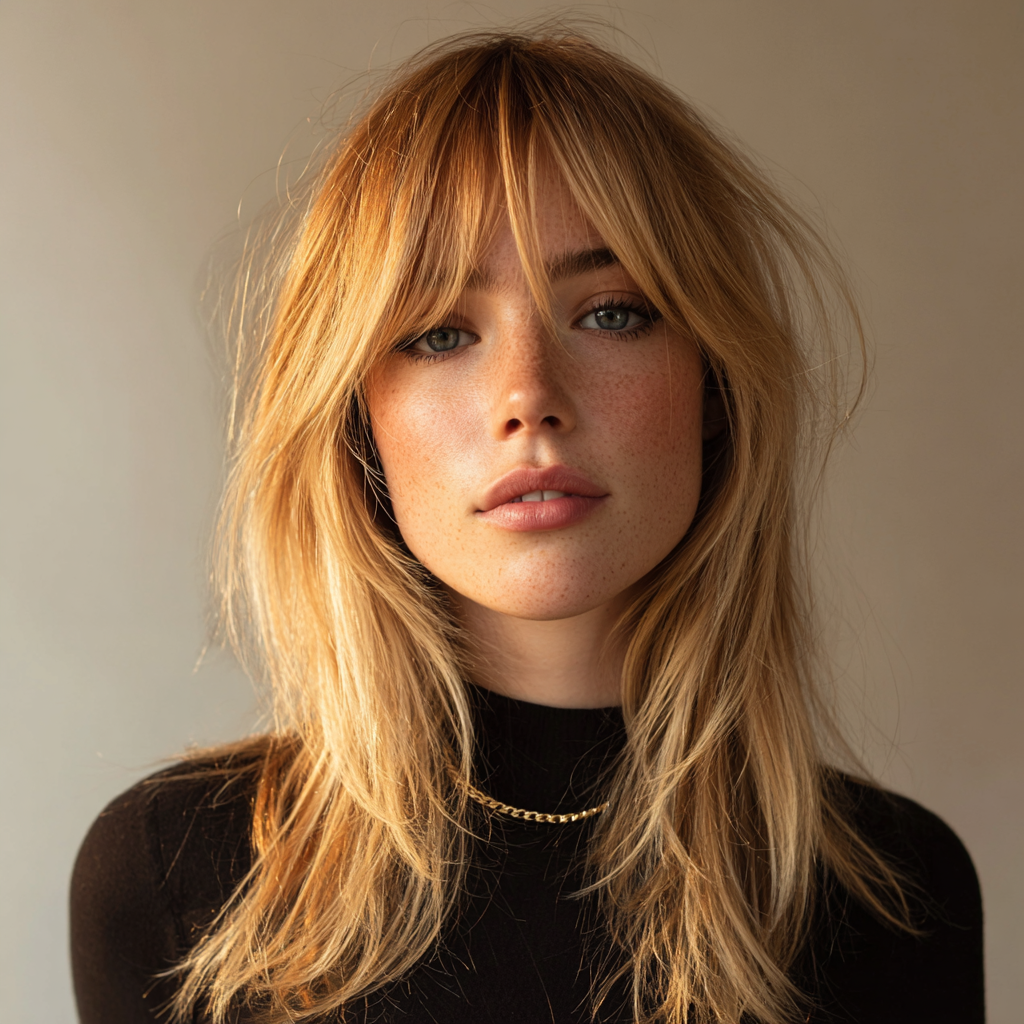 - Styling Tip: Use a flat iron to gently curve the bangs and layers for a soft, romantic shape.