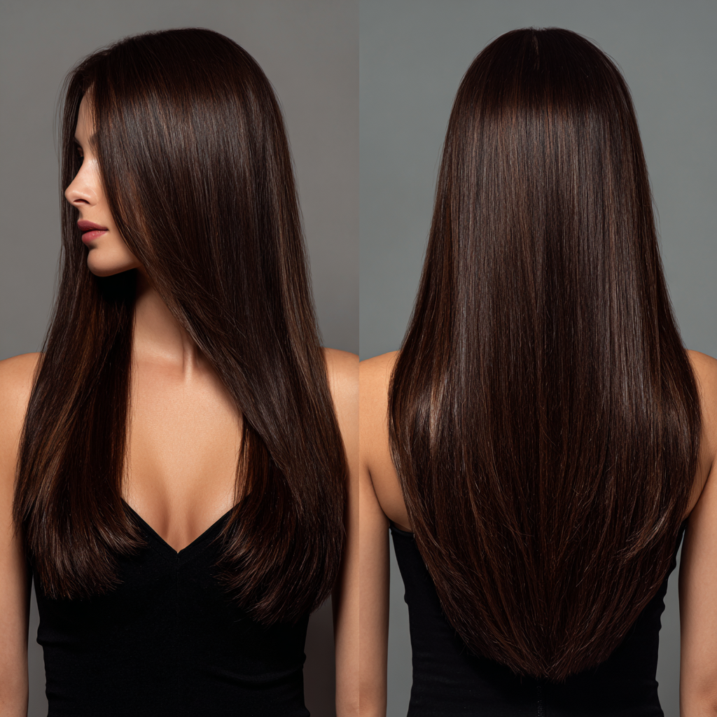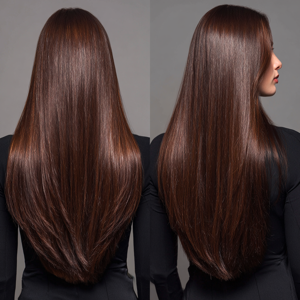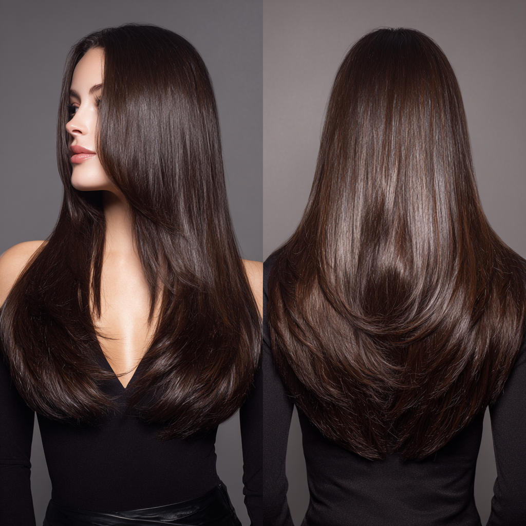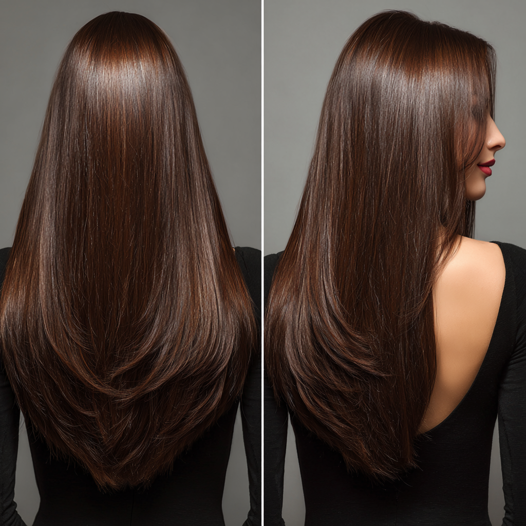 The V-cut layered haircut creates a flattering “V” shape at the back, emphasizing length and flow.