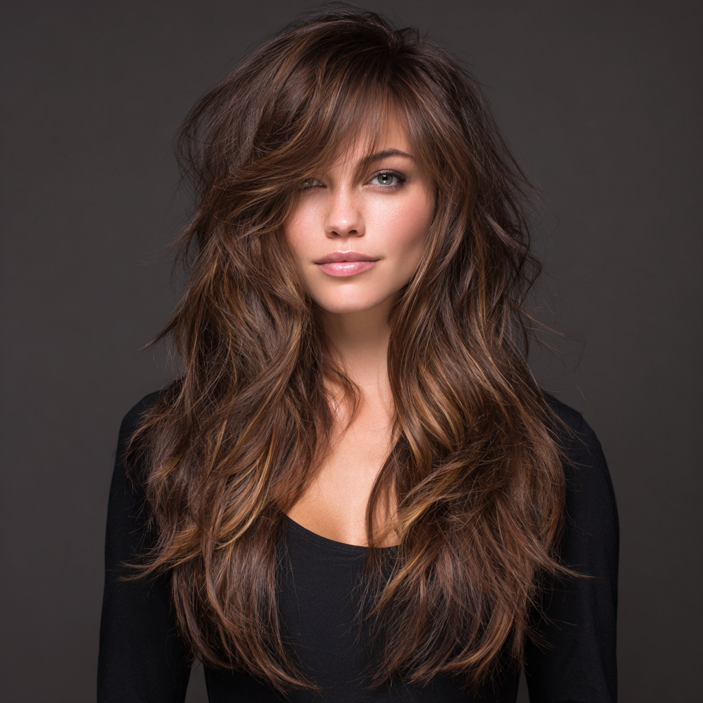Long layers with side bangs create a soft, face-framing effect that flatters almost every face shape. The side bangs seamlessly blend into the layers, adding movement and dimension without overpowering the overall length.