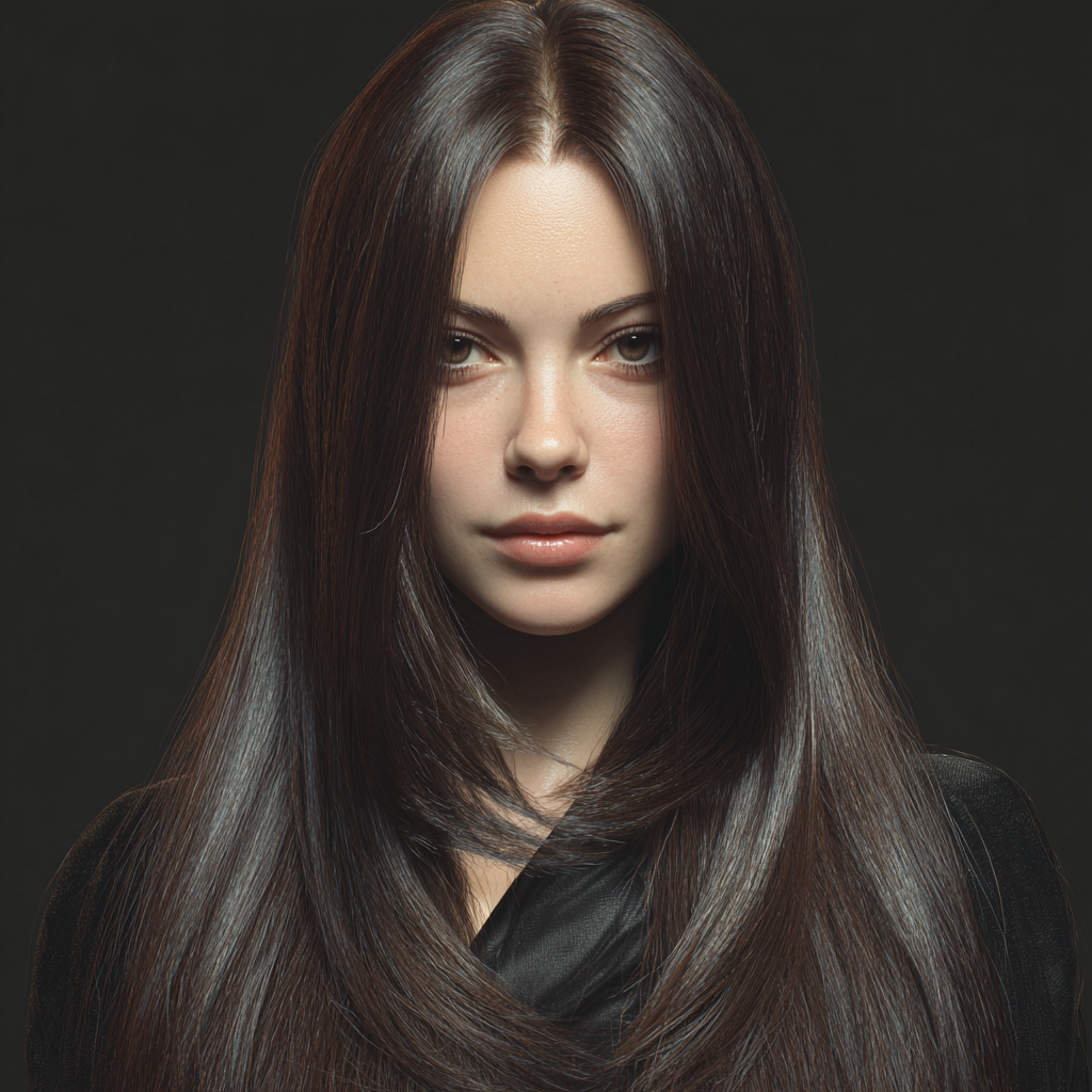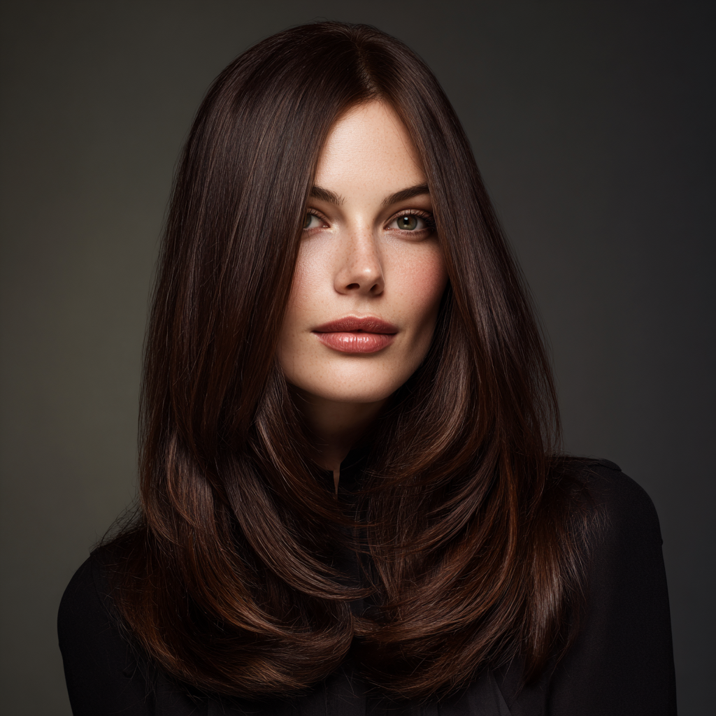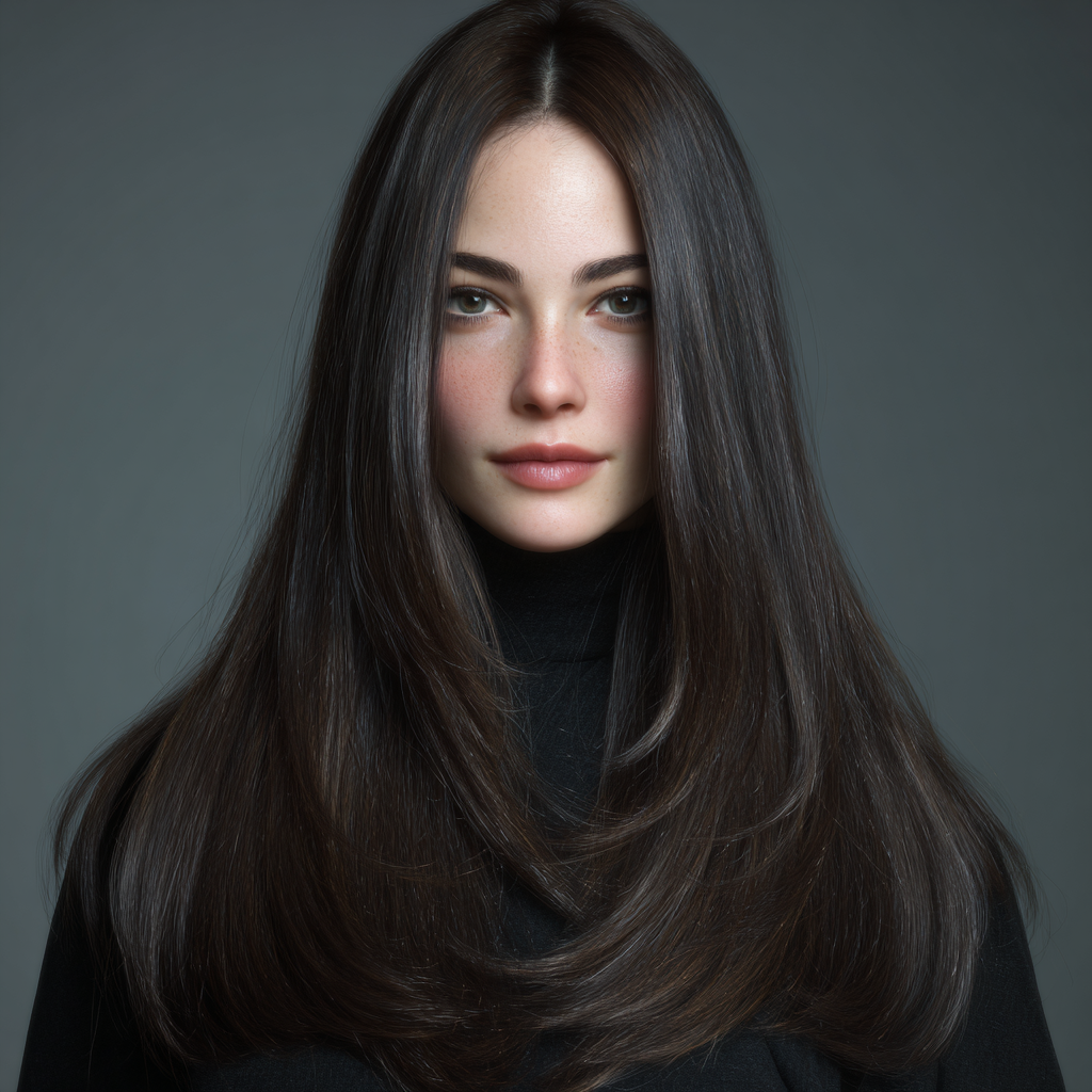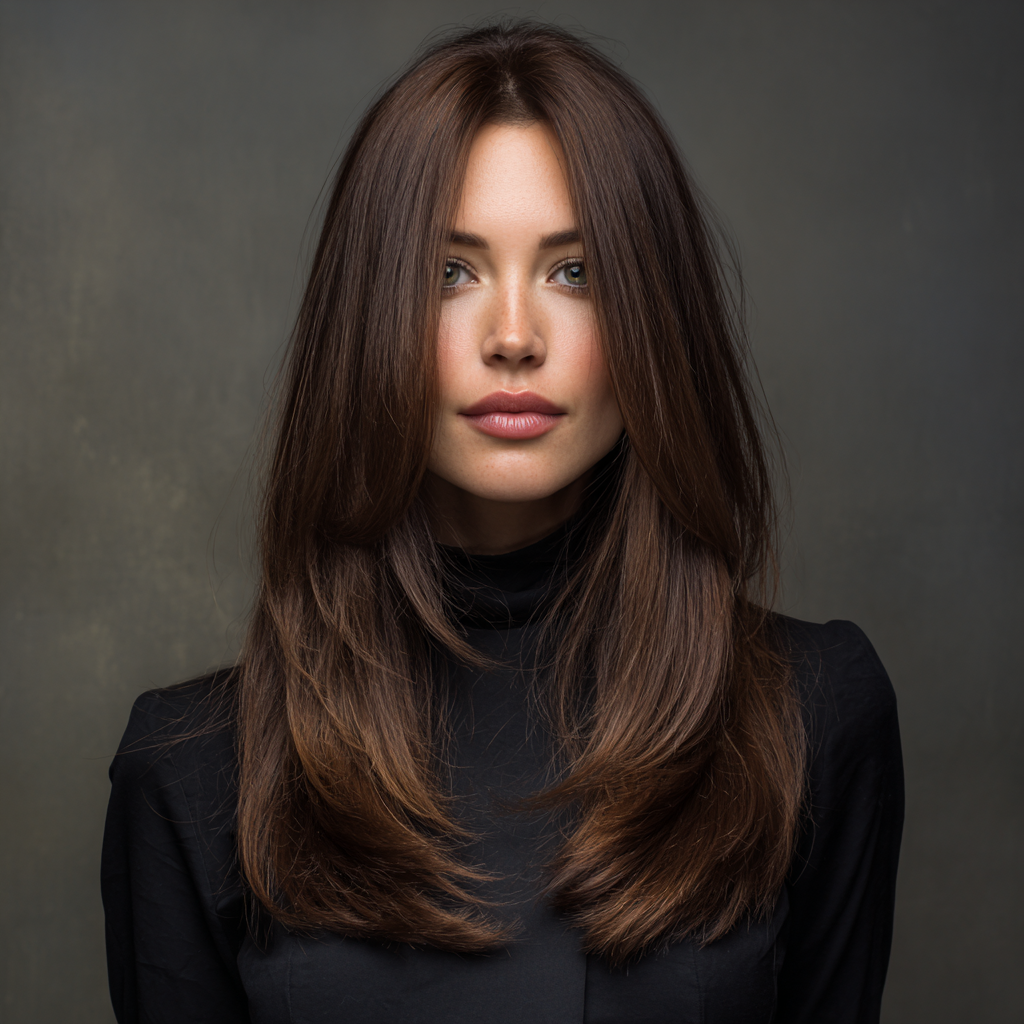 A center-parted long layered cut offers a clean, balanced look that flatters most face shapes. The layers on each side create symmetry, making it perfect for a sleek or soft, wavy finish.