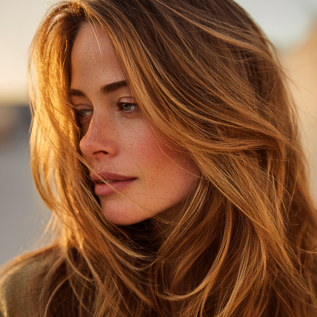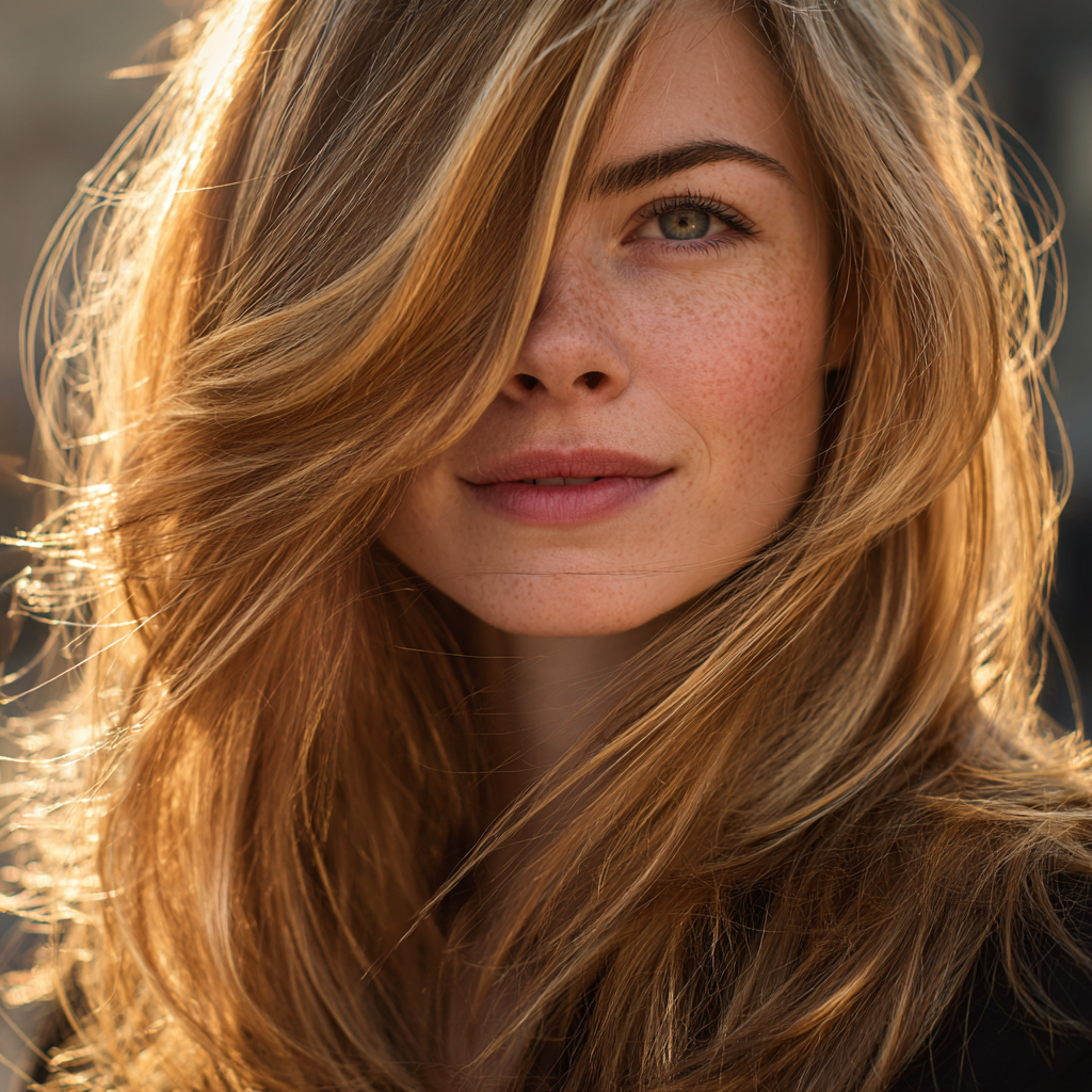 Sunlit highlighted layered hair captures the glow of natural sunlight with warm, radiant tones that enhance every layer. The combination of highlights and soft layers adds dimension, brightness, and effortless movement.