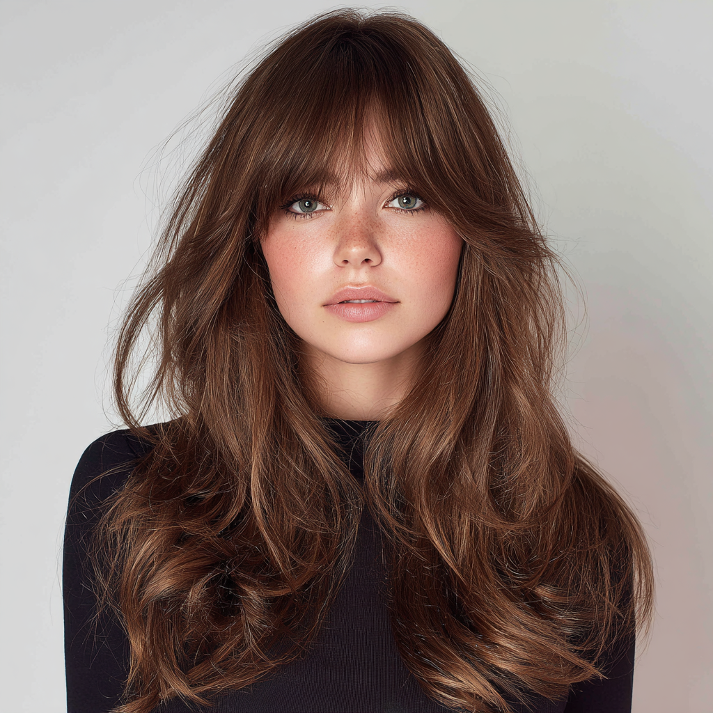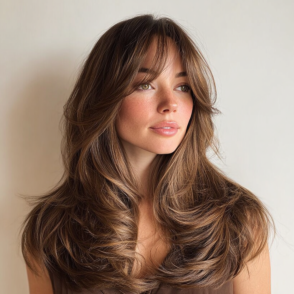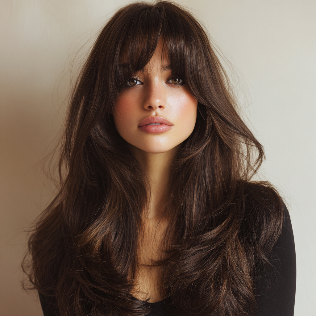This haircut blends soft, airy layers with delicate wispy bangs that seamlessly frame the face. The light bangs complement the flow of the layers, giving the look a dreamy, feminine touch.