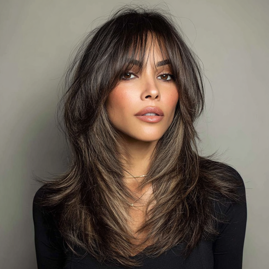 The wolf cut with long layers combines edgy shag-like texture with soft, face-framing movement. It offers a bold yet wearable look that’s full of personality, ideal for those who love a trendy, lived-in hairstyle.