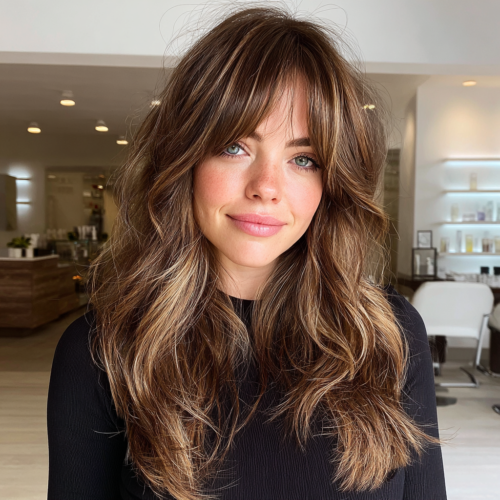 This style combines curtain bangs with long, face-framing layers for a balanced, airy look. The layers flow effortlessly around the face, enhancing natural features while keeping the hair soft and voluminous.