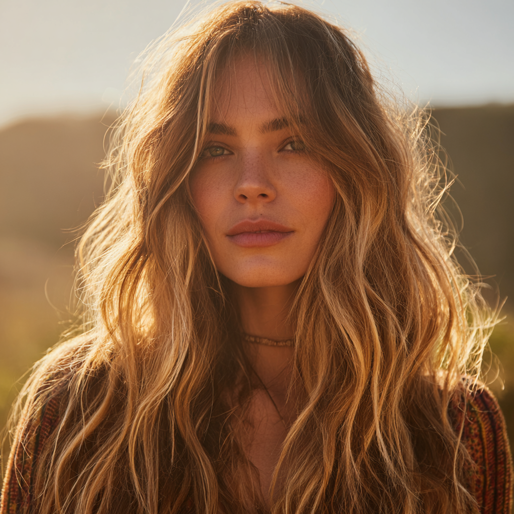 Boho-inspired long layered hair captures a carefree, romantic feel with soft, undone waves and natural texture. The long layers enhance flow and movement, giving it that effortless “beachy” charm.