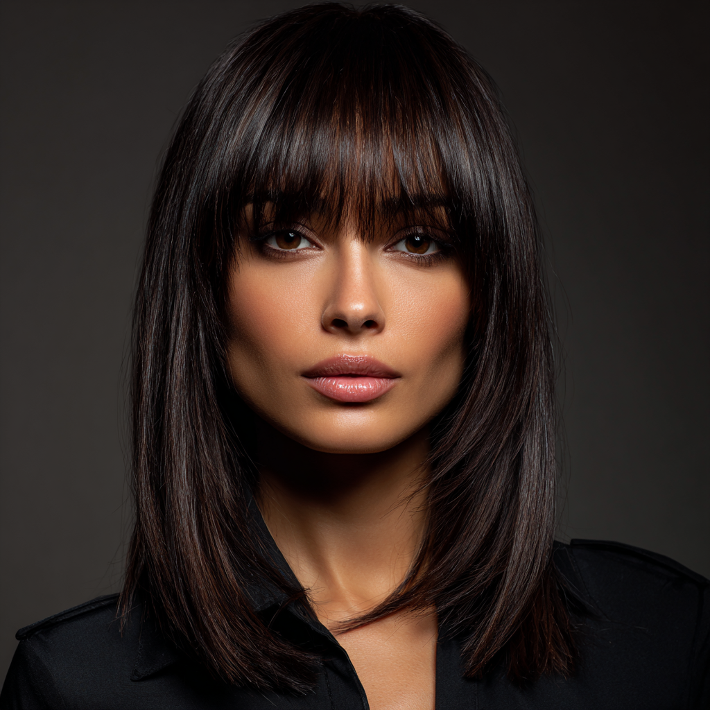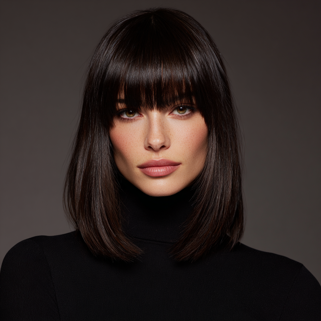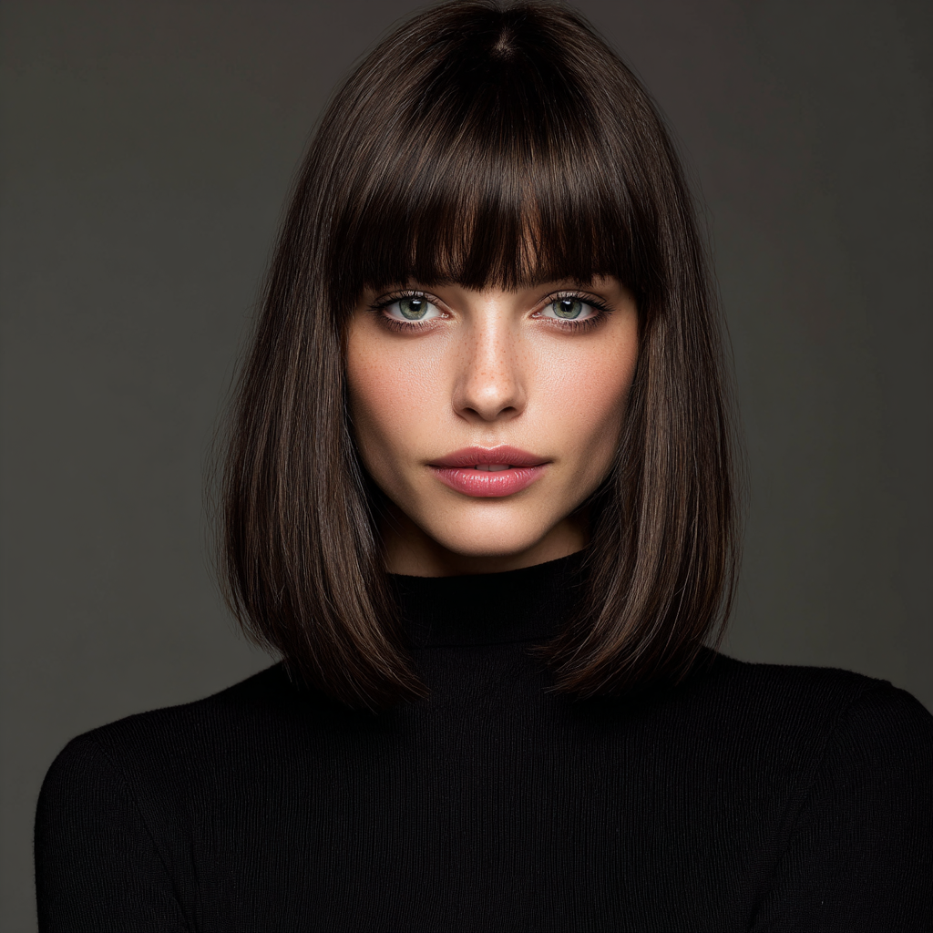 A classic shoulder-length haircut with straight bangs is the definition of timeless chic. The sleek lines frame your face beautifully while keeping the style polished and easy to manage.