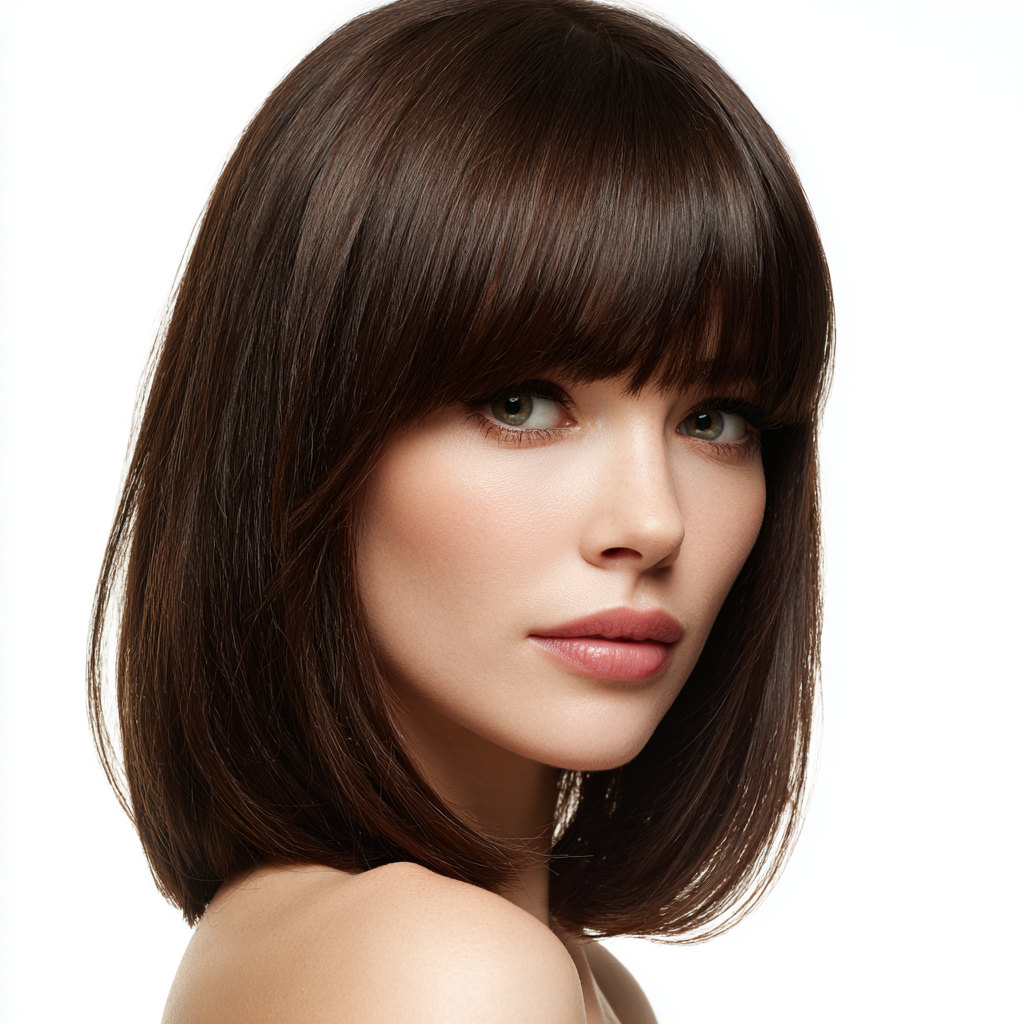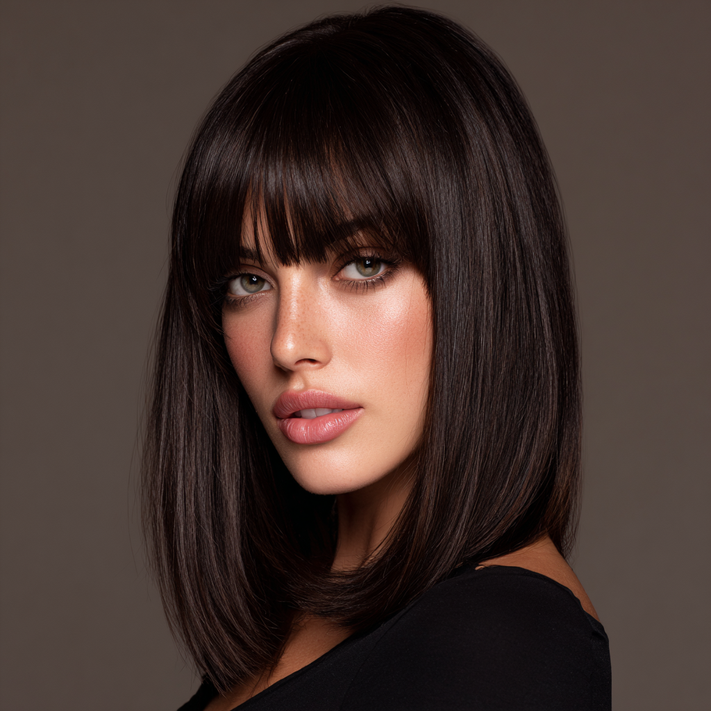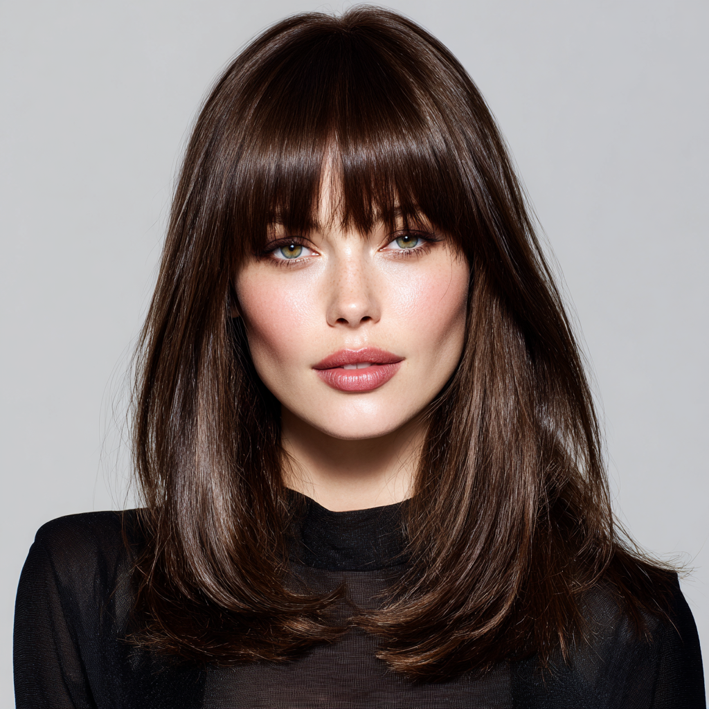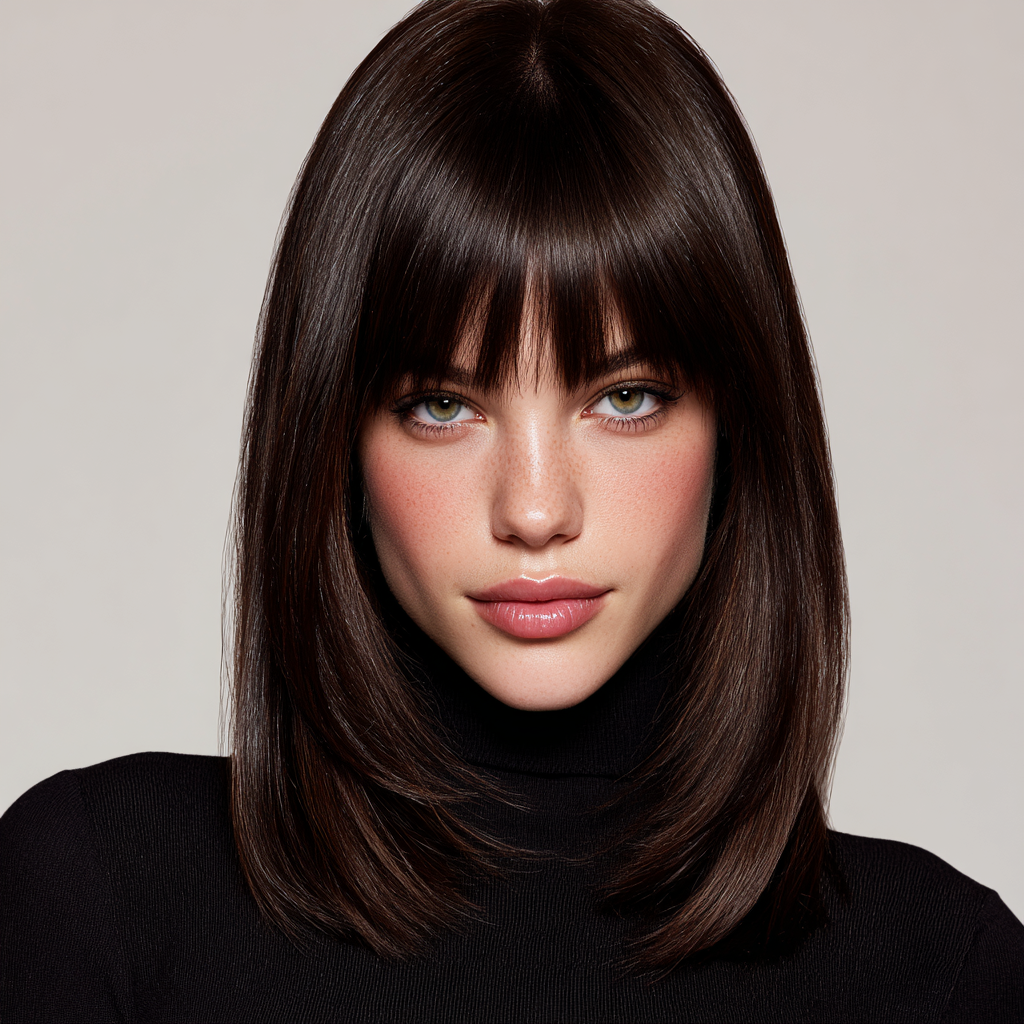 A classic shoulder-length haircut with straight bangs is the definition of timeless chic. The sleek lines frame your face beautifully while keeping the style polished and easy to manage.