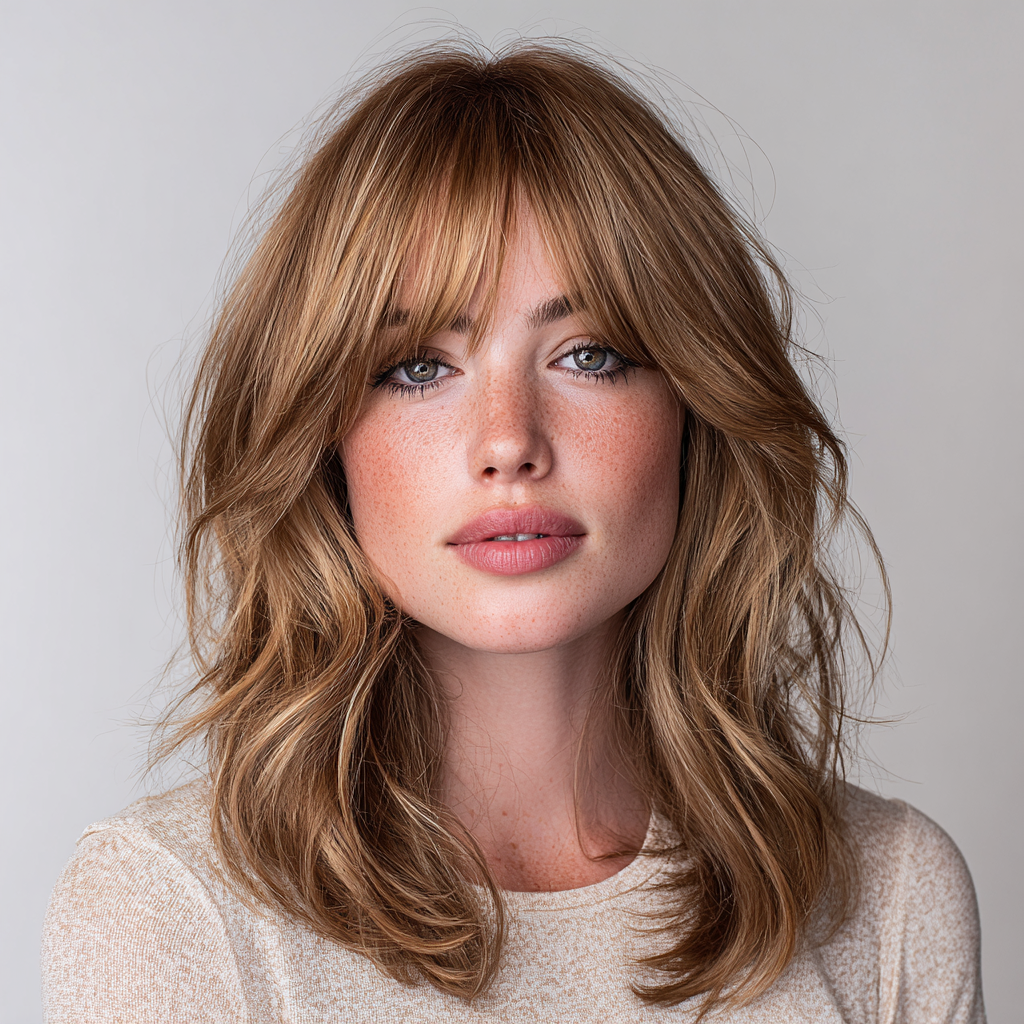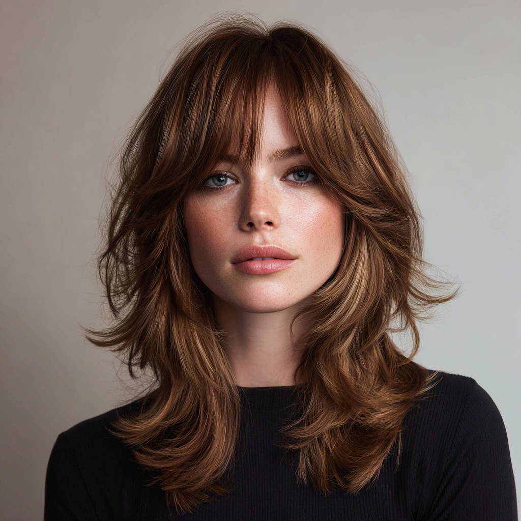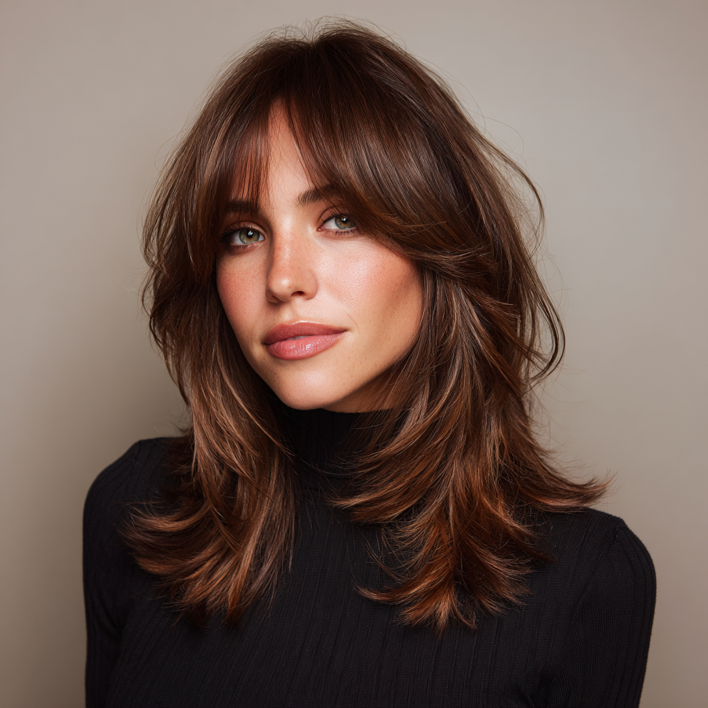 Layered medium-length hair with side bangs creates a soft, voluminous look that adds texture and movement. The layers blend seamlessly while the bangs frame the face elegantly.