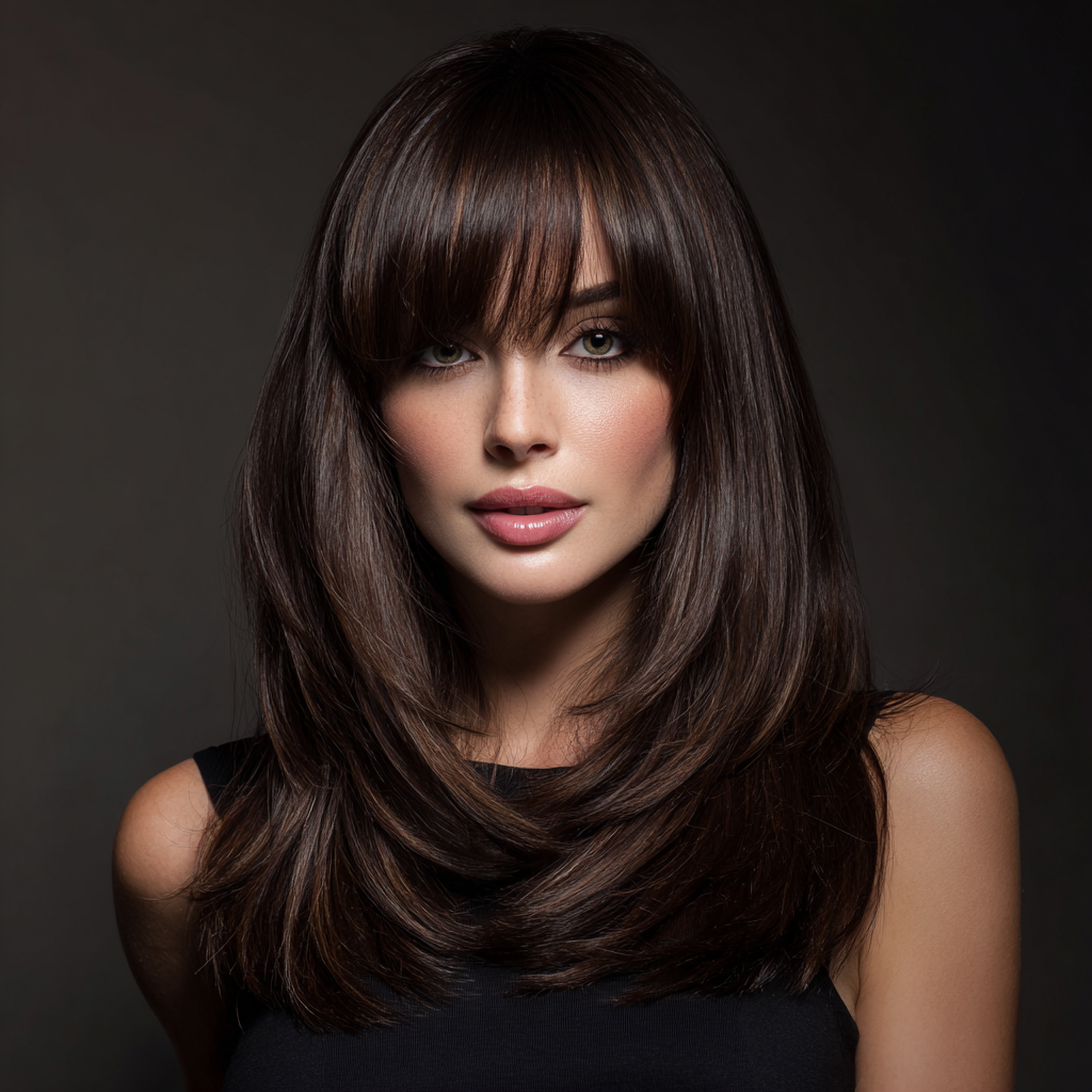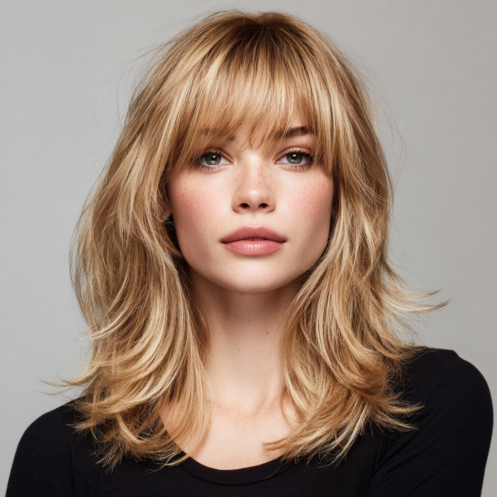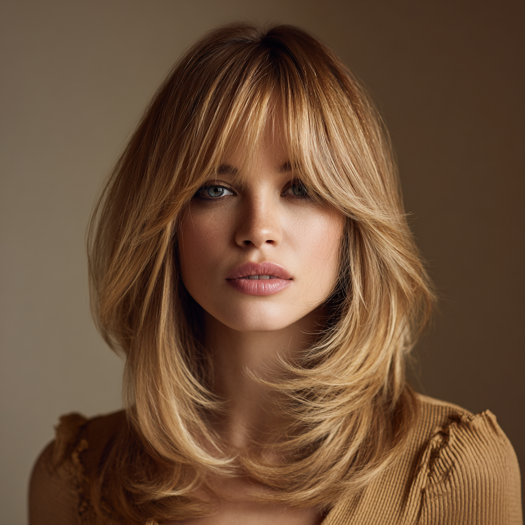 Layered medium-length hair with side bangs creates a soft, voluminous look that adds texture and movement. The layers blend seamlessly while the bangs frame the face elegantly.