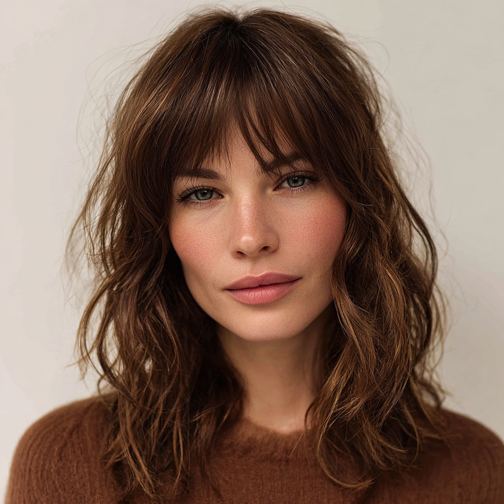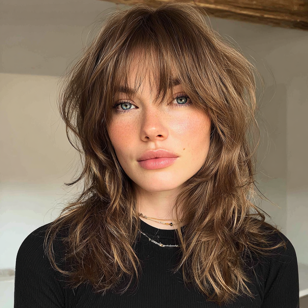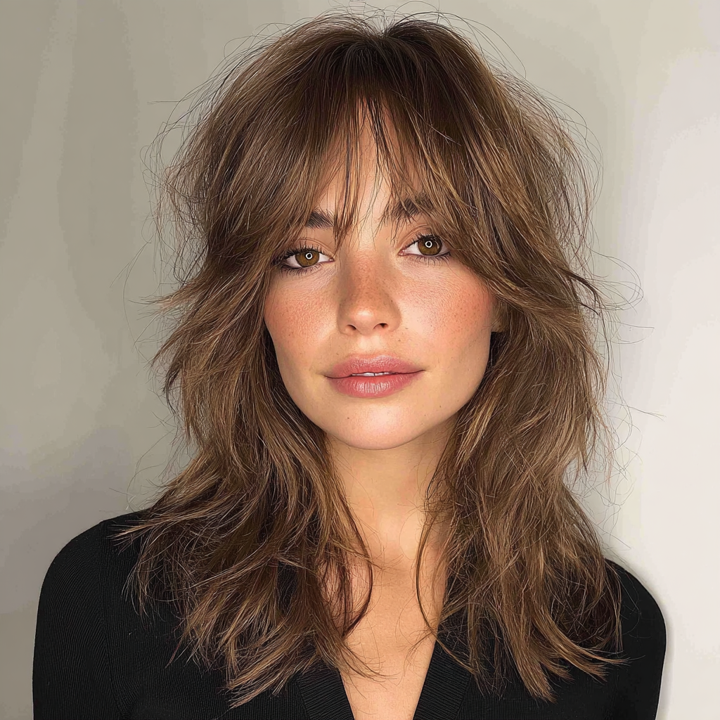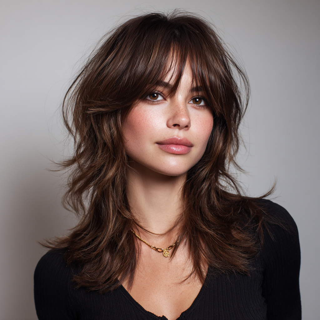 A medium-length wolf cut with bangs combines edgy layers with face-framing fringe. The layers create dynamic texture, while the bangs highlight eyes and cheekbones.