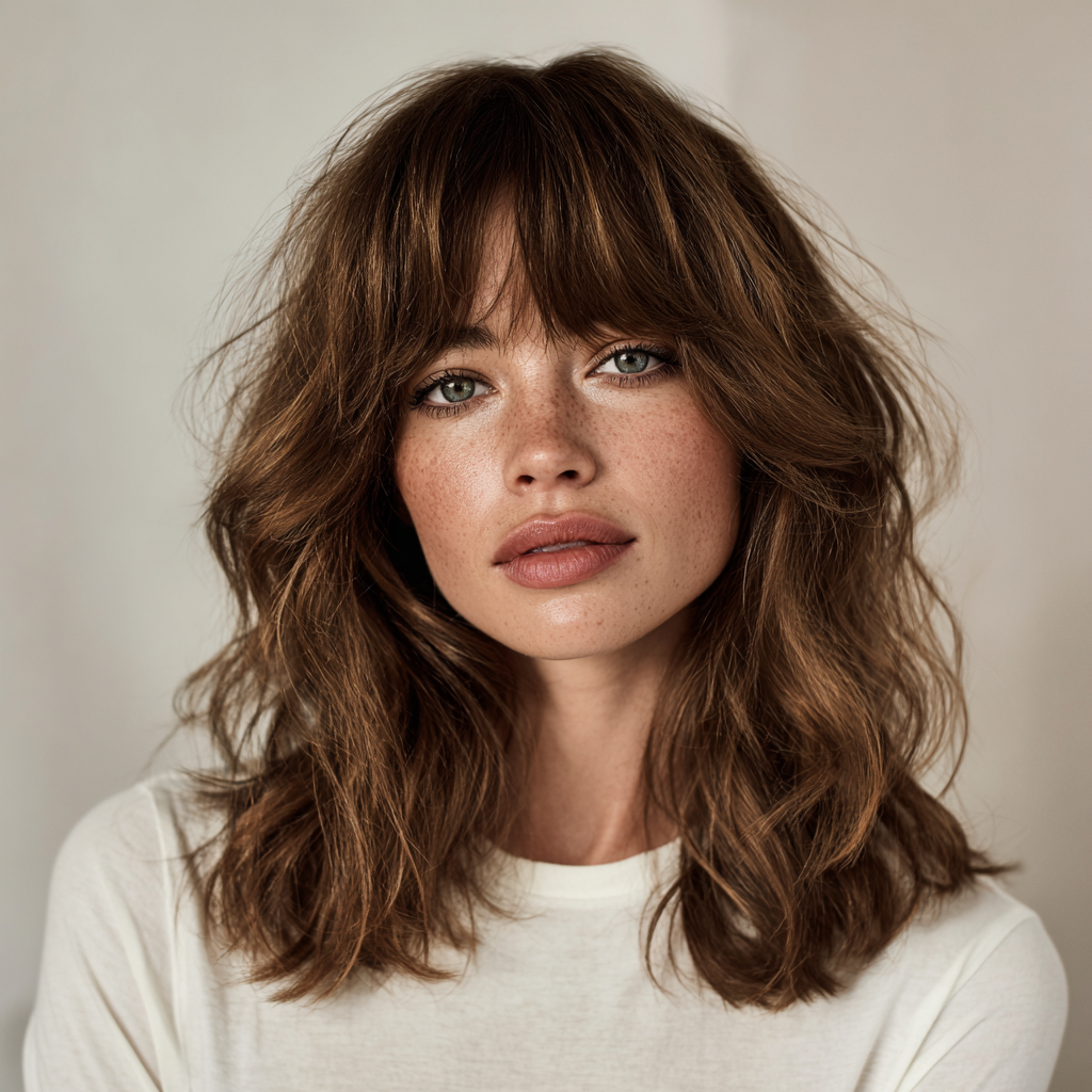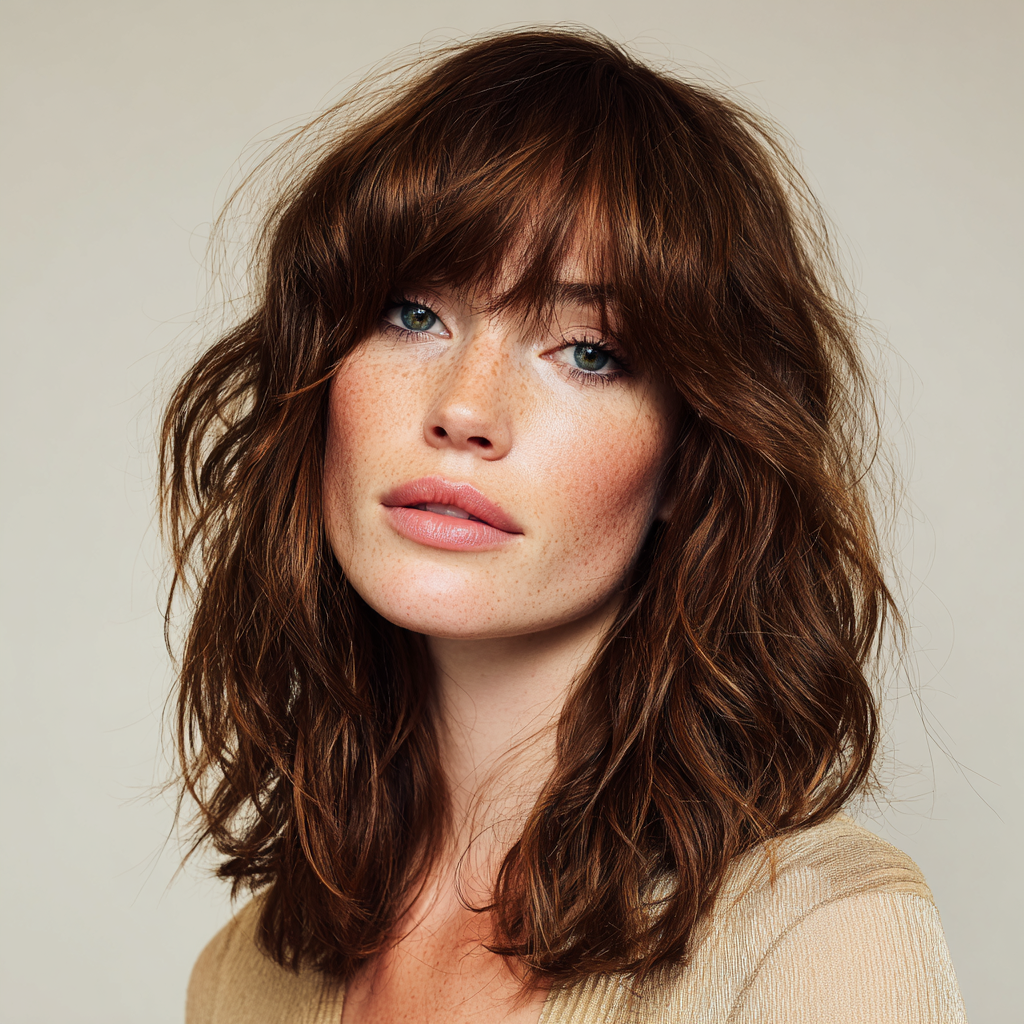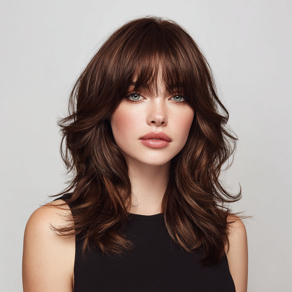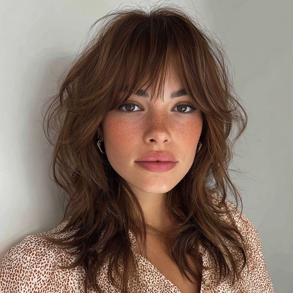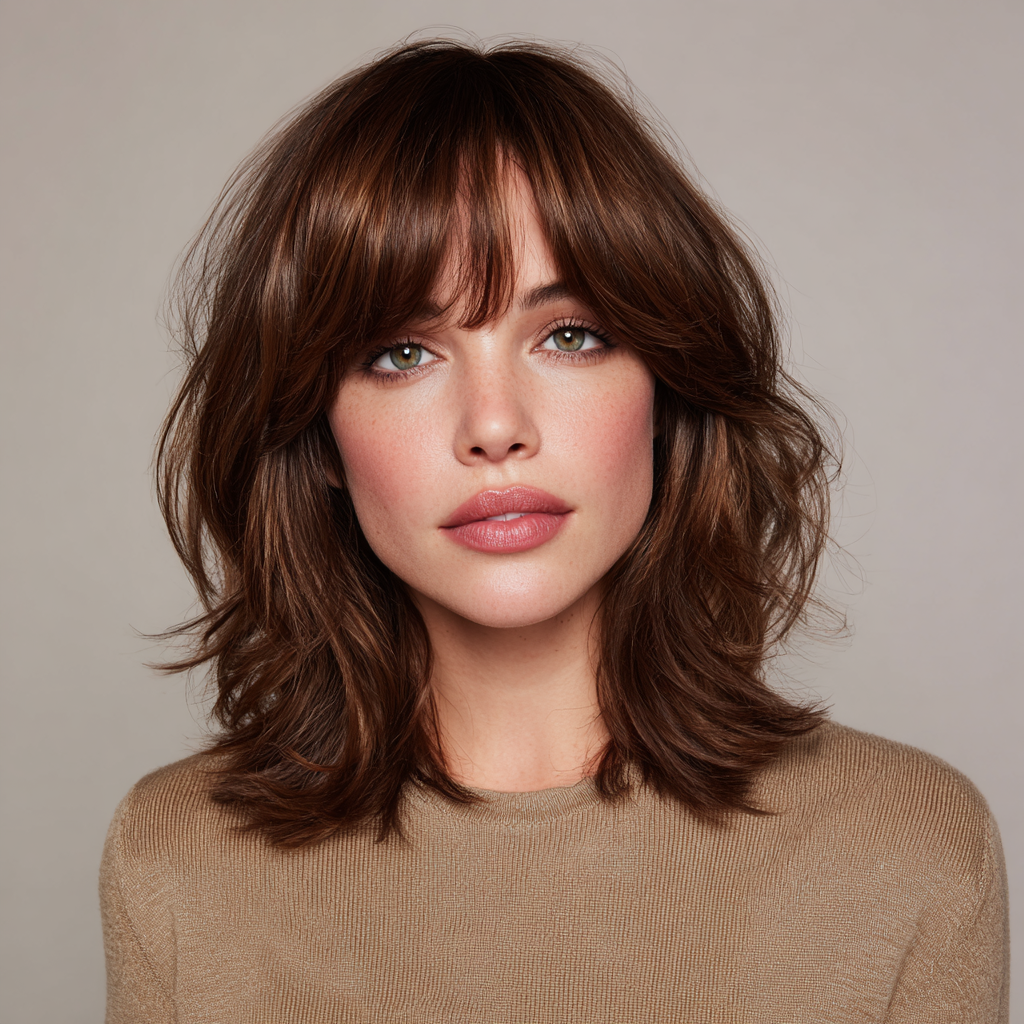 A medium-length wolf cut with bangs combines edgy layers with face-framing fringe. The layers create dynamic texture, while the bangs highlight eyes and cheekbones.