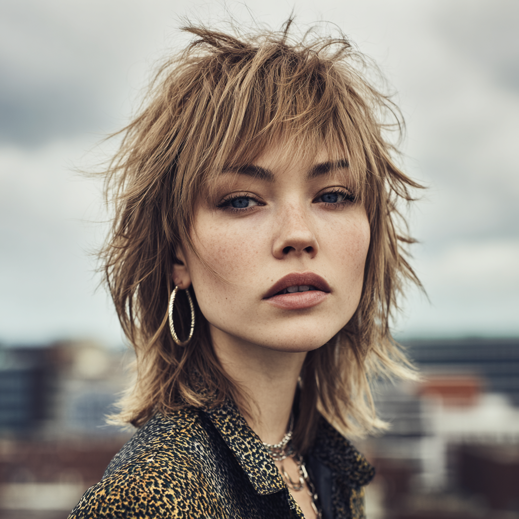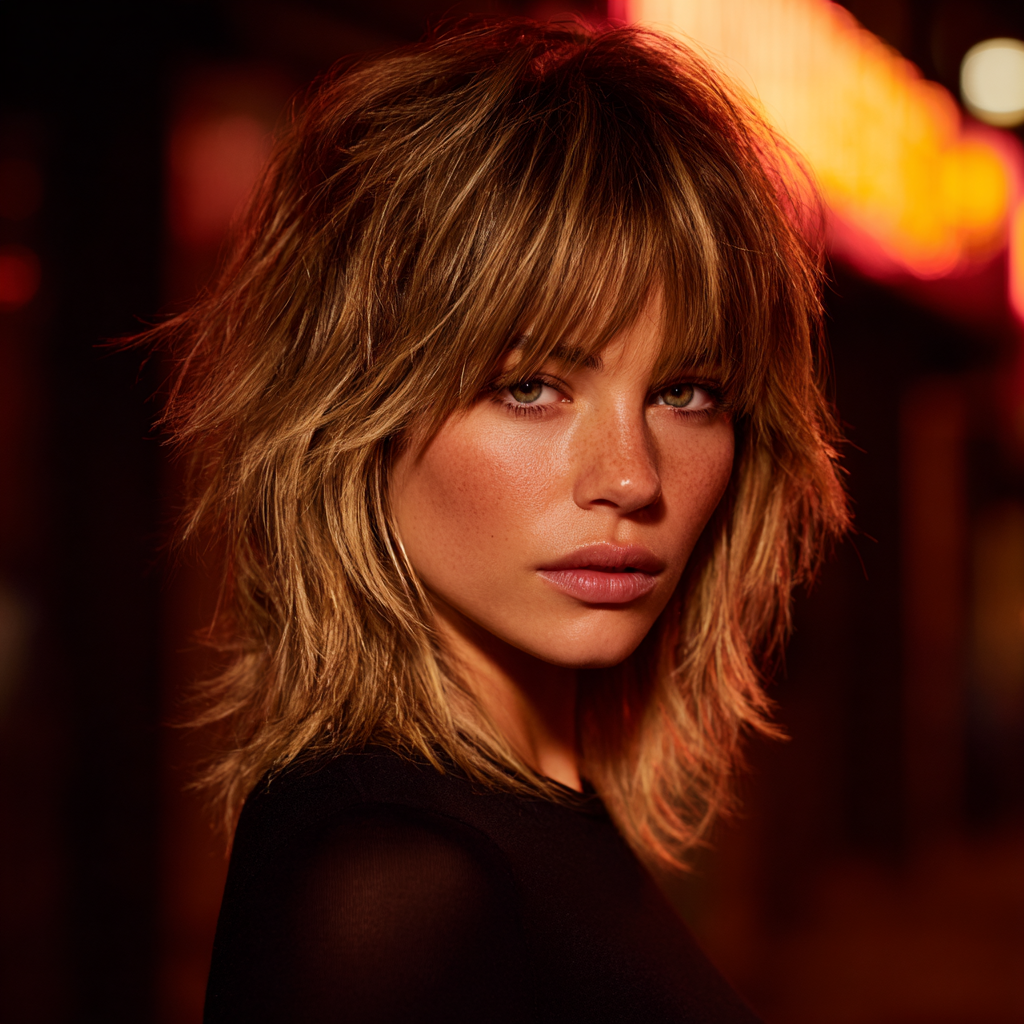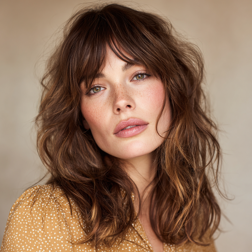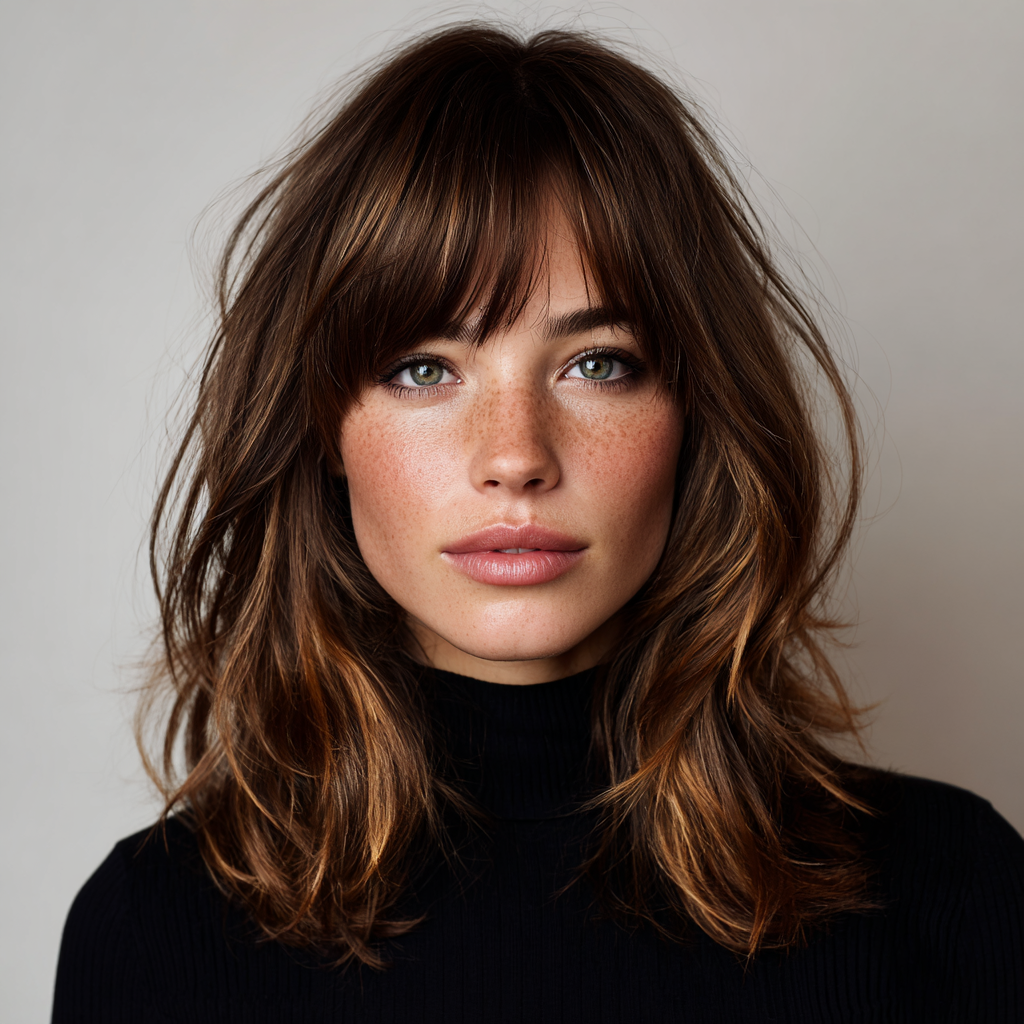 A medium-length wolf cut with bangs combines edgy layers with face-framing fringe. The layers create dynamic texture, while the bangs highlight eyes and cheekbones.