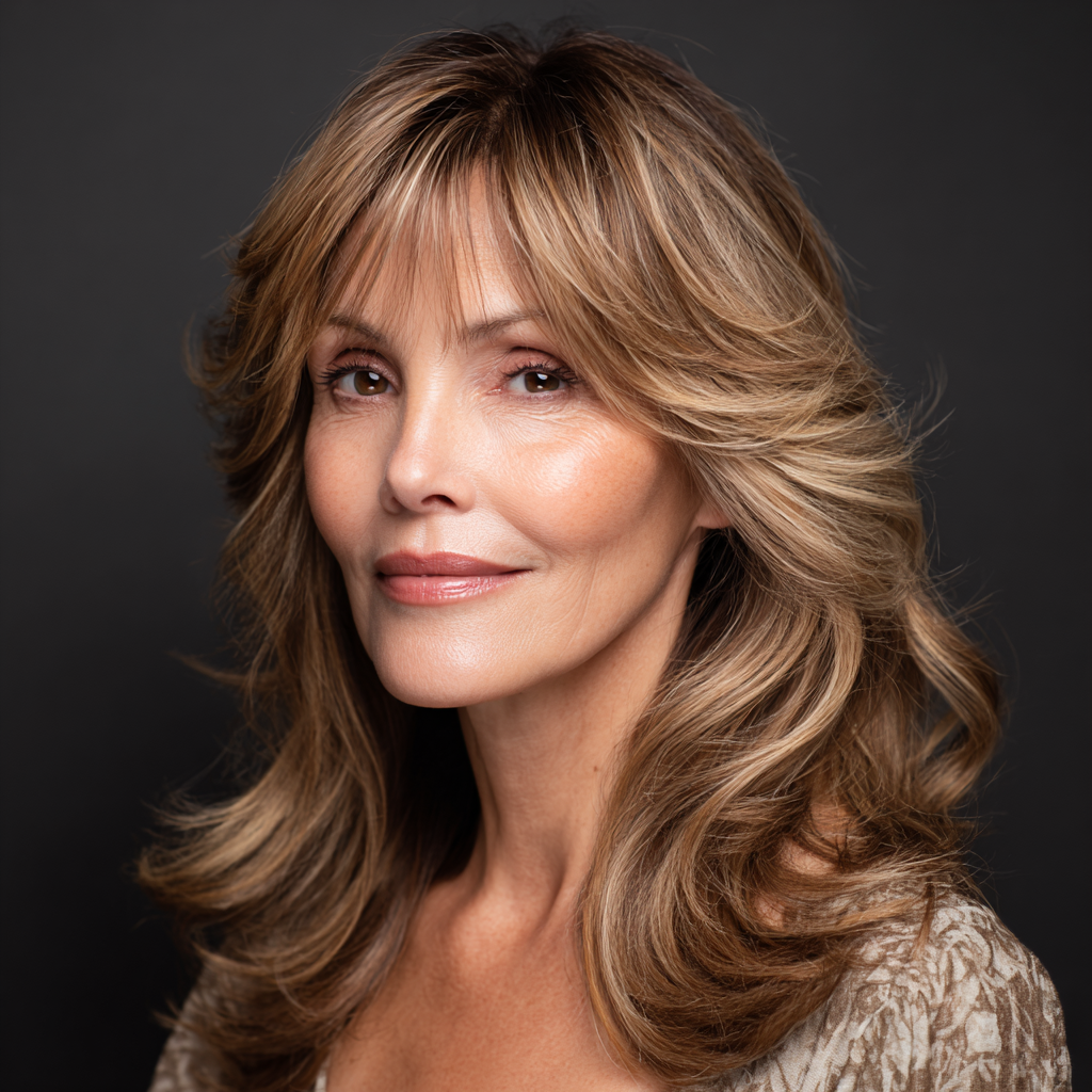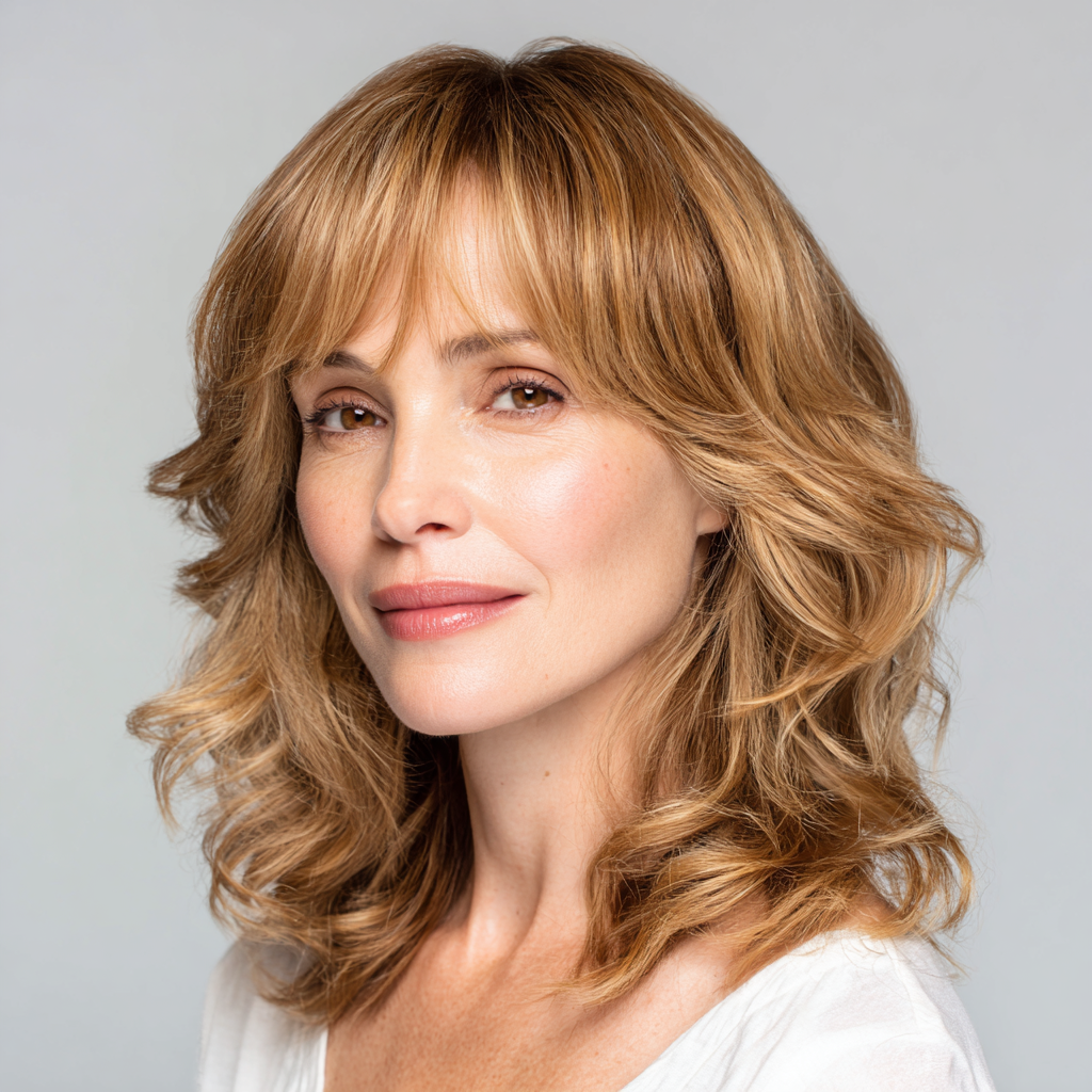 Soft layered medium-length hair with bangs provides a youthful, elegant update for women over 50. The layers add volume while the bangs soften facial features gracefully.