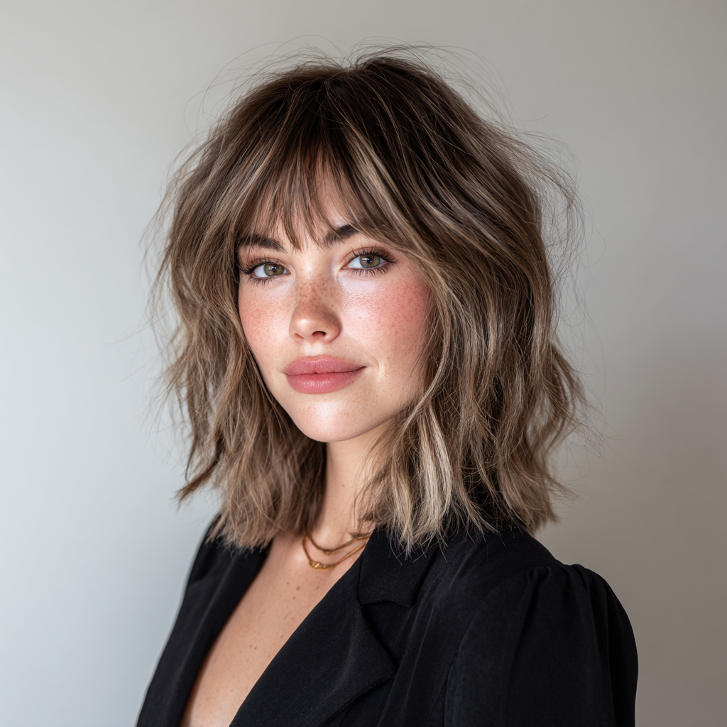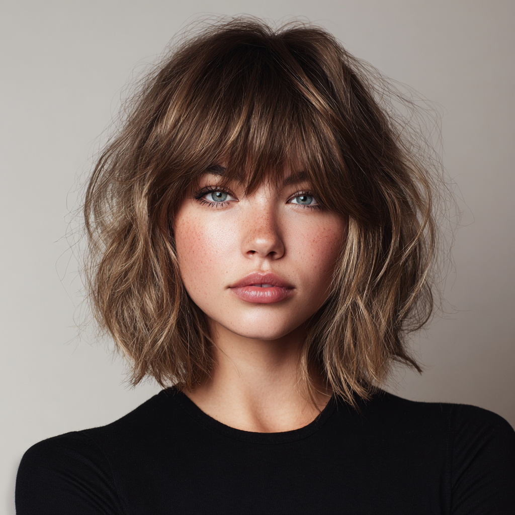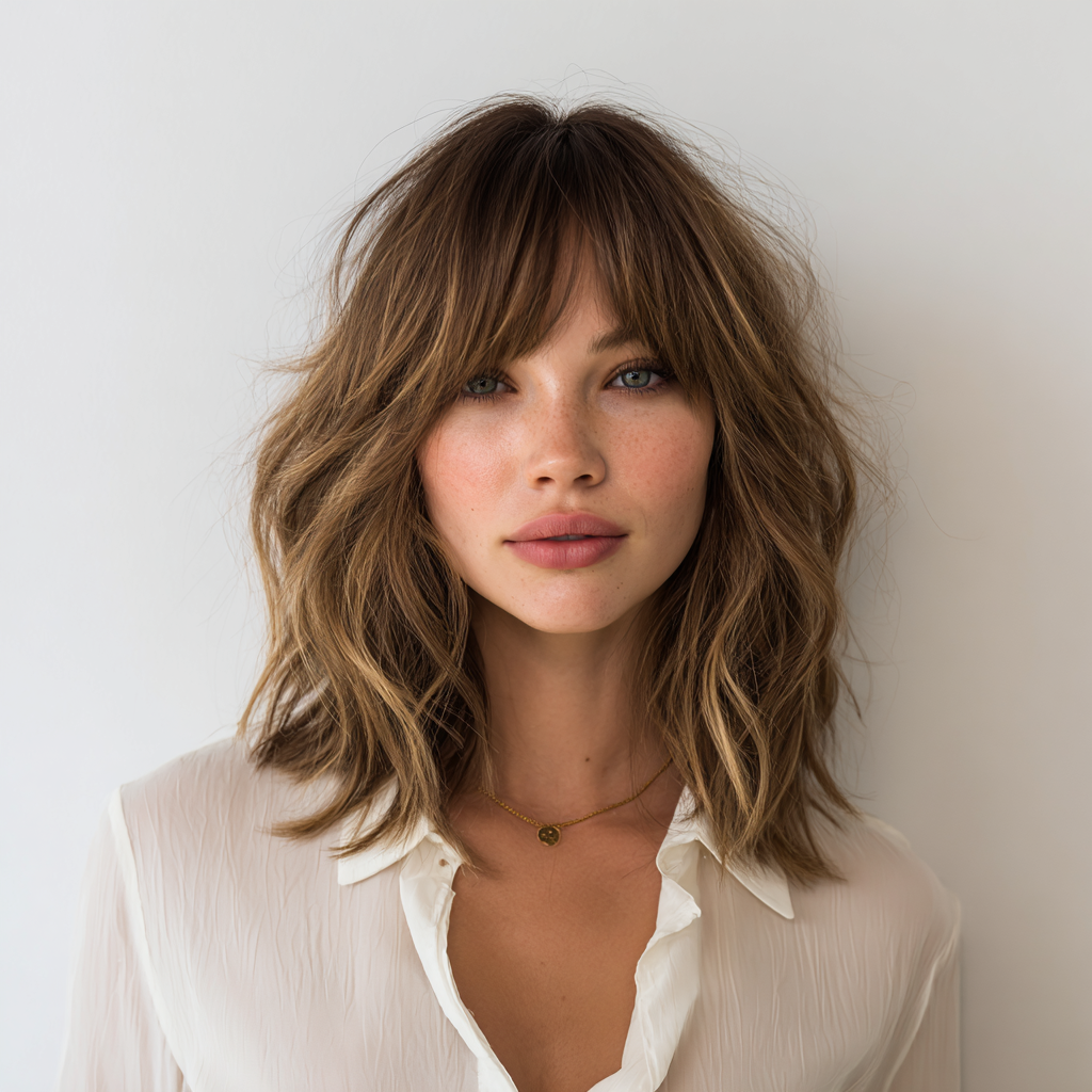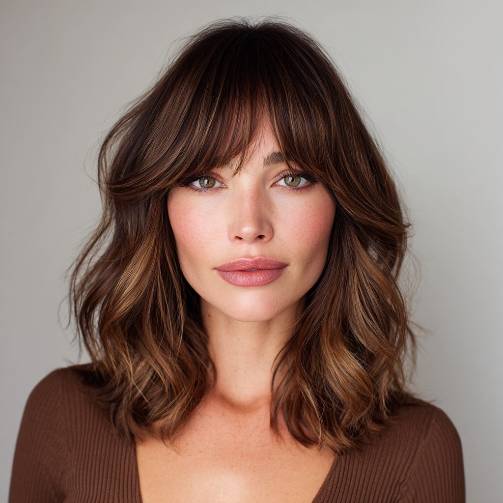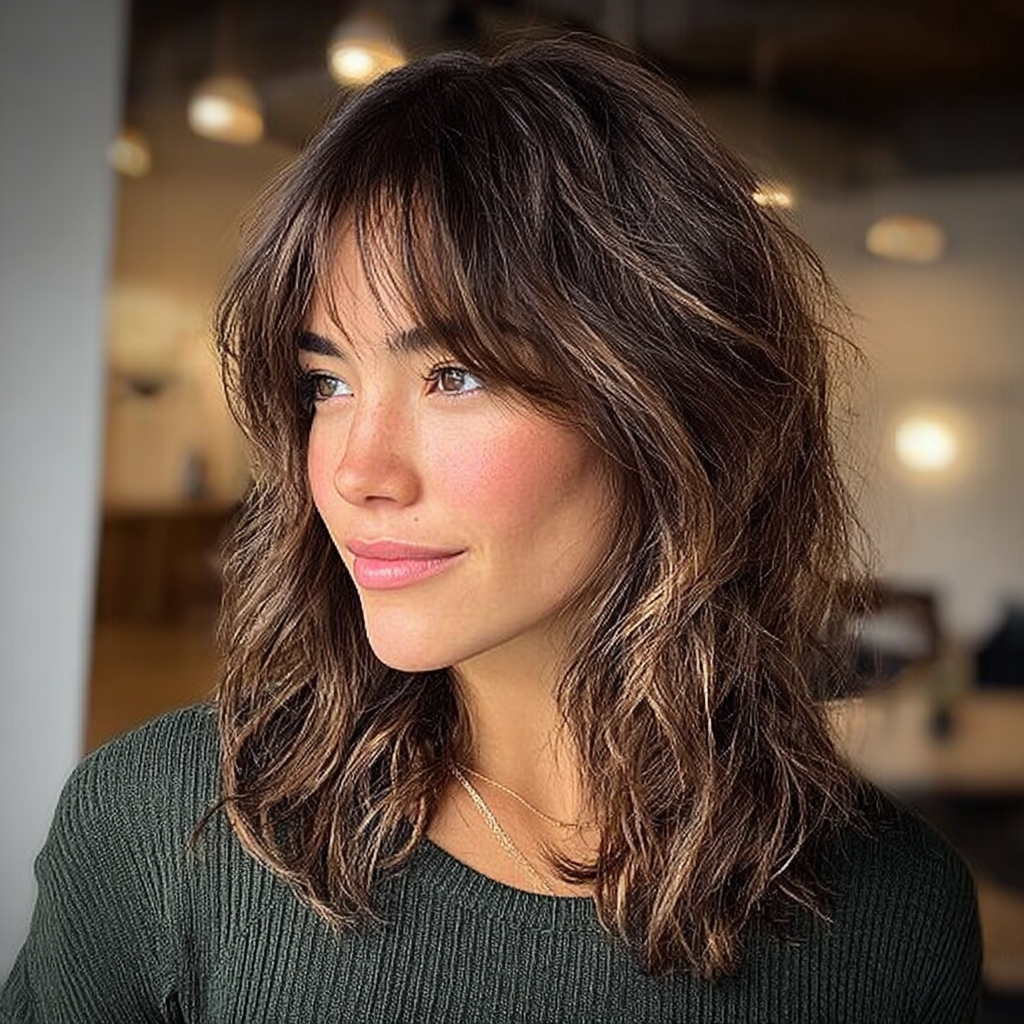 A wavy lob with textured bangs gives medium-length hair a playful, modern edge. The layers and bangs create natural movement and a casual, chic vibe.