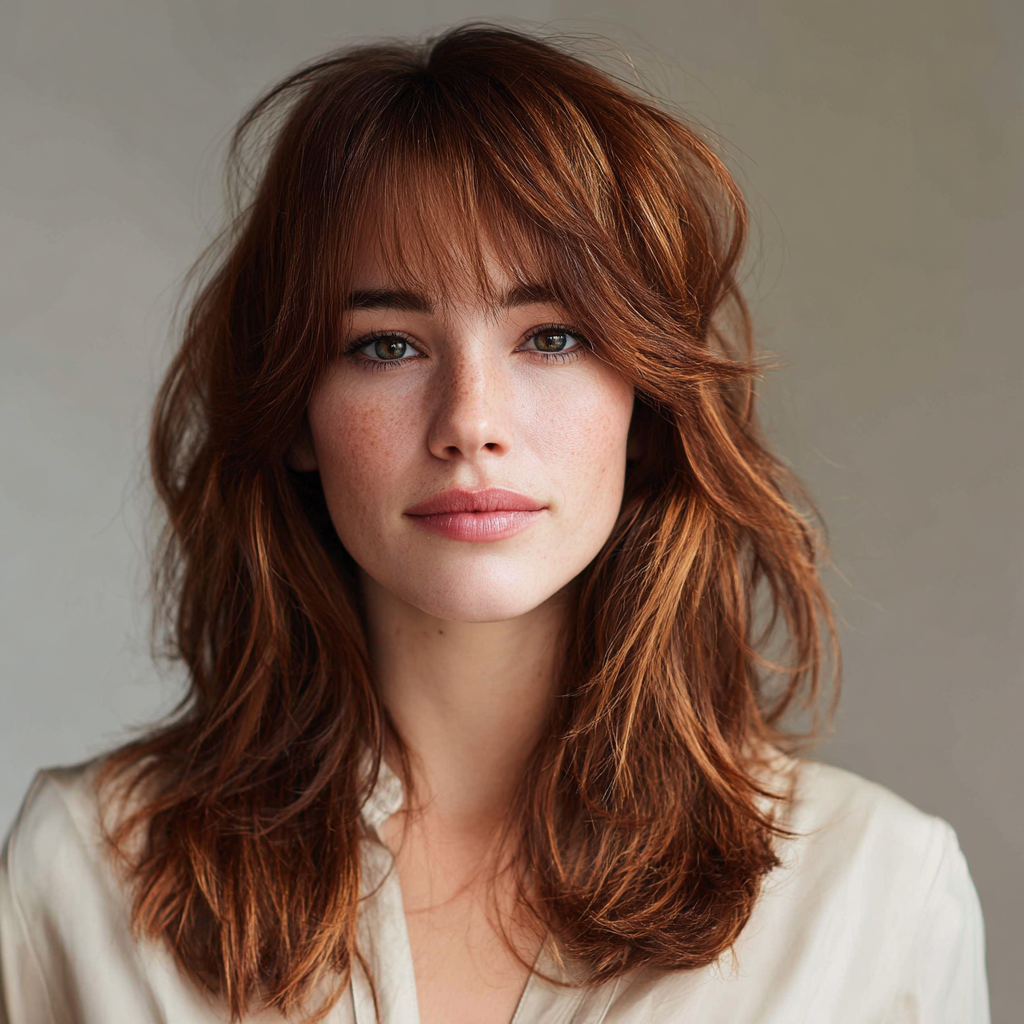 A medium-length shag paired with curtain bangs offers an edgy, modern take on layered hair. The shag layers add texture while the bangs frame the eyes and cheekbones beautifully.