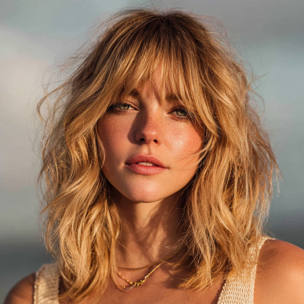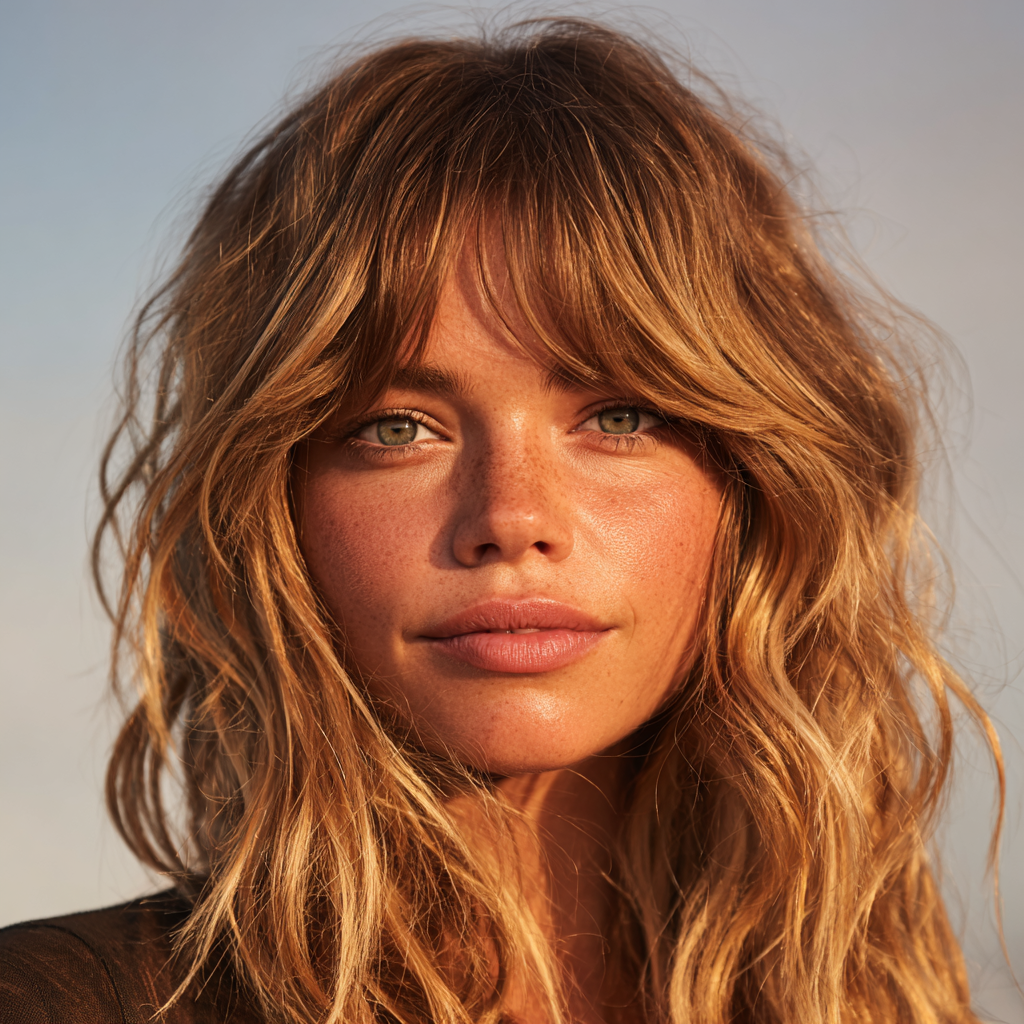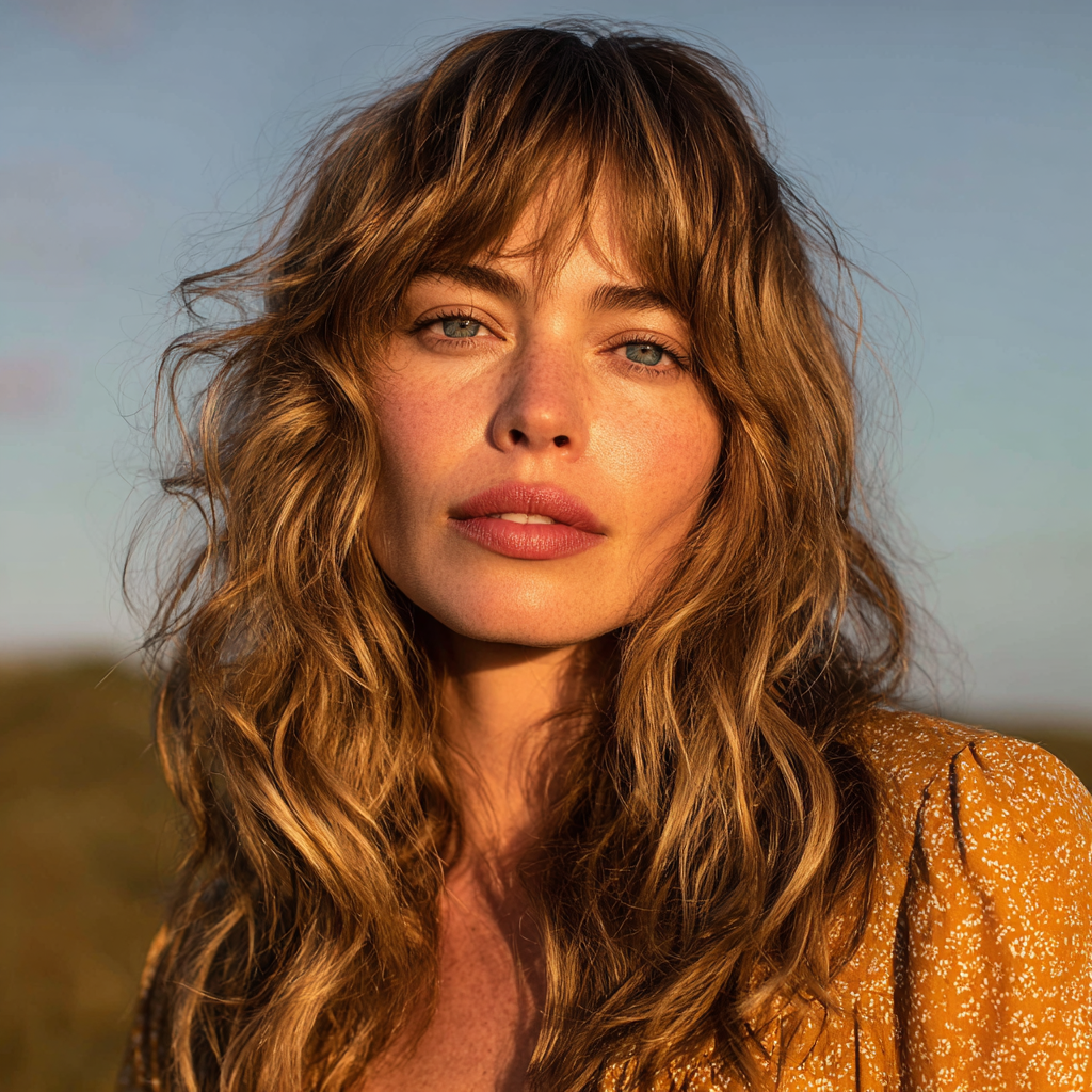 This effortless, sun-kissed look combines tousled beachy waves with soft Bardot-style bangs. It gives that classic “French-girl” vibe that’s both carefree and sensual.