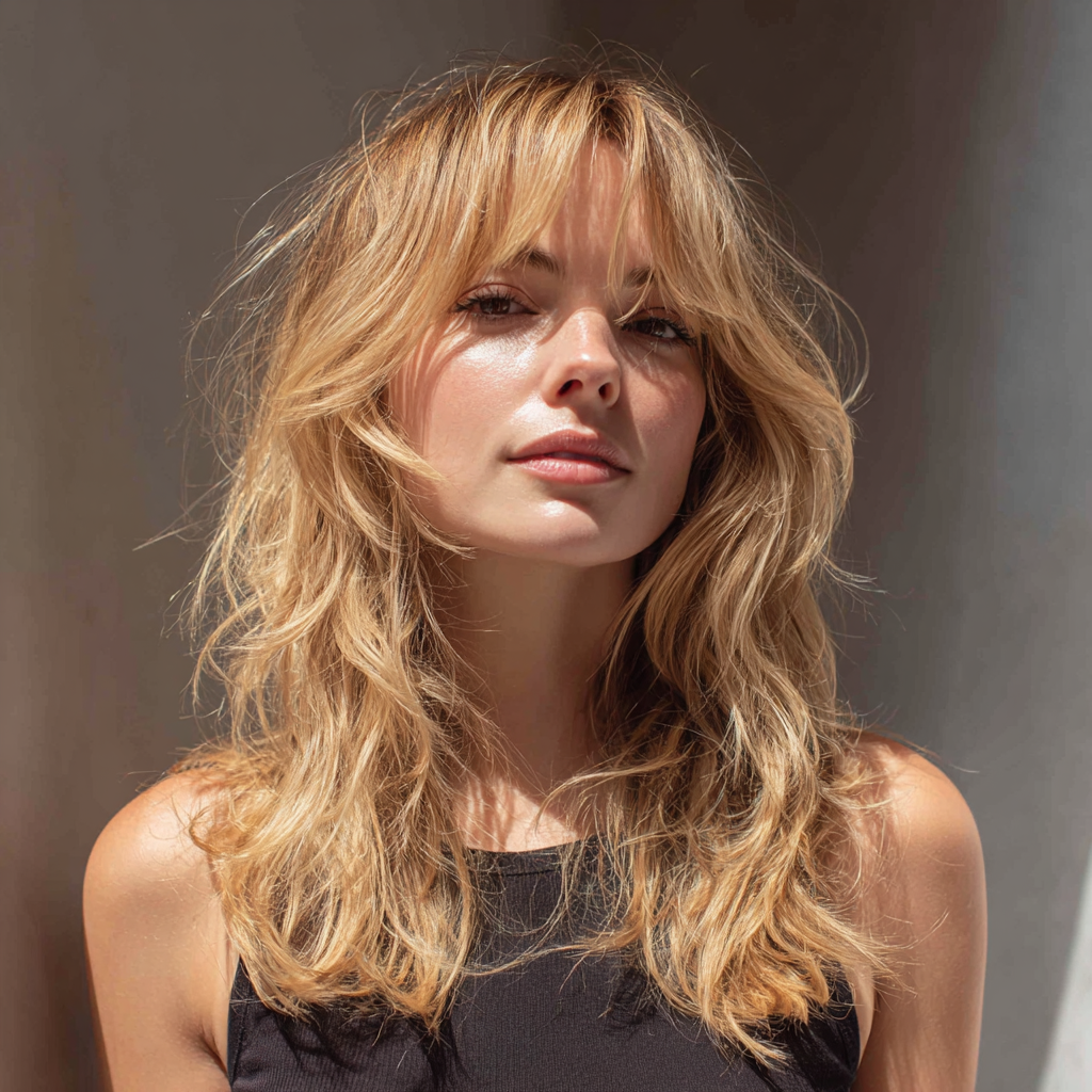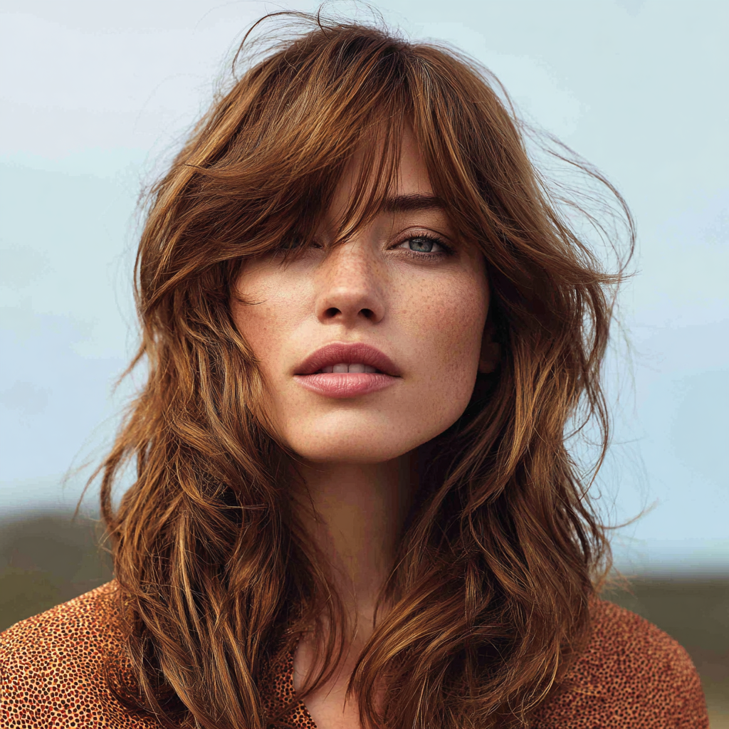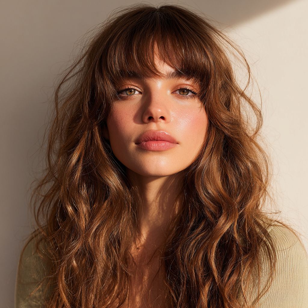 This effortless, sun-kissed look combines tousled beachy waves with soft Bardot-style bangs. It gives that classic “French-girl” vibe that’s both carefree and sensual.