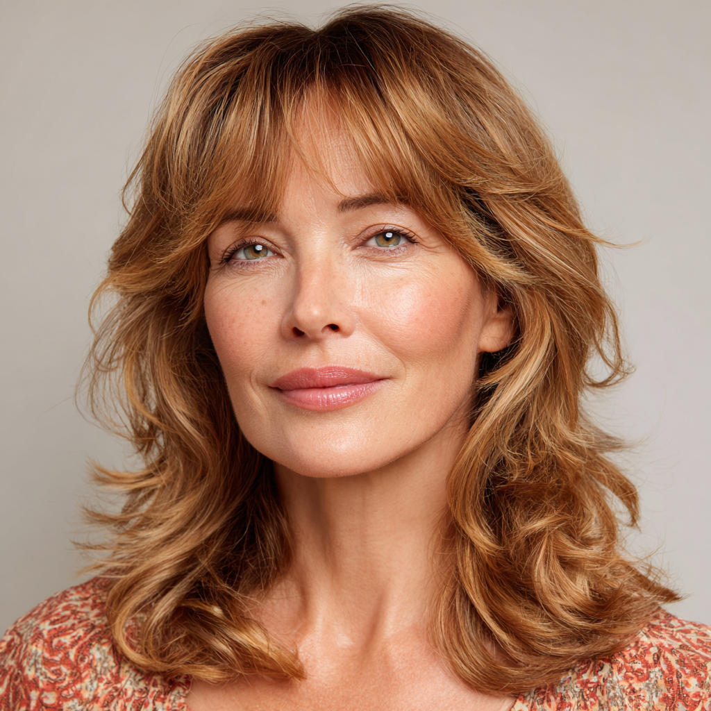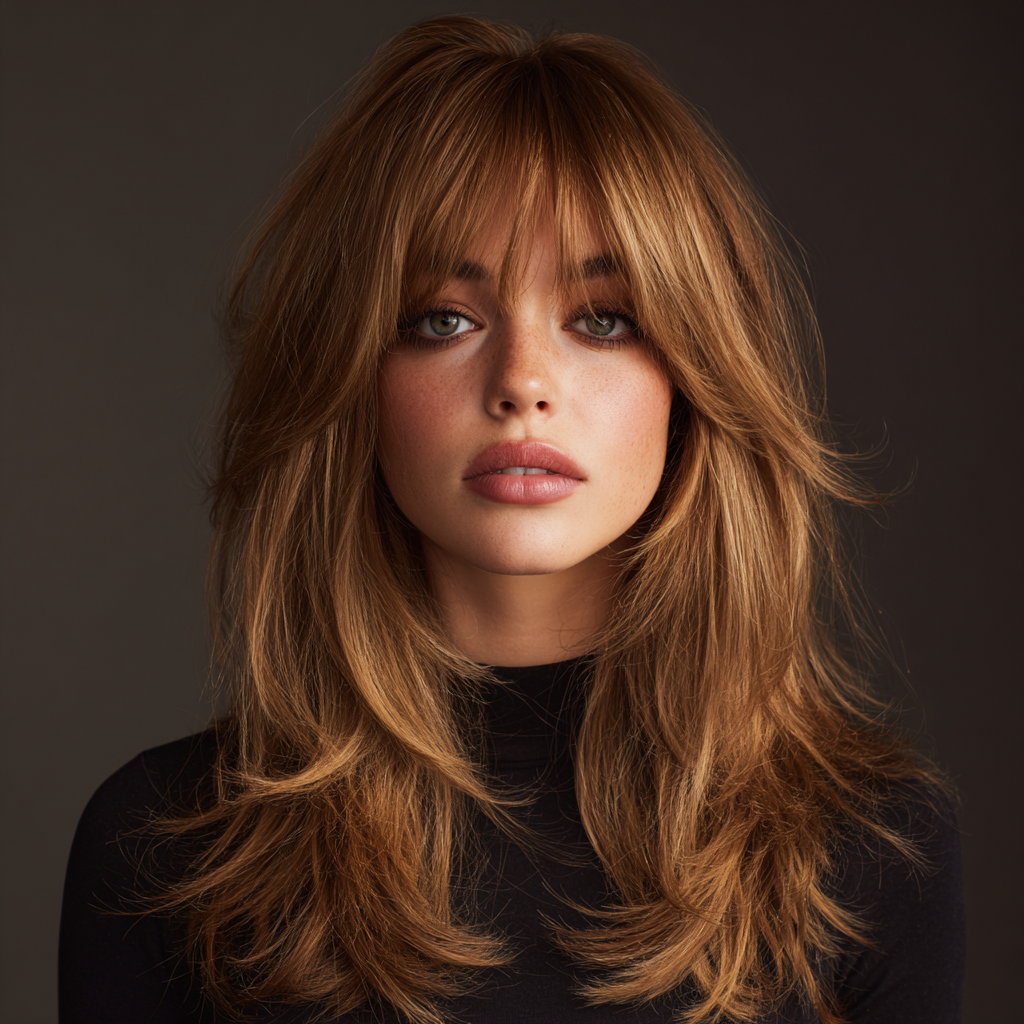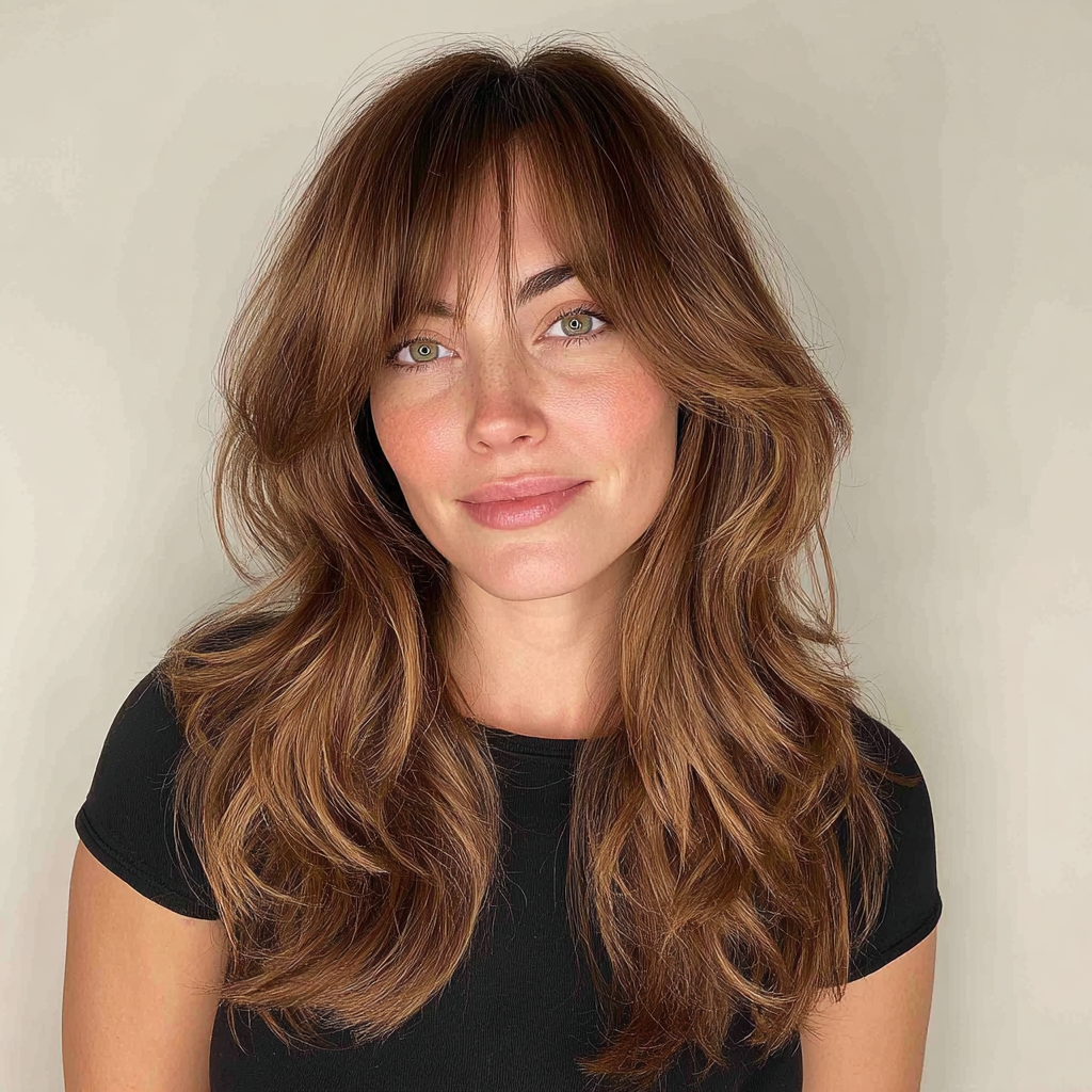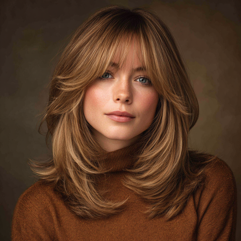 This style works perfectly for anyone who wants volume without heaviness. The curtain bangs add that subtle 70s-inspired charm.