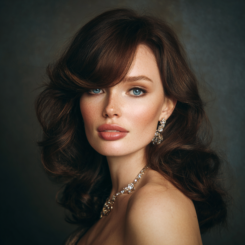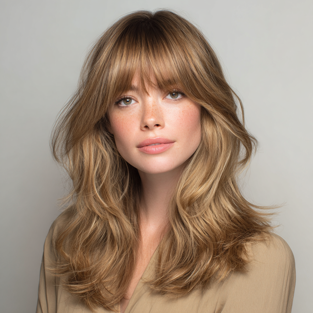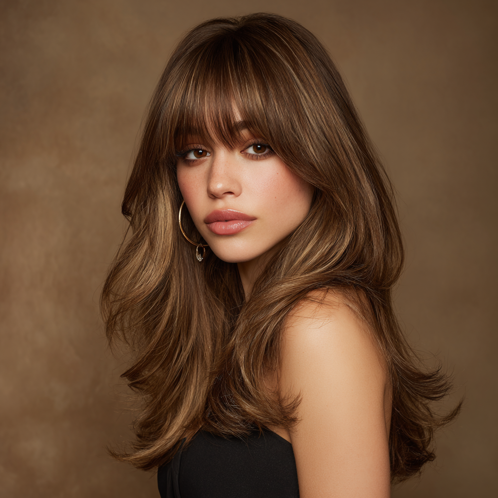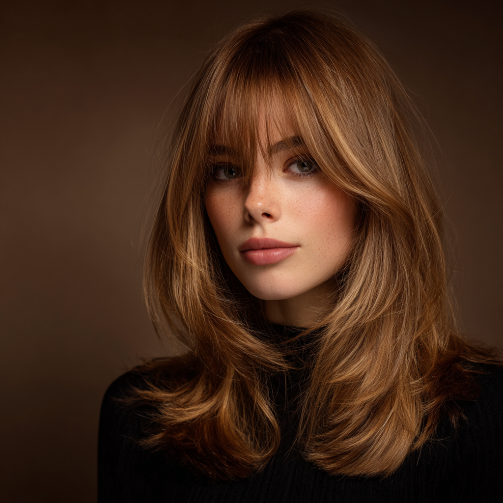 This style works perfectly for anyone who wants volume without heaviness. The curtain bangs add that subtle 70s-inspired charm.