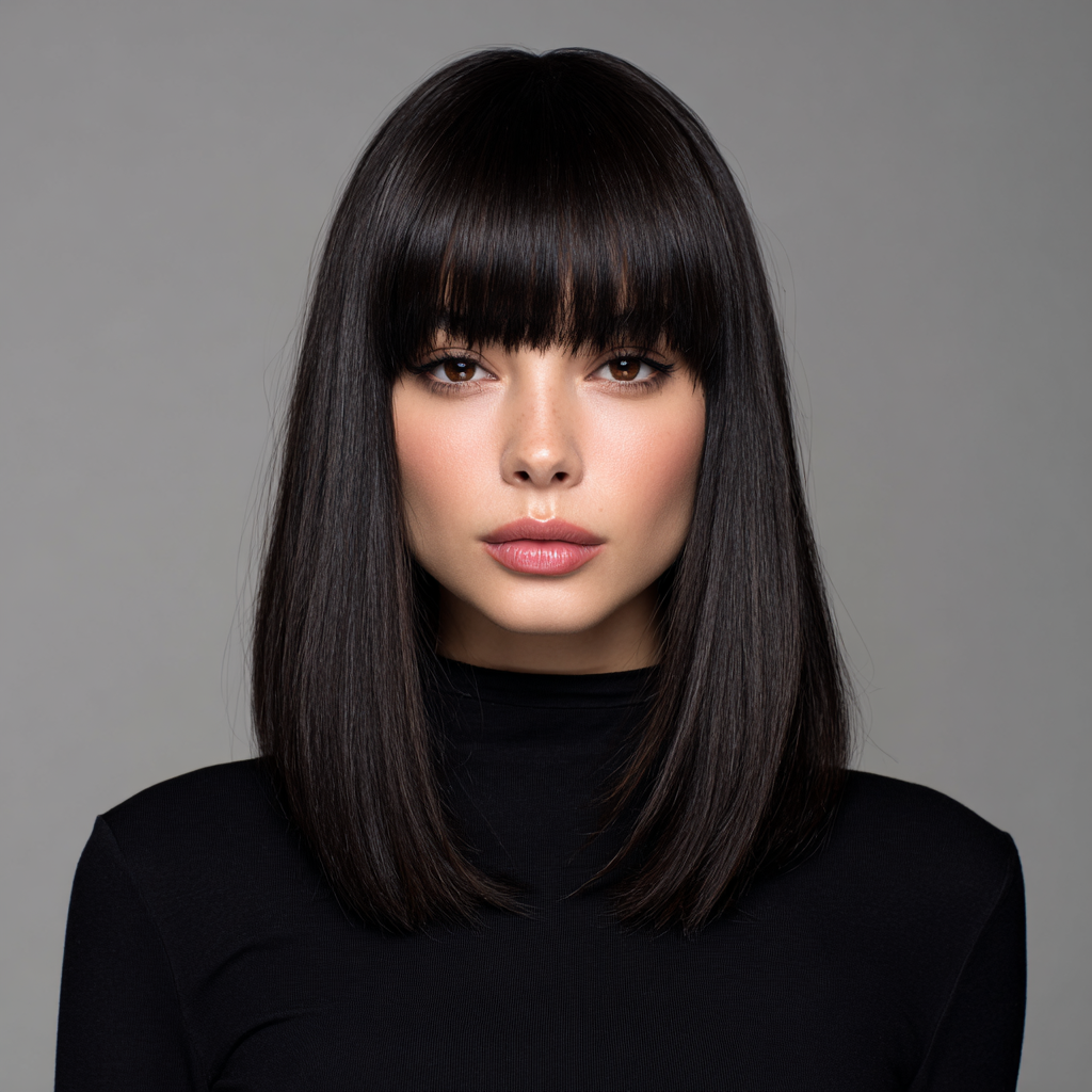 This bold and chic hairstyle blends structure with simplicity. The blunt bangs highlight your eyes, while the medium bob length gives a balanced, face-framing effect.