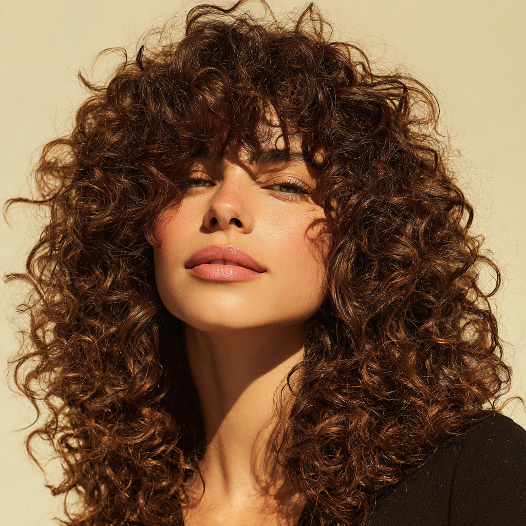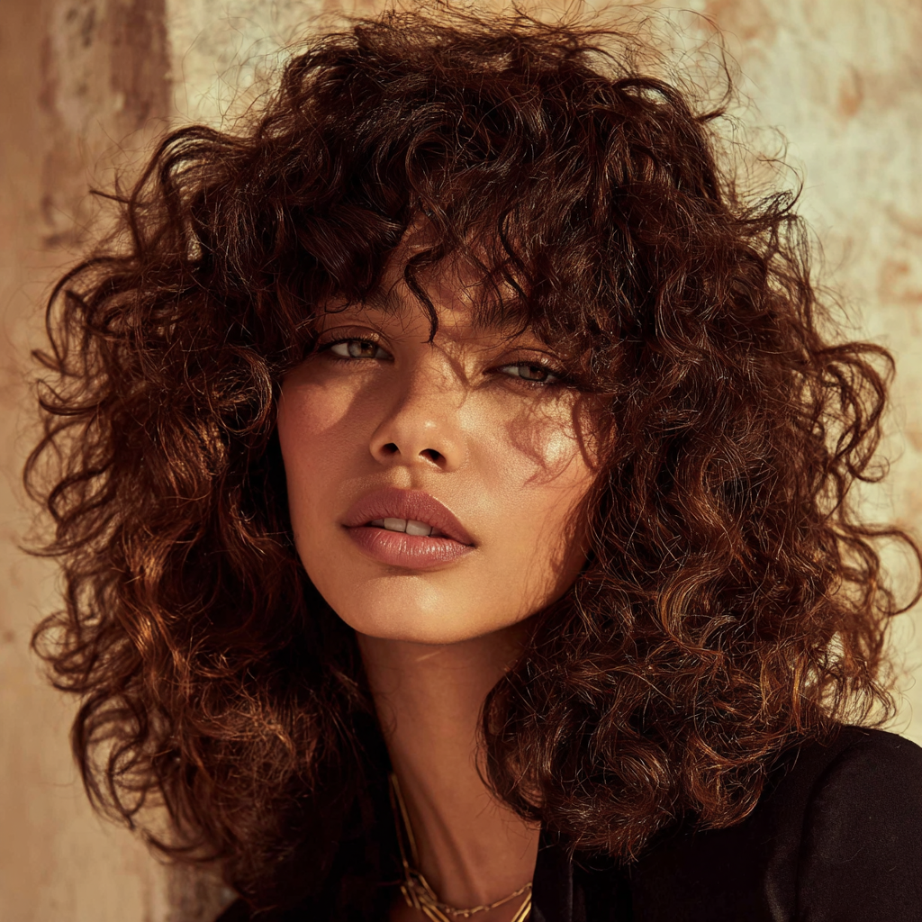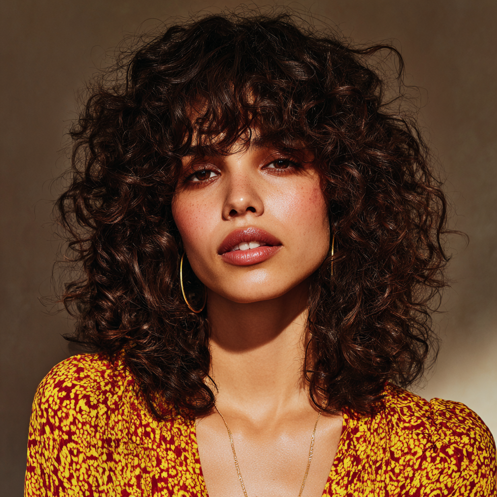 Curly medium-length hair with bangs gives a playful and full-bodied look. The bangs blend naturally into the curls, creating texture and definition while keeping hair manageable.